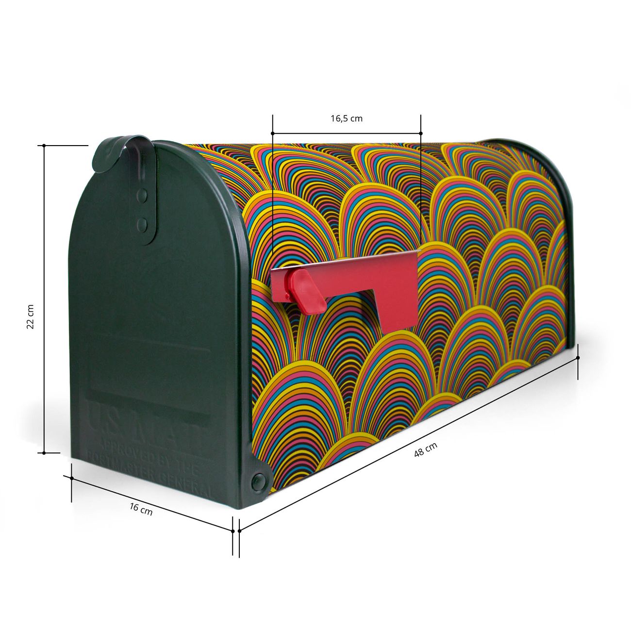 Der amerikanische Briefkasten von banjado mit Regenbögen Motiv bietet Ihnen ausreichend Fassungsvermögen, um große A4 Sendungen und Zeitschriften zu empfangen. Die typisch amerikanische rote Fahne zeigt Ihnen an, wenn Sie Post erhalten haben. Die US-Mailbox besteht aus verzinktem Stahlblech welches lackiert wurde und ist 48 x 22 x 16 CM (BxHxT) groß. Die Folie mit Motiv Regenbögen besteht aus einer wetter- und UV-resistenten Folie, die mit einem Schutzlaminat überzogen ist, sodass die US Mailbox zusätzlich vor Kratzern geschützt ist. An der Unterkante sind 4 Löcher je Seite um die Mailbox, typisch amerikanisch, an einem Holzpfahl oder einem Zaun zu befestigen. Auf Wunsch können Sie bei uns den passenden Standfuß oder die passende Wandhalterung kaufen um die US-Mailbox sicher zu befestigen. Wir bieten Ihnen ebenfalls Namensschilder, bereits beschriftet oder frei zu beschriften, und verschiedene selbst gestaltete Bitte-Keine-Werbung-Aufkleber.