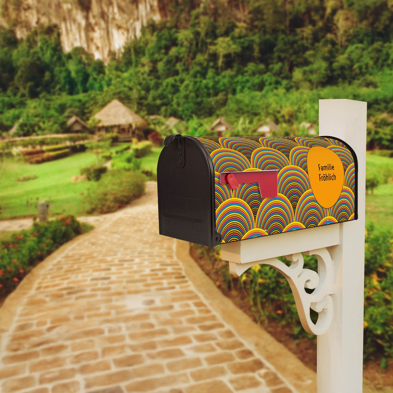 Der amerikanische Briefkasten von banjado mit Regenbögen Motiv bietet Ihnen ausreichend Fassungsvermögen, um große A4 Sendungen und Zeitschriften zu empfangen. Die typisch amerikanische rote Fahne zeigt Ihnen an, wenn Sie Post erhalten haben. Die US-Mailbox besteht aus verzinktem Stahlblech welches lackiert wurde und ist 48 x 22 x 16 CM (BxHxT) groß. Die Folie mit Motiv Regenbögen besteht aus einer wetter- und UV-resistenten Folie, die mit einem Schutzlaminat überzogen ist, sodass die US Mailbox zusätzlich vor Kratzern geschützt ist. An der Unterkante sind 4 Löcher je Seite um die Mailbox, typisch amerikanisch, an einem Holzpfahl oder einem Zaun zu befestigen. Auf Wunsch können Sie bei uns den passenden Standfuß oder die passende Wandhalterung kaufen um die US-Mailbox sicher zu befestigen. Wir bieten Ihnen ebenfalls Namensschilder, bereits beschriftet oder frei zu beschriften, und verschiedene selbst gestaltete Bitte-Keine-Werbung-Aufkleber.