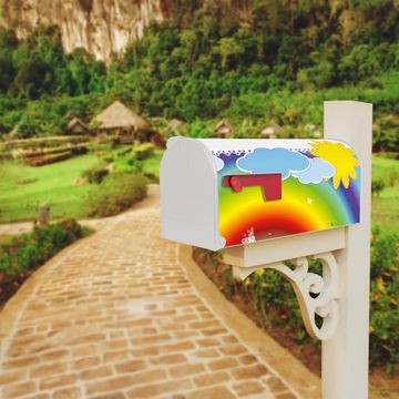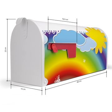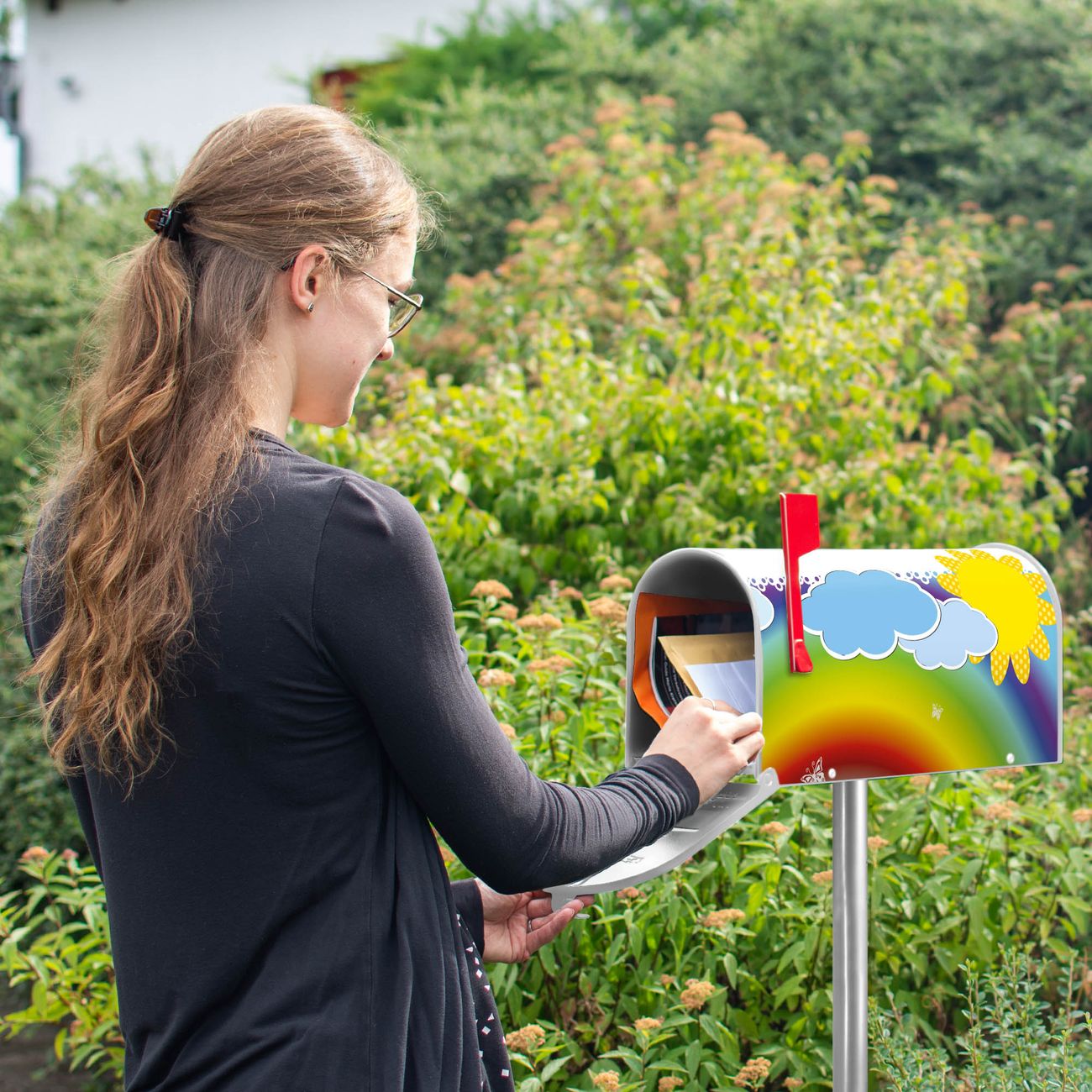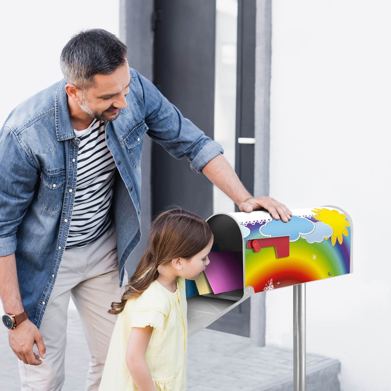 Der amerikanische Briefkasten von banjado mit Regenbogen Motiv bietet Ihnen ausreichend Fassungsvermögen, um große A4 Sendungen und Zeitschriften zu empfangen. Die typisch amerikanische rote Fahne zeigt Ihnen an, wenn Sie Post erhalten haben. Die US-Mailbox besteht aus verzinktem Stahlblech welches lackiert wurde und ist 48 x 22 x 16 CM (BxHxT) groß. Die Folie mit Motiv Regenbogen besteht aus einer wetter- und UV-resistenten Folie, die mit einem Schutzlaminat überzogen ist, sodass die US Mailbox zusätzlich vor Kratzern geschützt ist. An der Unterkante sind 4 Löcher je Seite um die Mailbox, typisch amerikanisch, an einem Holzpfahl oder einem Zaun zu befestigen. Auf Wunsch können Sie bei uns den passenden Standfuß oder die passende Wandhalterung kaufen um die US-Mailbox sicher zu befestigen. Wir bieten Ihnen ebenfalls Namensschilder, bereits beschriftet oder frei zu beschriften, und verschiedene selbst gestaltete Bitte-Keine-Werbung-Aufkleber.