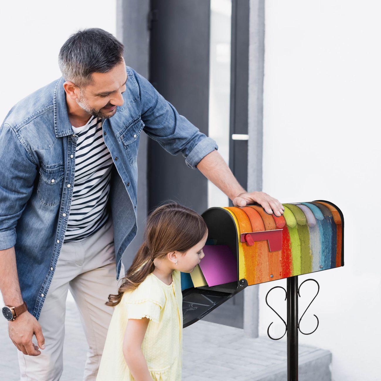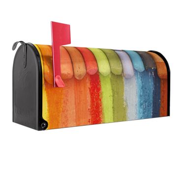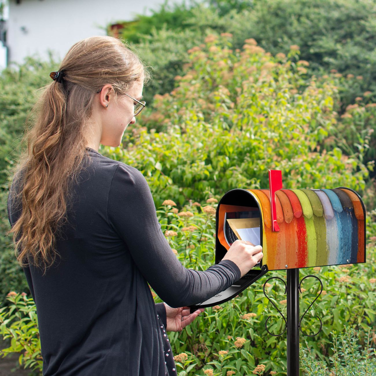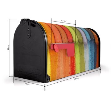 Der amerikanische Briefkasten von banjado mit Regenbogenkreide Motiv bietet Ihnen ausreichend Fassungsvermögen, um große A4 Sendungen und Zeitschriften zu empfangen. Die typisch amerikanische rote Fahne zeigt Ihnen an, wenn Sie Post erhalten haben. Die US-Mailbox besteht aus verzinktem Stahlblech welches lackiert wurde und ist 48 x 22 x 16 CM (BxHxT) groß. Die Folie mit Motiv Regenbogenkreide besteht aus einer wetter- und UV-resistenten Folie, die mit einem Schutzlaminat überzogen ist, sodass die US Mailbox zusätzlich vor Kratzern geschützt ist. An der Unterkante sind 4 Löcher je Seite um die Mailbox, typisch amerikanisch, an einem Holzpfahl oder einem Zaun zu befestigen. Auf Wunsch können Sie bei uns den passenden Standfuß oder die passende Wandhalterung kaufen um die US-Mailbox sicher zu befestigen. Wir bieten Ihnen ebenfalls Namensschilder, bereits beschriftet oder frei zu beschriften, und verschiedene selbst gestaltete Bitte-Keine-Werbung-Aufkleber.