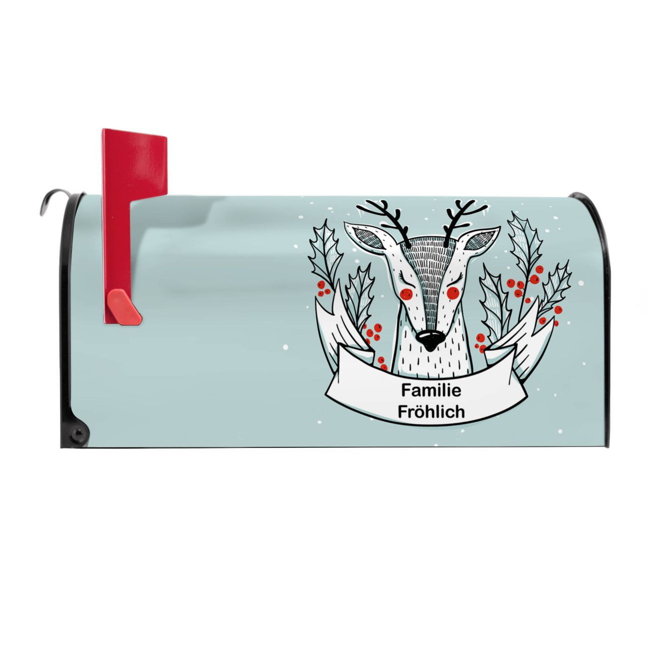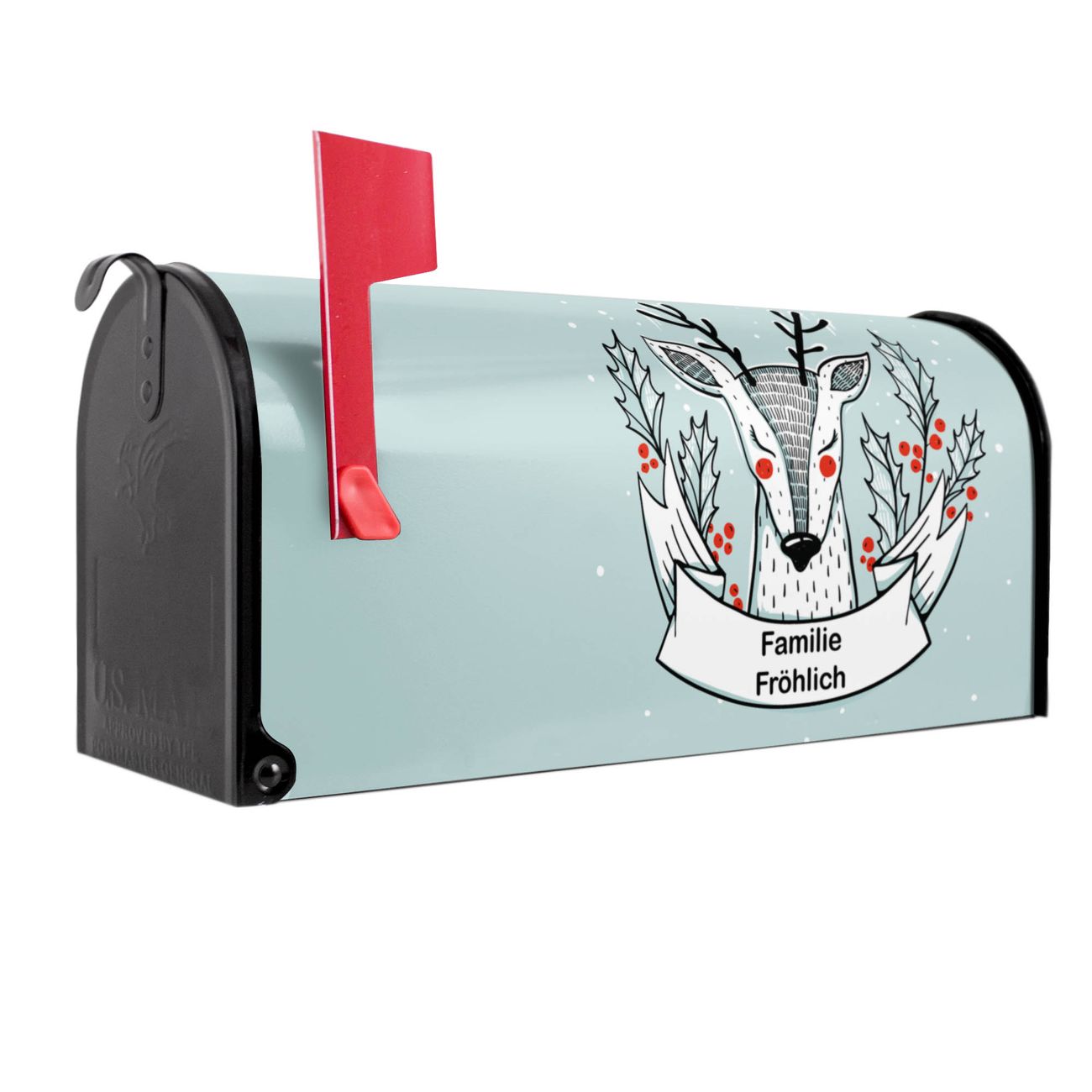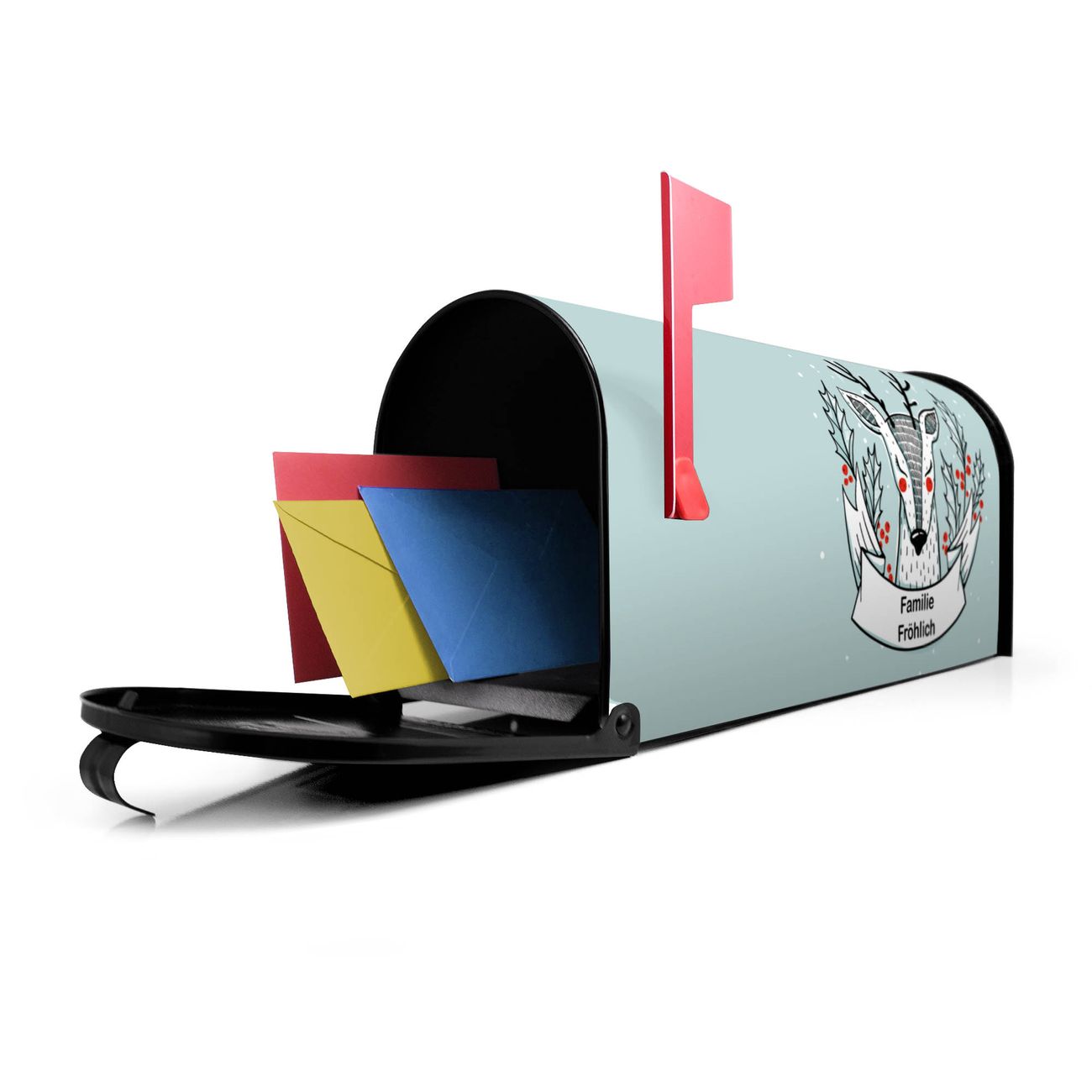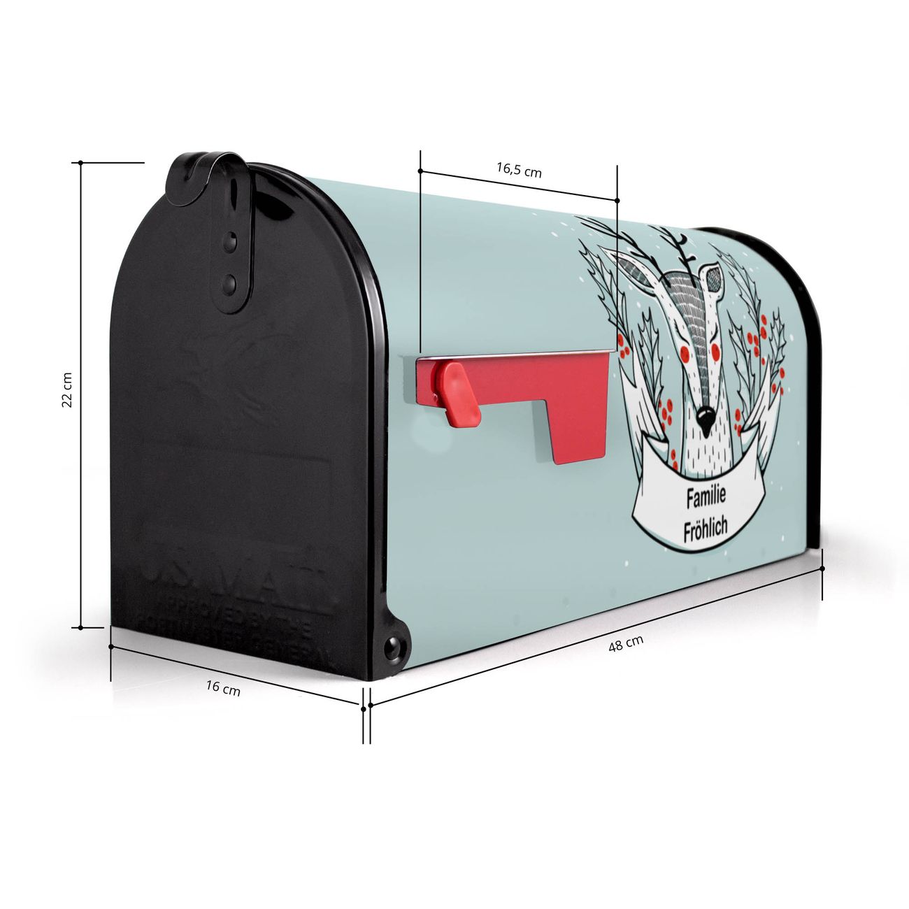 Der amerikanische Briefkasten von banjado mit Rentier Motiv bietet Ihnen ausreichend Fassungsvermögen, um große A4 Sendungen und Zeitschriften zu empfangen. Die typisch amerikanische rote Fahne zeigt Ihnen an, wenn Sie Post erhalten haben. Die US-Mailbox besteht aus verzinktem Stahlblech welches lackiert wurde und ist 48 x 22 x 16 CM (BxHxT) groß. Die Folie mit Motiv Rentier besteht aus einer wetter- und UV-resistenten Folie, die mit einem Schutzlaminat überzogen ist, sodass die US Mailbox zusätzlich vor Kratzern geschützt ist. An der Unterkante sind 4 Löcher je Seite um die Mailbox, typisch amerikanisch, an einem Holzpfahl oder einem Zaun zu befestigen. Auf Wunsch können Sie bei uns den passenden Standfuß oder die passende Wandhalterung kaufen um die US-Mailbox sicher zu befestigen. Wir bieten Ihnen ebenfalls Namensschilder, bereits beschriftet oder frei zu beschriften, und verschiedene selbst gestaltete Bitte-Keine-Werbung-Aufkleber.