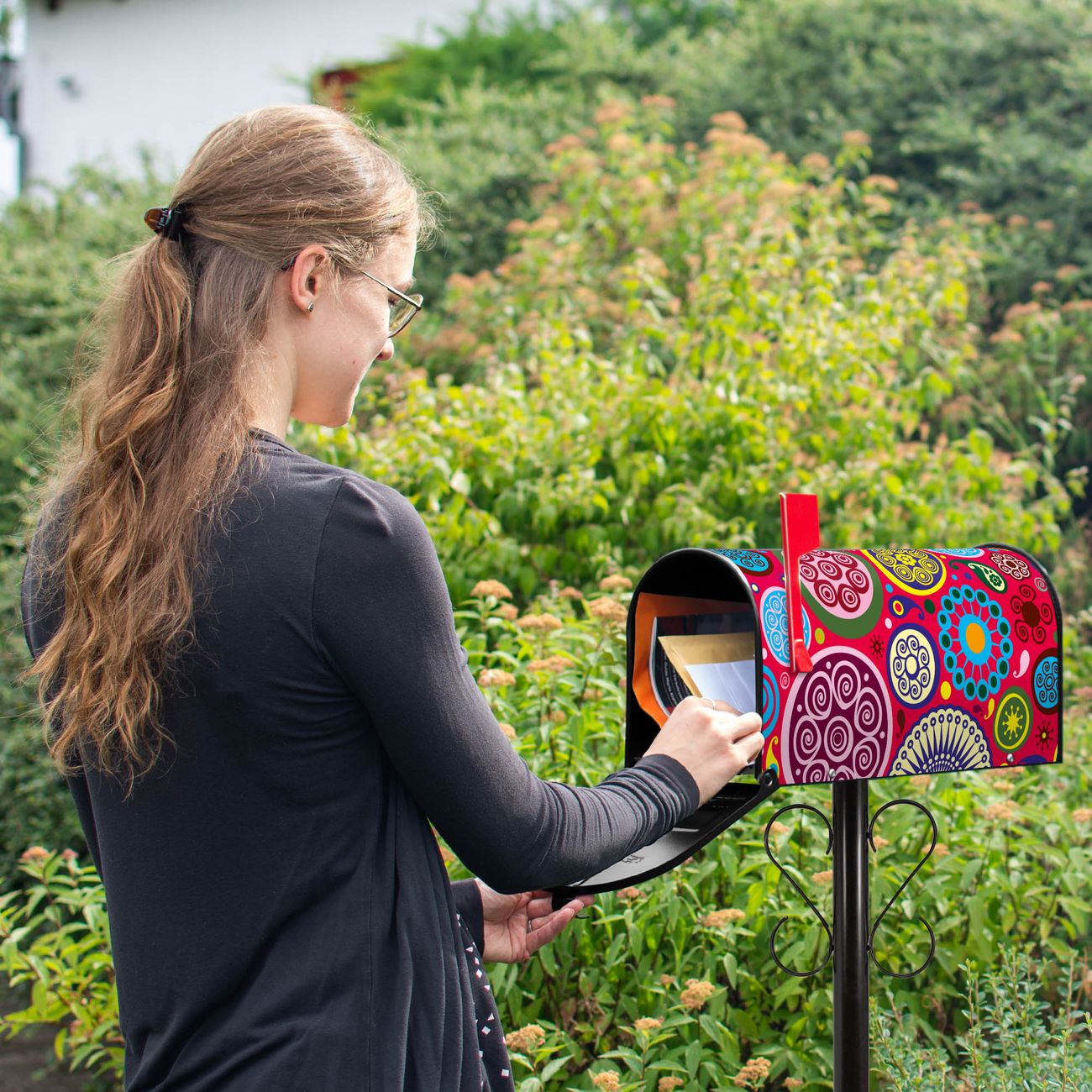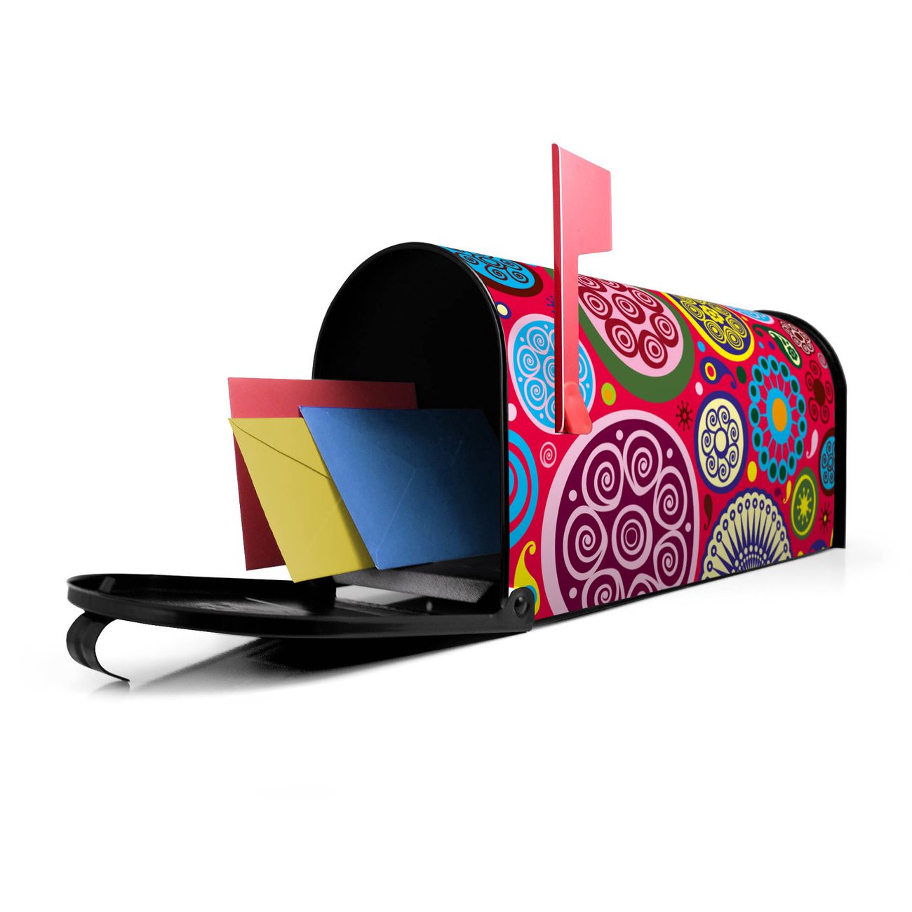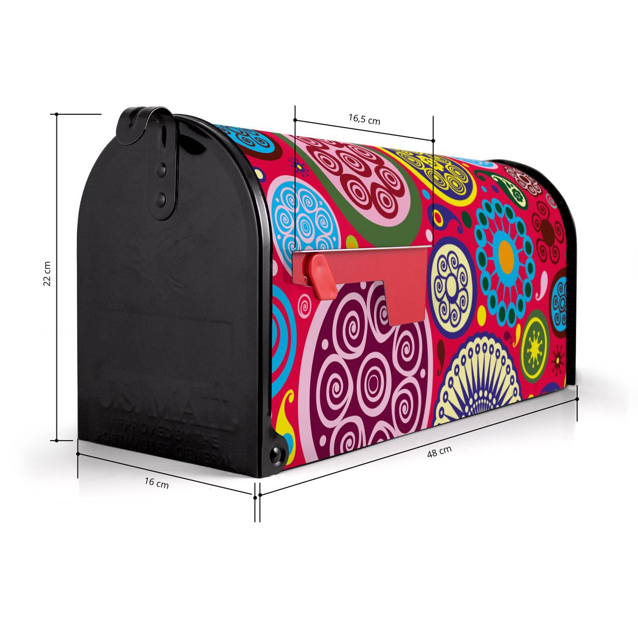 Der amerikanische Briefkasten von banjado mit Retro Kreise Motiv bietet Ihnen ausreichend Fassungsvermögen, um große A4 Sendungen und Zeitschriften zu empfangen. Die typisch amerikanische rote Fahne zeigt Ihnen an, wenn Sie Post erhalten haben. Die US-Mailbox besteht aus verzinktem Stahlblech welches lackiert wurde und ist 48 x 22 x 16 CM (BxHxT) groß. Die Folie mit Motiv Retro Kreise besteht aus einer wetter- und UV-resistenten Folie, die mit einem Schutzlaminat überzogen ist, sodass die US Mailbox zusätzlich vor Kratzern geschützt ist. An der Unterkante sind 4 Löcher je Seite um die Mailbox, typisch amerikanisch, an einem Holzpfahl oder einem Zaun zu befestigen. Auf Wunsch können Sie bei uns den passenden Standfuß oder die passende Wandhalterung kaufen um die US-Mailbox sicher zu befestigen. Wir bieten Ihnen ebenfalls Namensschilder, bereits beschriftet oder frei zu beschriften, und verschiedene selbst gestaltete Bitte-Keine-Werbung-Aufkleber.