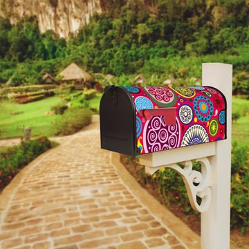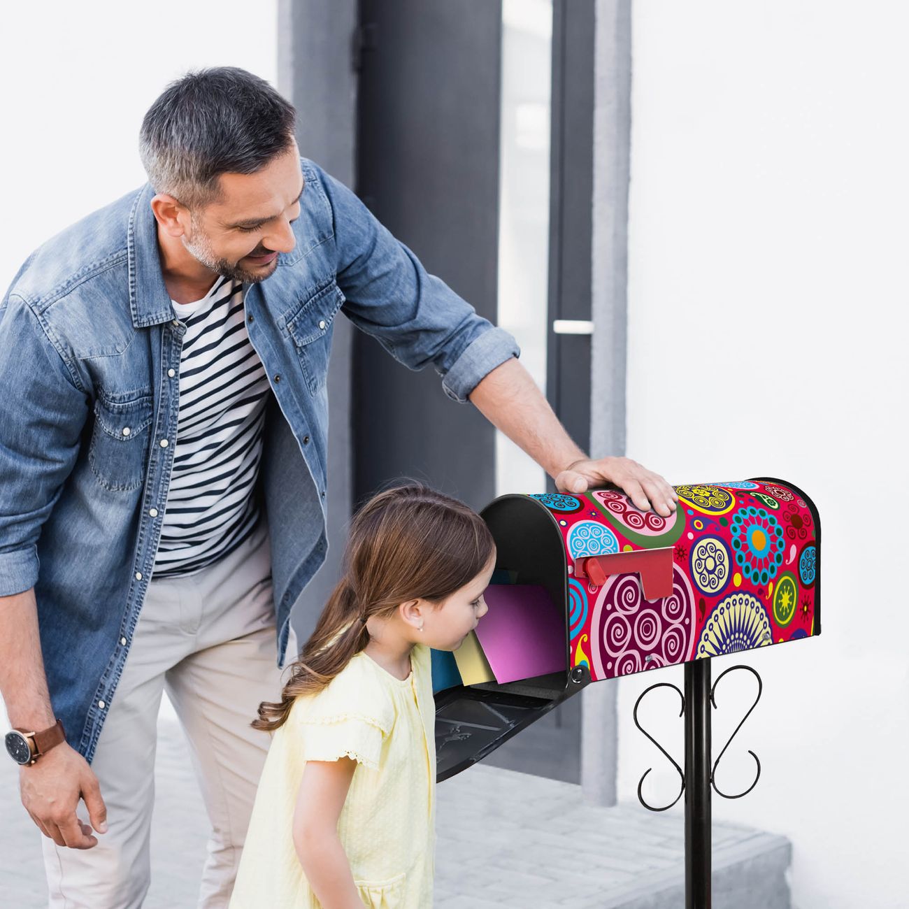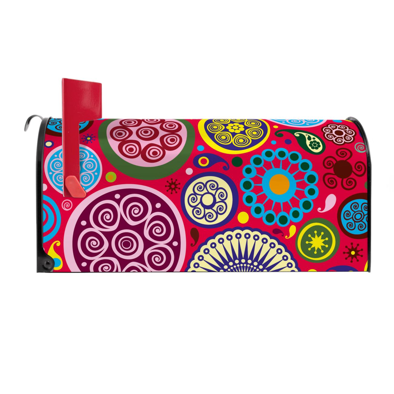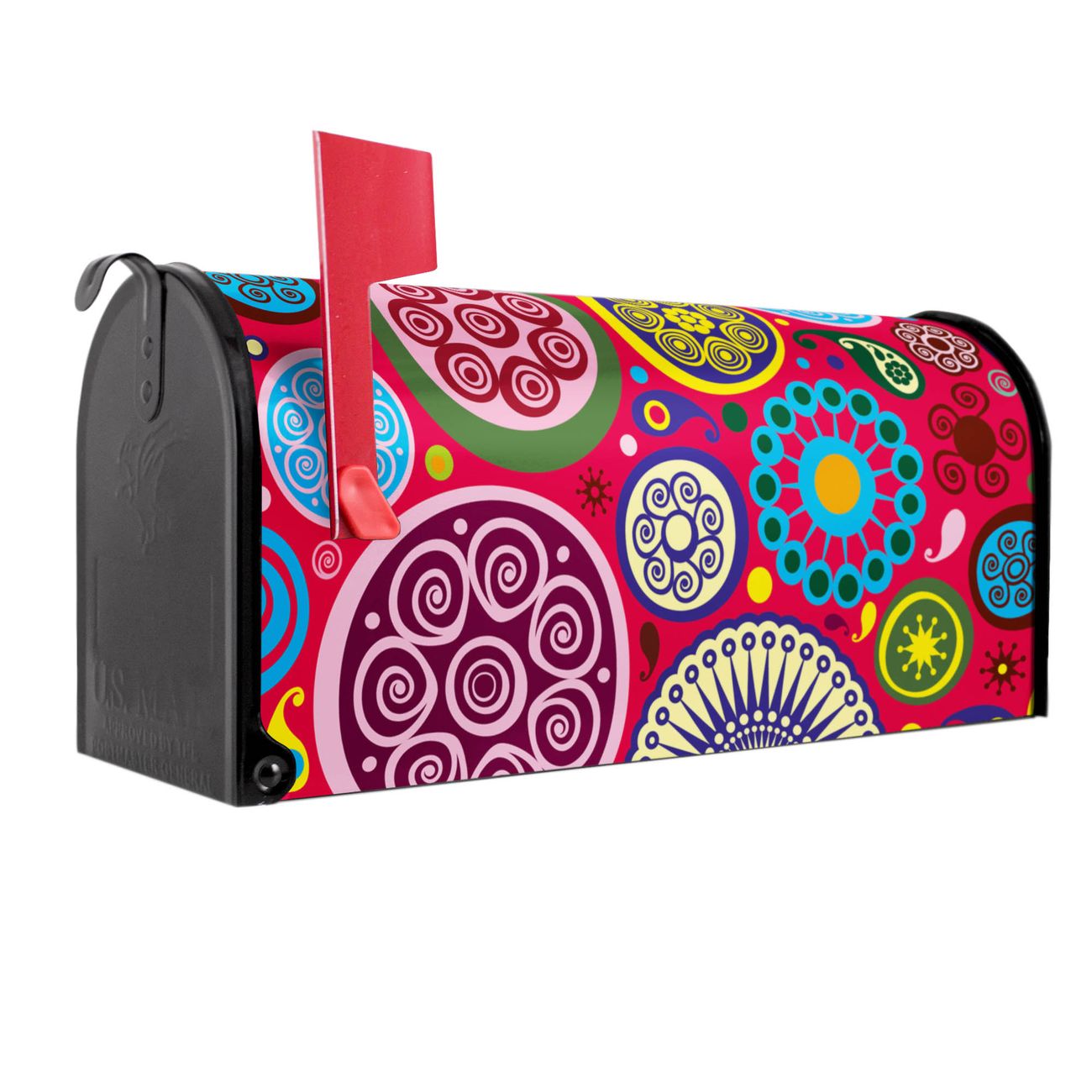 Der amerikanische Briefkasten von banjado mit Retro Kreise Motiv bietet Ihnen ausreichend Fassungsvermögen, um große A4 Sendungen und Zeitschriften zu empfangen. Die typisch amerikanische rote Fahne zeigt Ihnen an, wenn Sie Post erhalten haben. Die US-Mailbox besteht aus verzinktem Stahlblech welches lackiert wurde und ist 48 x 22 x 16 CM (BxHxT) groß. Die Folie mit Motiv Retro Kreise besteht aus einer wetter- und UV-resistenten Folie, die mit einem Schutzlaminat überzogen ist, sodass die US Mailbox zusätzlich vor Kratzern geschützt ist. An der Unterkante sind 4 Löcher je Seite um die Mailbox, typisch amerikanisch, an einem Holzpfahl oder einem Zaun zu befestigen. Auf Wunsch können Sie bei uns den passenden Standfuß oder die passende Wandhalterung kaufen um die US-Mailbox sicher zu befestigen. Wir bieten Ihnen ebenfalls Namensschilder, bereits beschriftet oder frei zu beschriften, und verschiedene selbst gestaltete Bitte-Keine-Werbung-Aufkleber.