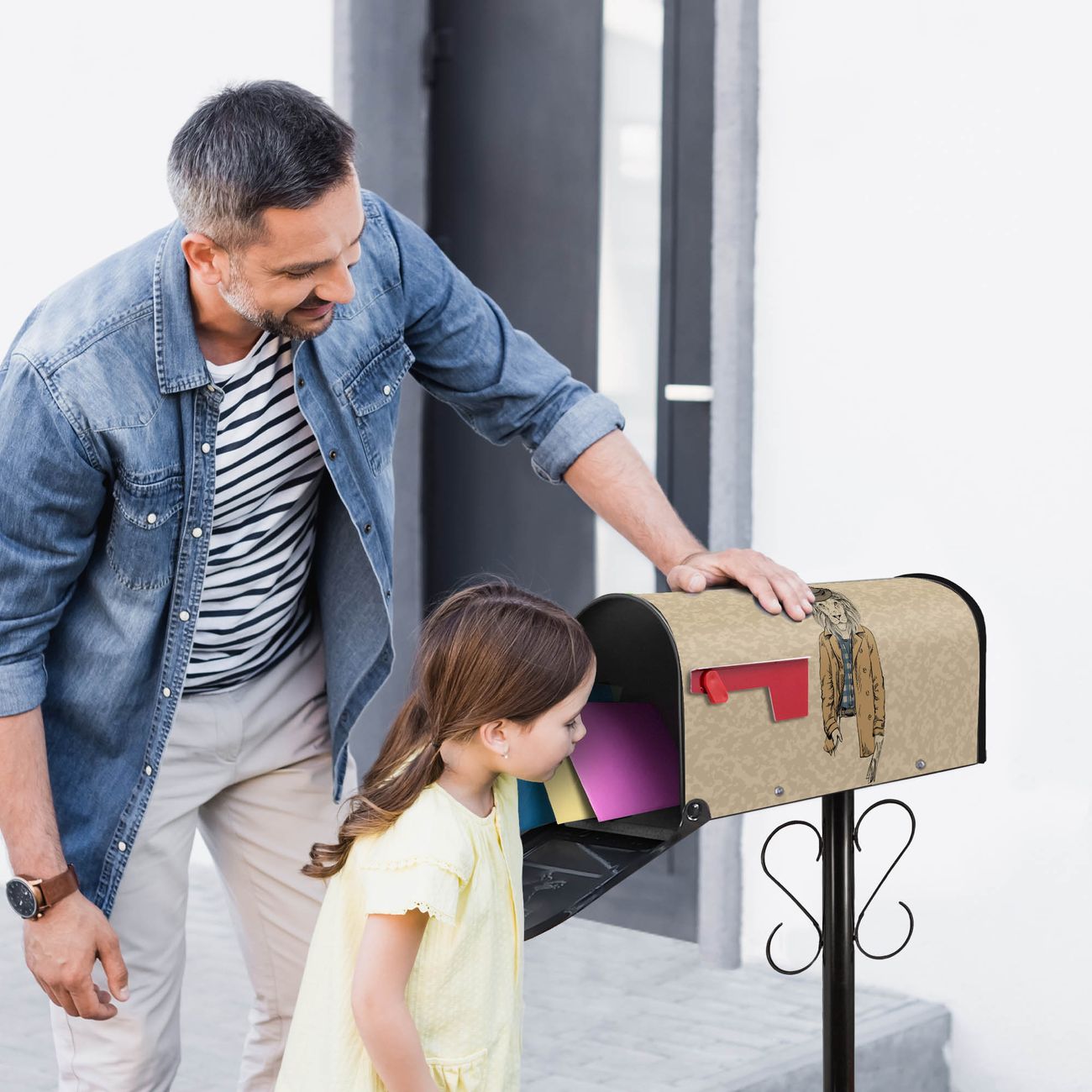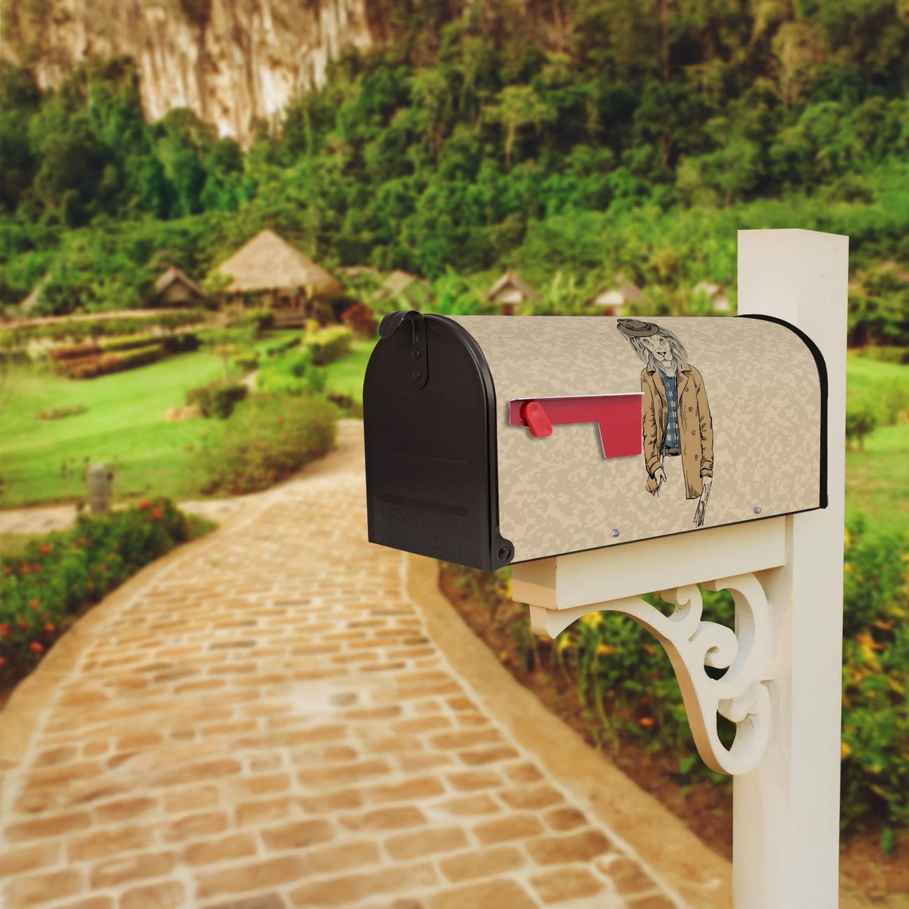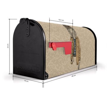 Der amerikanische Briefkasten von banjado mit Retro Style Motiv bietet Ihnen ausreichend Fassungsvermögen, um große A4 Sendungen und Zeitschriften zu empfangen. Die typisch amerikanische rote Fahne zeigt Ihnen an, wenn Sie Post erhalten haben. Die US-Mailbox besteht aus verzinktem Stahlblech welches lackiert wurde und ist 48 x 22 x 16 CM (BxHxT) groß. Die Folie mit Motiv Retro Style besteht aus einer wetter- und UV-resistenten Folie, die mit einem Schutzlaminat überzogen ist, sodass die US Mailbox zusätzlich vor Kratzern geschützt ist. An der Unterkante sind 4 Löcher je Seite um die Mailbox, typisch amerikanisch, an einem Holzpfahl oder einem Zaun zu befestigen. Auf Wunsch können Sie bei uns den passenden Standfuß oder die passende Wandhalterung kaufen um die US-Mailbox sicher zu befestigen. Wir bieten Ihnen ebenfalls Namensschilder, bereits beschriftet oder frei zu beschriften, und verschiedene selbst gestaltete Bitte-Keine-Werbung-Aufkleber.