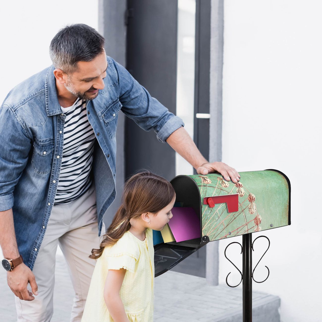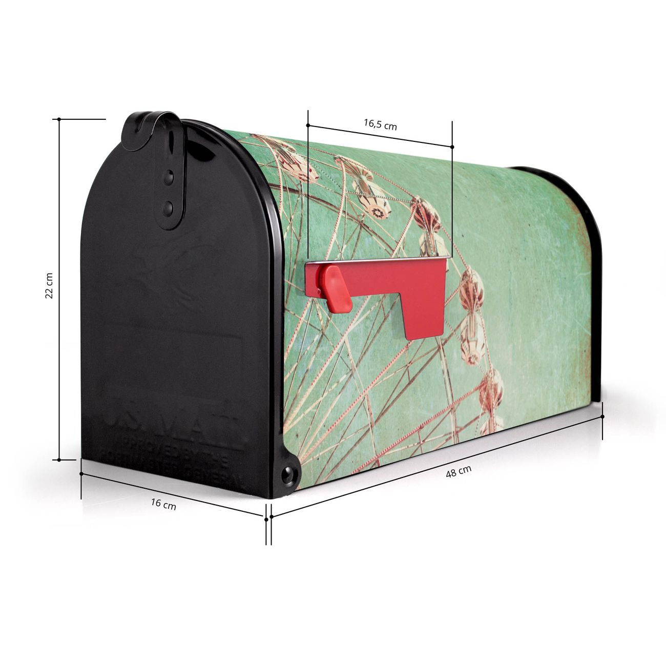 Der amerikanische Briefkasten von banjado mit Riesenrad 1 Motiv bietet Ihnen ausreichend Fassungsvermögen, um große A4 Sendungen und Zeitschriften zu empfangen. Die typisch amerikanische rote Fahne zeigt Ihnen an, wenn Sie Post erhalten haben. Die US-Mailbox besteht aus verzinktem Stahlblech welches lackiert wurde und ist 48 x 22 x 16 CM (BxHxT) groß. Die Folie mit Motiv Riesenrad 1 besteht aus einer wetter- und UV-resistenten Folie, die mit einem Schutzlaminat überzogen ist, sodass die US Mailbox zusätzlich vor Kratzern geschützt ist. An der Unterkante sind 4 Löcher je Seite um die Mailbox, typisch amerikanisch, an einem Holzpfahl oder einem Zaun zu befestigen. Auf Wunsch können Sie bei uns den passenden Standfuß oder die passende Wandhalterung kaufen um die US-Mailbox sicher zu befestigen. Wir bieten Ihnen ebenfalls Namensschilder, bereits beschriftet oder frei zu beschriften, und verschiedene selbst gestaltete Bitte-Keine-Werbung-Aufkleber.