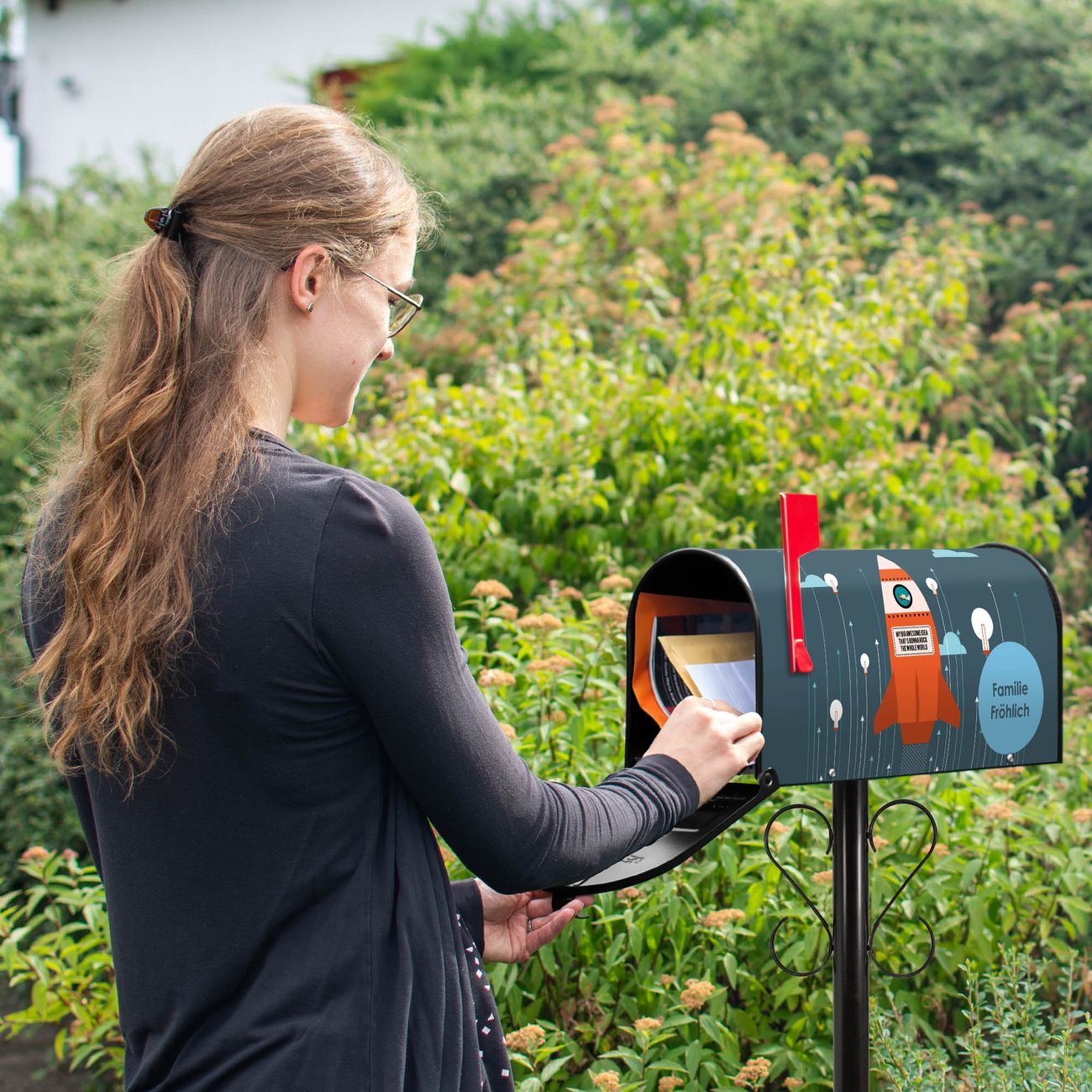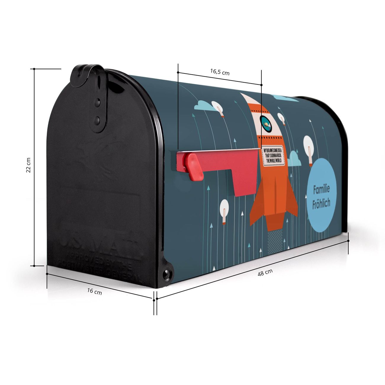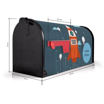 Der amerikanische Briefkasten von banjado mit Rock the World Motiv bietet Ihnen ausreichend Fassungsvermögen, um große A4 Sendungen und Zeitschriften zu empfangen. Die typisch amerikanische rote Fahne zeigt Ihnen an, wenn Sie Post erhalten haben. Die US-Mailbox besteht aus verzinktem Stahlblech welches lackiert wurde und ist 48 x 22 x 16 CM (BxHxT) groß. Die Folie mit Motiv Rock the World besteht aus einer wetter- und UV-resistenten Folie, die mit einem Schutzlaminat überzogen ist, sodass die US Mailbox zusätzlich vor Kratzern geschützt ist. An der Unterkante sind 4 Löcher je Seite um die Mailbox, typisch amerikanisch, an einem Holzpfahl oder einem Zaun zu befestigen. Auf Wunsch können Sie bei uns den passenden Standfuß oder die passende Wandhalterung kaufen um die US-Mailbox sicher zu befestigen. Wir bieten Ihnen ebenfalls Namensschilder, bereits beschriftet oder frei zu beschriften, und verschiedene selbst gestaltete Bitte-Keine-Werbung-Aufkleber.