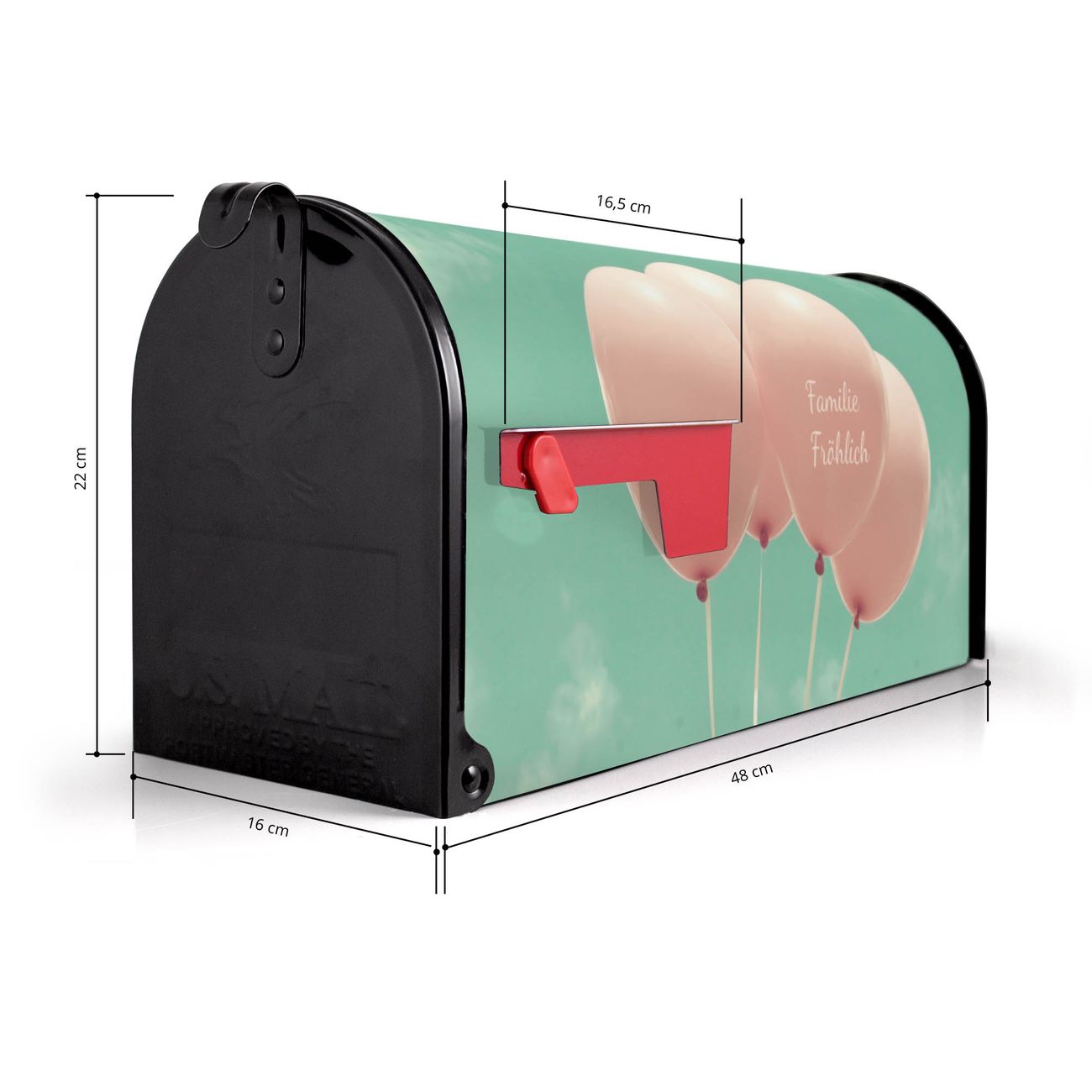 Der amerikanische Briefkasten von banjado mit Rosa Ballons Motiv bietet Ihnen ausreichend Fassungsvermögen, um große A4 Sendungen und Zeitschriften zu empfangen. Die typisch amerikanische rote Fahne zeigt Ihnen an, wenn Sie Post erhalten haben. Die US-Mailbox besteht aus verzinktem Stahlblech welches lackiert wurde und ist 48 x 22 x 16 CM (BxHxT) groß. Die Folie mit Motiv Rosa Ballons besteht aus einer wetter- und UV-resistenten Folie, die mit einem Schutzlaminat überzogen ist, sodass die US Mailbox zusätzlich vor Kratzern geschützt ist. An der Unterkante sind 4 Löcher je Seite um die Mailbox, typisch amerikanisch, an einem Holzpfahl oder einem Zaun zu befestigen. Auf Wunsch können Sie bei uns den passenden Standfuß oder die passende Wandhalterung kaufen um die US-Mailbox sicher zu befestigen. Wir bieten Ihnen ebenfalls Namensschilder, bereits beschriftet oder frei zu beschriften, und verschiedene selbst gestaltete Bitte-Keine-Werbung-Aufkleber.