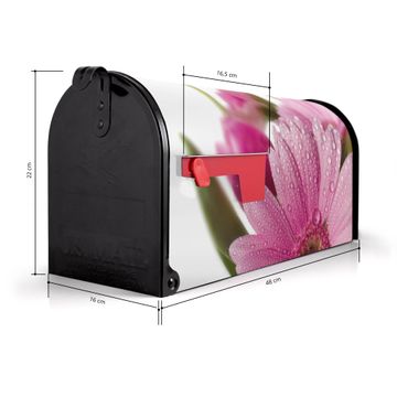 Der amerikanische Briefkasten von banjado mit Rosa Gerbera Motiv bietet Ihnen ausreichend Fassungsvermögen, um große A4 Sendungen und Zeitschriften zu empfangen. Die typisch amerikanische rote Fahne zeigt Ihnen an, wenn Sie Post erhalten haben. Die US-Mailbox besteht aus verzinktem Stahlblech welches lackiert wurde und ist 48 x 22 x 16 CM (BxHxT) groß. Die Folie mit Motiv Rosa Gerbera besteht aus einer wetter- und UV-resistenten Folie, die mit einem Schutzlaminat überzogen ist, sodass die US Mailbox zusätzlich vor Kratzern geschützt ist. An der Unterkante sind 4 Löcher je Seite um die Mailbox, typisch amerikanisch, an einem Holzpfahl oder einem Zaun zu befestigen. Auf Wunsch können Sie bei uns den passenden Standfuß oder die passende Wandhalterung kaufen um die US-Mailbox sicher zu befestigen. Wir bieten Ihnen ebenfalls Namensschilder, bereits beschriftet oder frei zu beschriften, und verschiedene selbst gestaltete Bitte-Keine-Werbung-Aufkleber.