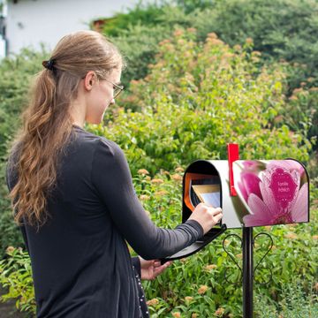 Der amerikanische Briefkasten von banjado mit Rosa Gerbera Motiv bietet Ihnen ausreichend Fassungsvermögen, um große A4 Sendungen und Zeitschriften zu empfangen. Die typisch amerikanische rote Fahne zeigt Ihnen an, wenn Sie Post erhalten haben. Die US-Mailbox besteht aus verzinktem Stahlblech welches lackiert wurde und ist 48 x 22 x 16 CM (BxHxT) groß. Die Folie mit Motiv Rosa Gerbera besteht aus einer wetter- und UV-resistenten Folie, die mit einem Schutzlaminat überzogen ist, sodass die US Mailbox zusätzlich vor Kratzern geschützt ist. An der Unterkante sind 4 Löcher je Seite um die Mailbox, typisch amerikanisch, an einem Holzpfahl oder einem Zaun zu befestigen. Auf Wunsch können Sie bei uns den passenden Standfuß oder die passende Wandhalterung kaufen um die US-Mailbox sicher zu befestigen. Wir bieten Ihnen ebenfalls Namensschilder, bereits beschriftet oder frei zu beschriften, und verschiedene selbst gestaltete Bitte-Keine-Werbung-Aufkleber.
