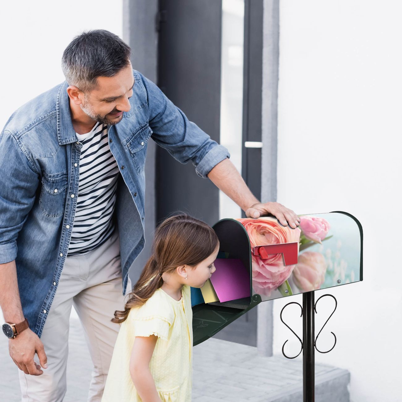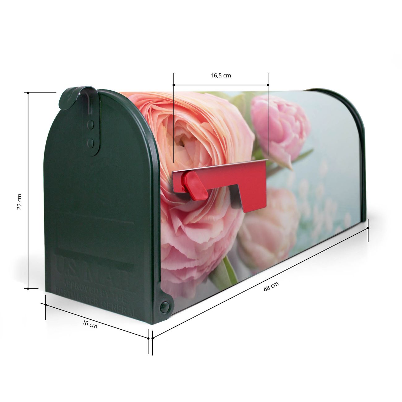 Der amerikanische Briefkasten von banjado mit Rosa Tulpe Motiv bietet Ihnen ausreichend Fassungsvermögen, um große A4 Sendungen und Zeitschriften zu empfangen. Die typisch amerikanische rote Fahne zeigt Ihnen an, wenn Sie Post erhalten haben. Die US-Mailbox besteht aus verzinktem Stahlblech welches lackiert wurde und ist 48 x 22 x 16 CM (BxHxT) groß. Die Folie mit Motiv Rosa Tulpe besteht aus einer wetter- und UV-resistenten Folie, die mit einem Schutzlaminat überzogen ist, sodass die US Mailbox zusätzlich vor Kratzern geschützt ist. An der Unterkante sind 4 Löcher je Seite um die Mailbox, typisch amerikanisch, an einem Holzpfahl oder einem Zaun zu befestigen. Auf Wunsch können Sie bei uns den passenden Standfuß oder die passende Wandhalterung kaufen um die US-Mailbox sicher zu befestigen. Wir bieten Ihnen ebenfalls Namensschilder, bereits beschriftet oder frei zu beschriften, und verschiedene selbst gestaltete Bitte-Keine-Werbung-Aufkleber.