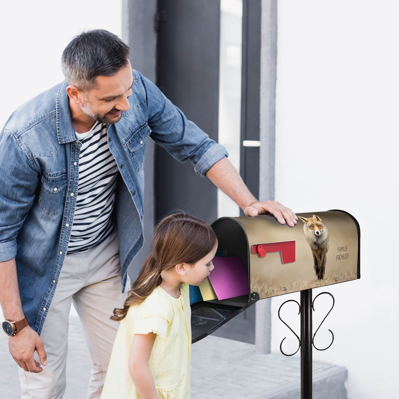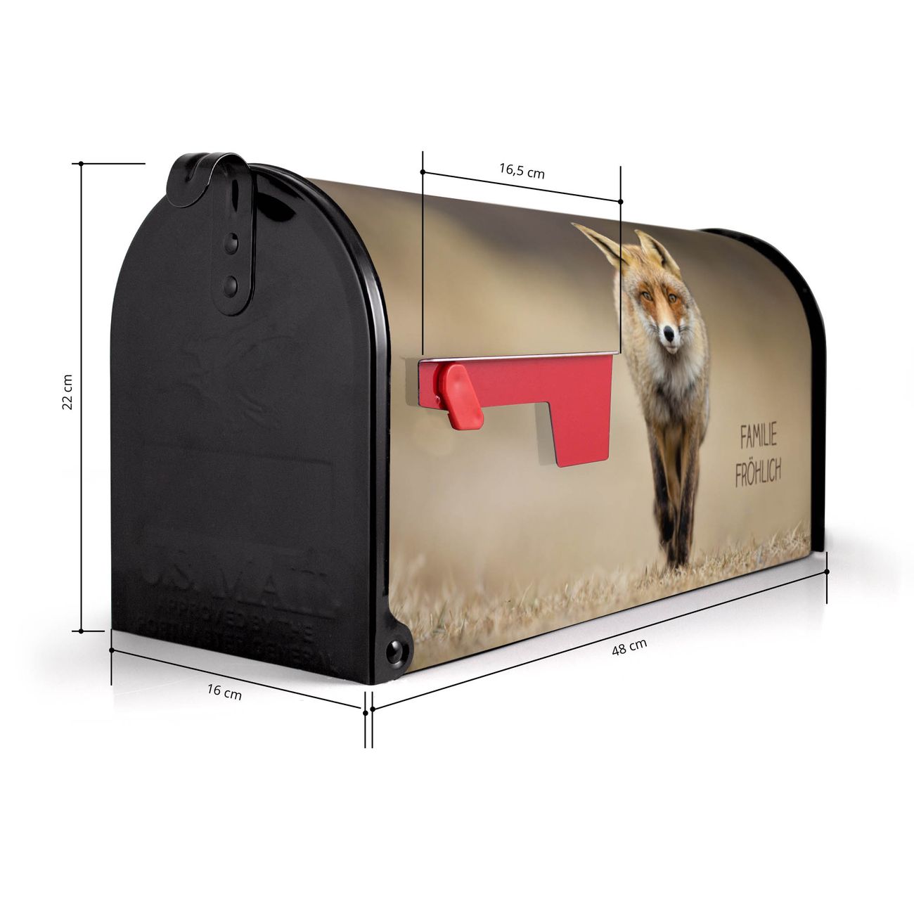 Der amerikanische Briefkasten von banjado mit Rosalie Motiv bietet Ihnen ausreichend Fassungsvermögen, um große A4 Sendungen und Zeitschriften zu empfangen. Die typisch amerikanische rote Fahne zeigt Ihnen an, wenn Sie Post erhalten haben. Die US-Mailbox besteht aus verzinktem Stahlblech welches lackiert wurde und ist 48 x 22 x 16 CM (BxHxT) groß. Die Folie mit Motiv Rosalie besteht aus einer wetter- und UV-resistenten Folie, die mit einem Schutzlaminat überzogen ist, sodass die US Mailbox zusätzlich vor Kratzern geschützt ist. An der Unterkante sind 4 Löcher je Seite um die Mailbox, typisch amerikanisch, an einem Holzpfahl oder einem Zaun zu befestigen. Auf Wunsch können Sie bei uns den passenden Standfuß oder die passende Wandhalterung kaufen um die US-Mailbox sicher zu befestigen. Wir bieten Ihnen ebenfalls Namensschilder, bereits beschriftet oder frei zu beschriften, und verschiedene selbst gestaltete Bitte-Keine-Werbung-Aufkleber.