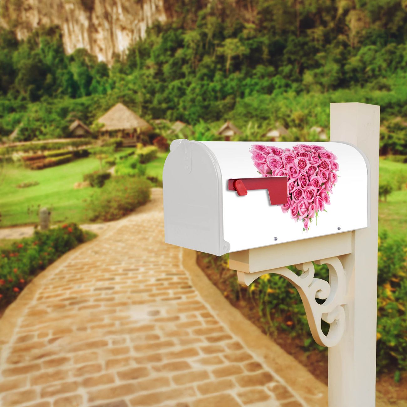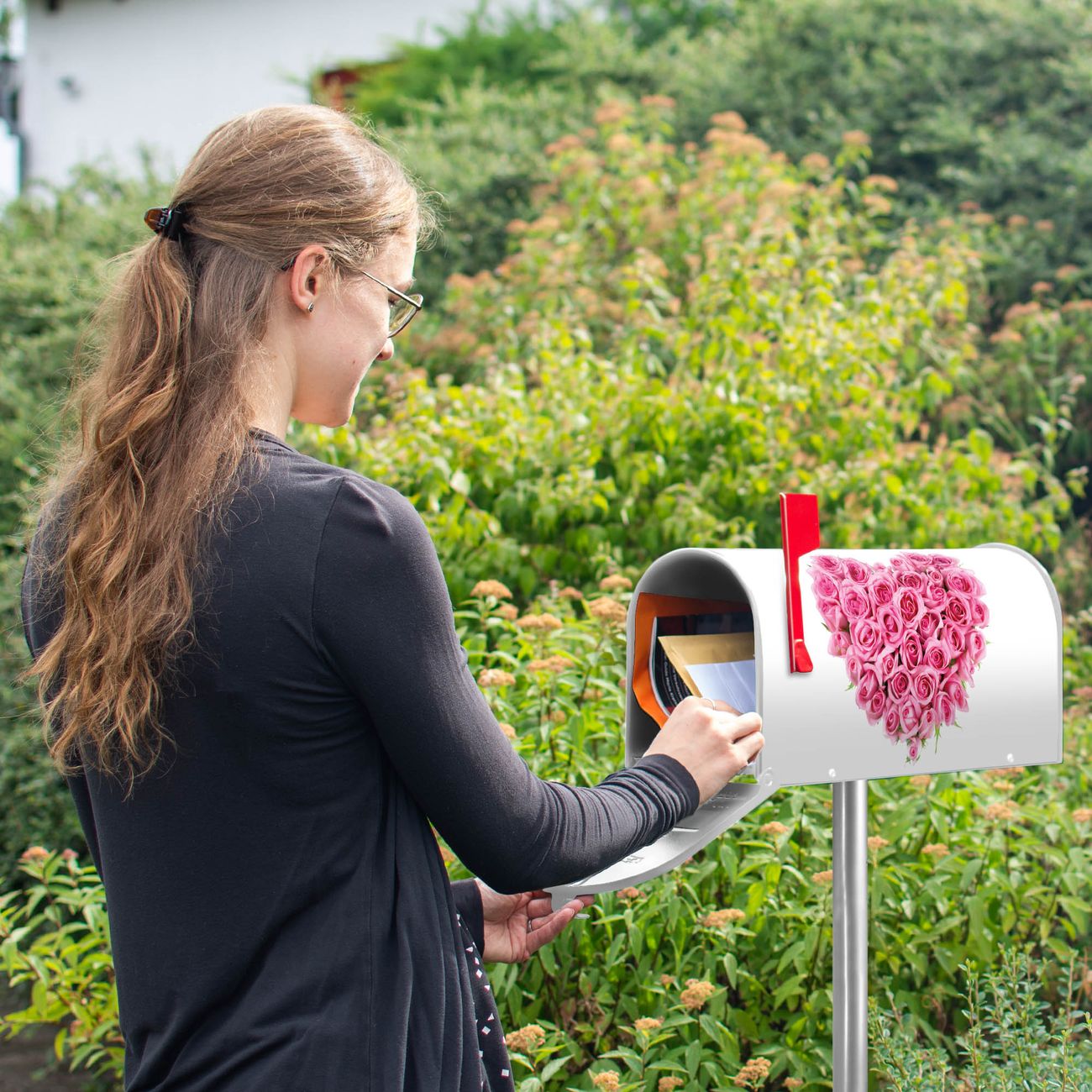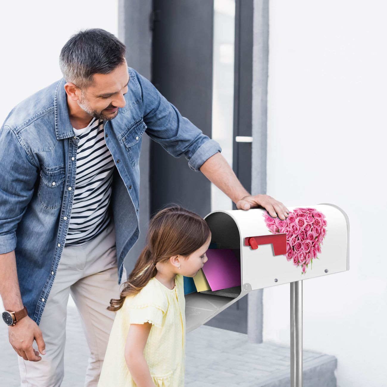 Der amerikanische Briefkasten von banjado mit Rosenherz Motiv bietet Ihnen ausreichend Fassungsvermögen, um große A4 Sendungen und Zeitschriften zu empfangen. Die typisch amerikanische rote Fahne zeigt Ihnen an, wenn Sie Post erhalten haben. Die US-Mailbox besteht aus verzinktem Stahlblech welches lackiert wurde und ist 48 x 22 x 16 CM (BxHxT) groß. Die Folie mit Motiv Rosenherz besteht aus einer wetter- und UV-resistenten Folie, die mit einem Schutzlaminat überzogen ist, sodass die US Mailbox zusätzlich vor Kratzern geschützt ist. An der Unterkante sind 4 Löcher je Seite um die Mailbox, typisch amerikanisch, an einem Holzpfahl oder einem Zaun zu befestigen. Auf Wunsch können Sie bei uns den passenden Standfuß oder die passende Wandhalterung kaufen um die US-Mailbox sicher zu befestigen. Wir bieten Ihnen ebenfalls Namensschilder, bereits beschriftet oder frei zu beschriften, und verschiedene selbst gestaltete Bitte-Keine-Werbung-Aufkleber.