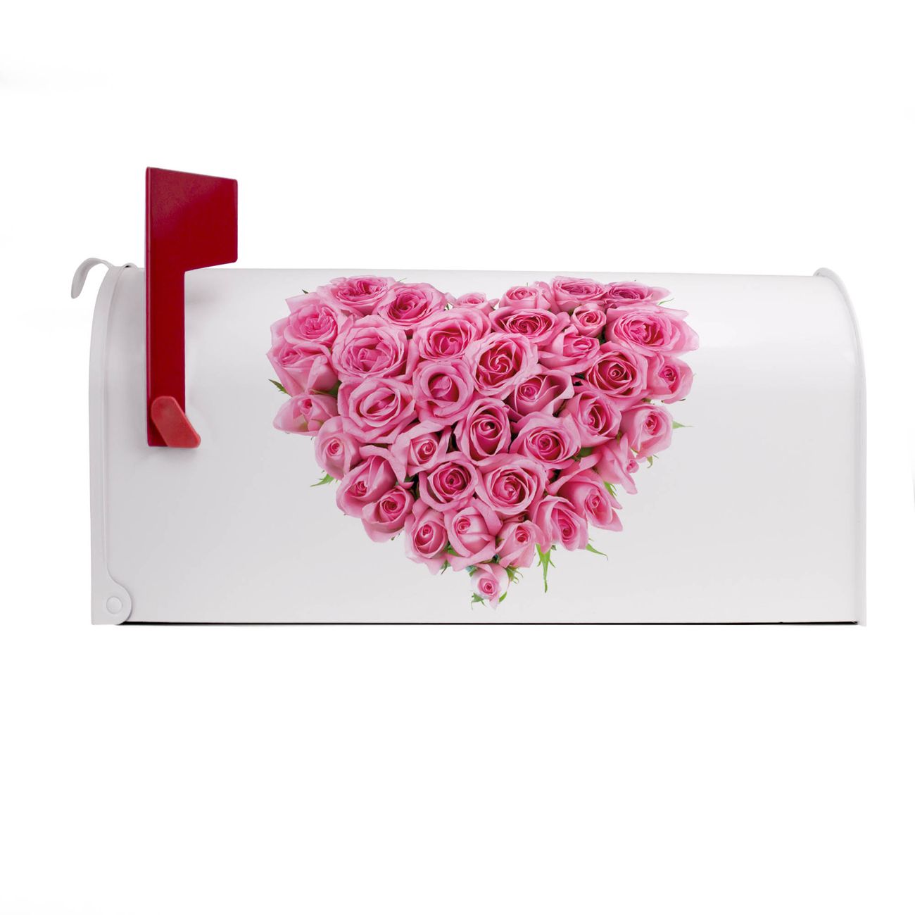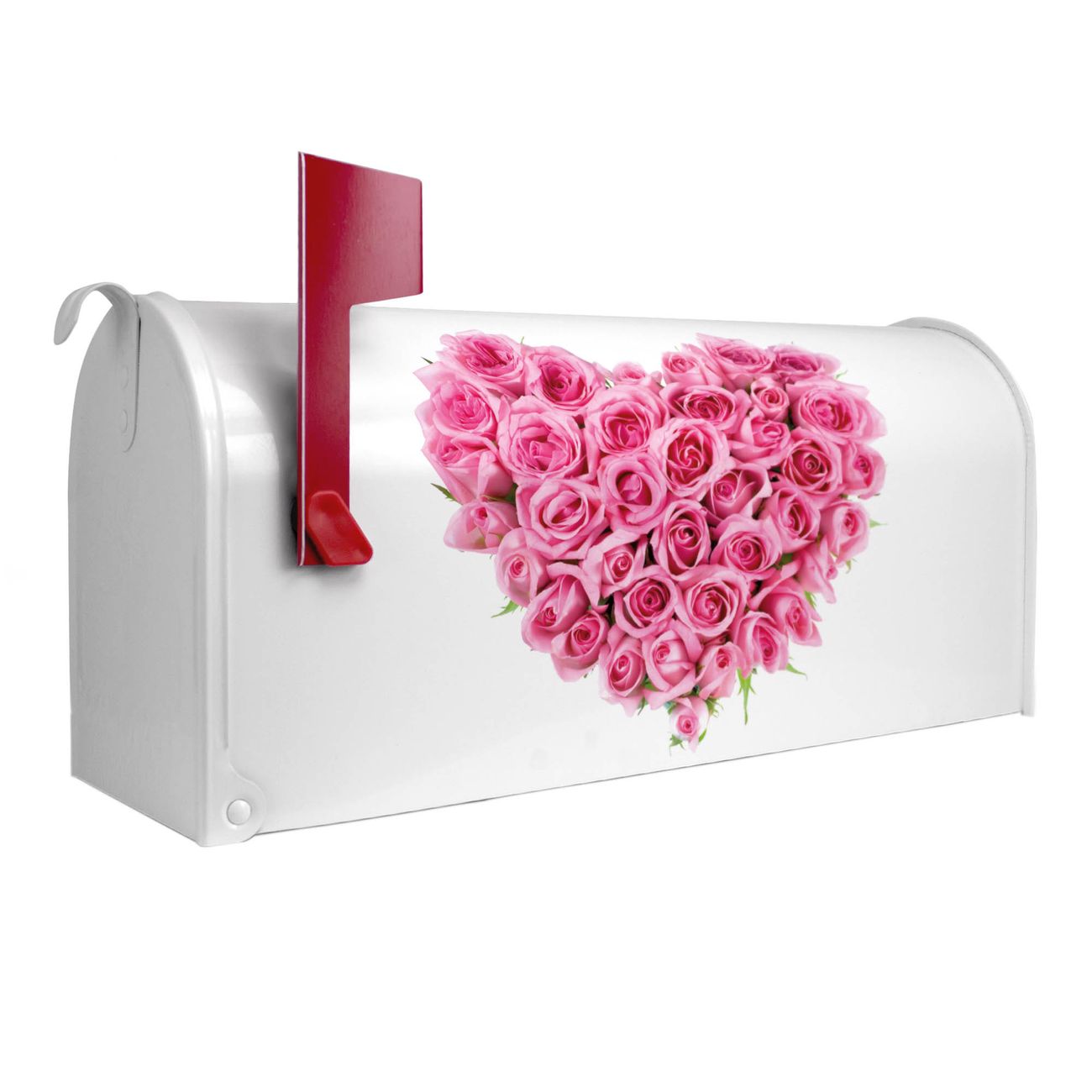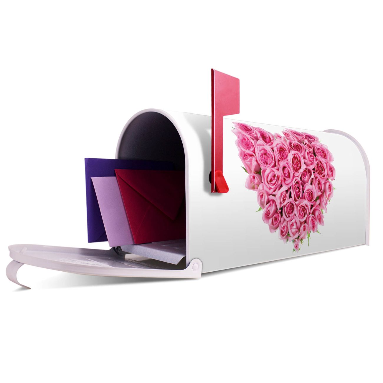 Der amerikanische Briefkasten von banjado mit Rosenherz Motiv bietet Ihnen ausreichend Fassungsvermögen, um große A4 Sendungen und Zeitschriften zu empfangen. Die typisch amerikanische rote Fahne zeigt Ihnen an, wenn Sie Post erhalten haben. Die US-Mailbox besteht aus verzinktem Stahlblech welches lackiert wurde und ist 48 x 22 x 16 CM (BxHxT) groß. Die Folie mit Motiv Rosenherz besteht aus einer wetter- und UV-resistenten Folie, die mit einem Schutzlaminat überzogen ist, sodass die US Mailbox zusätzlich vor Kratzern geschützt ist. An der Unterkante sind 4 Löcher je Seite um die Mailbox, typisch amerikanisch, an einem Holzpfahl oder einem Zaun zu befestigen. Auf Wunsch können Sie bei uns den passenden Standfuß oder die passende Wandhalterung kaufen um die US-Mailbox sicher zu befestigen. Wir bieten Ihnen ebenfalls Namensschilder, bereits beschriftet oder frei zu beschriften, und verschiedene selbst gestaltete Bitte-Keine-Werbung-Aufkleber.