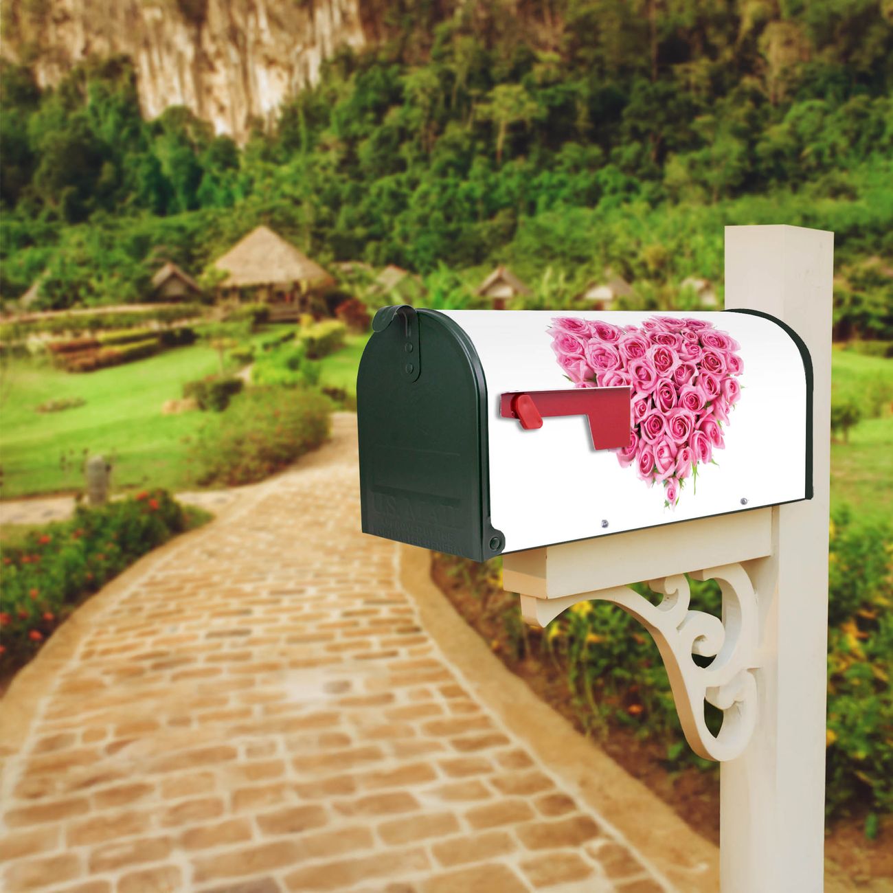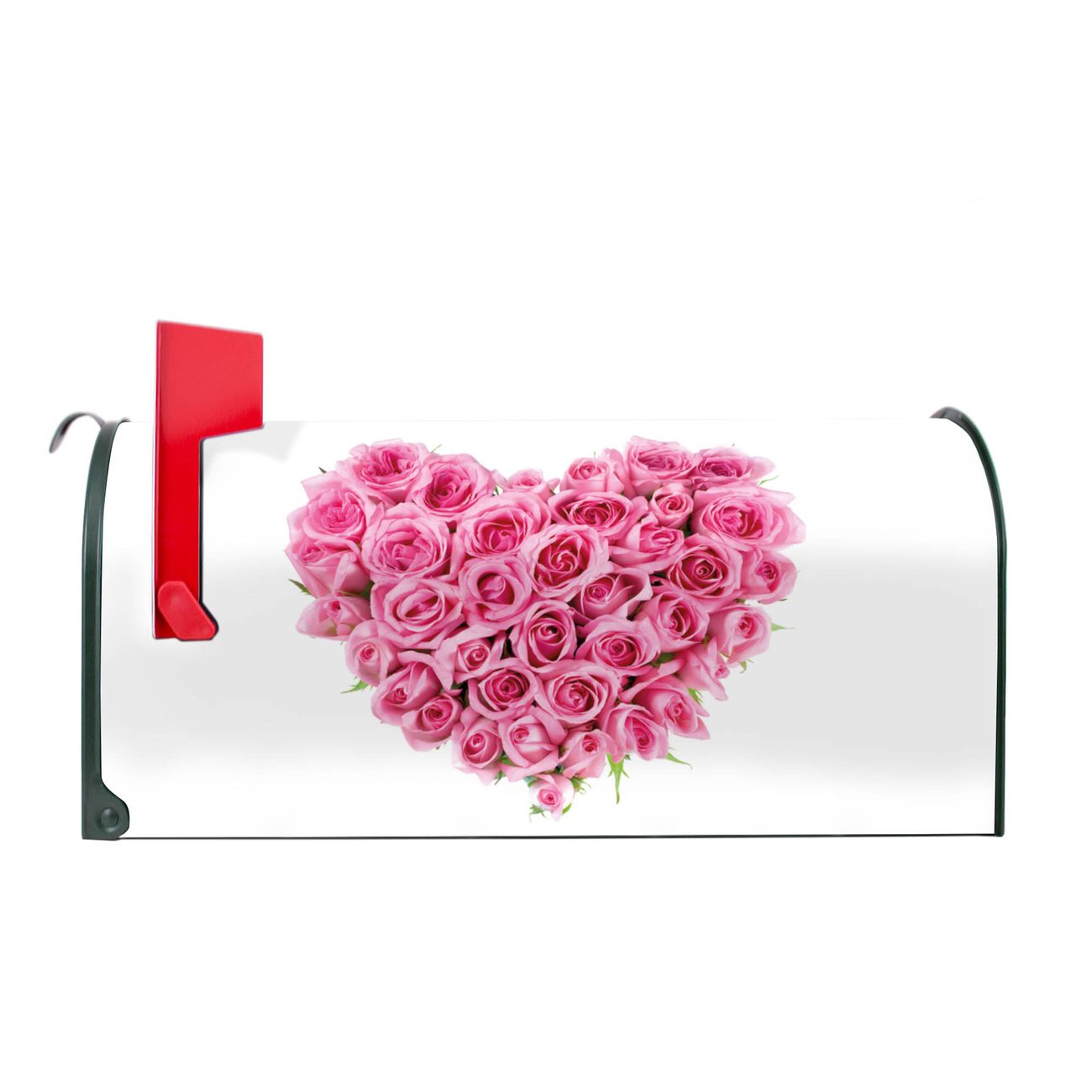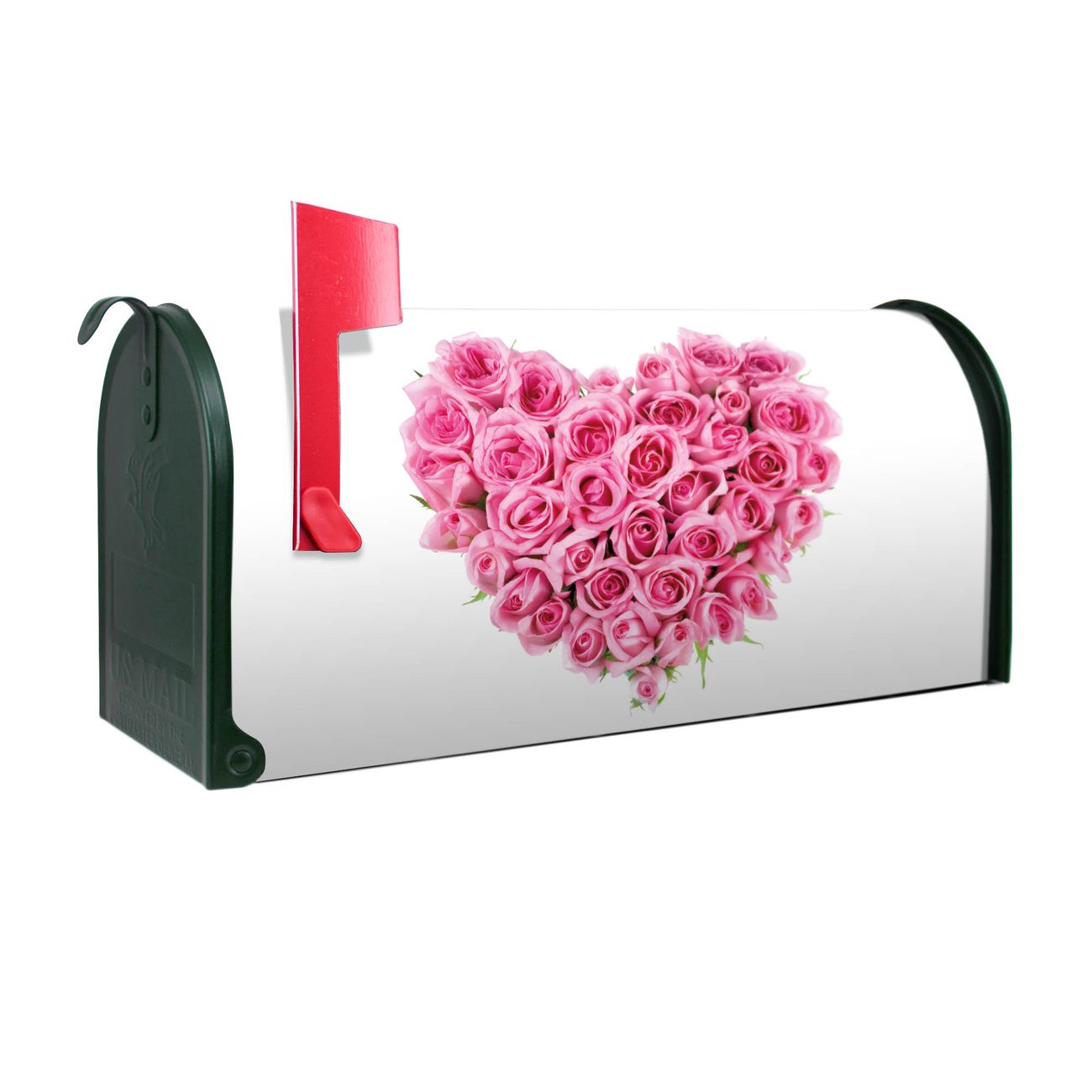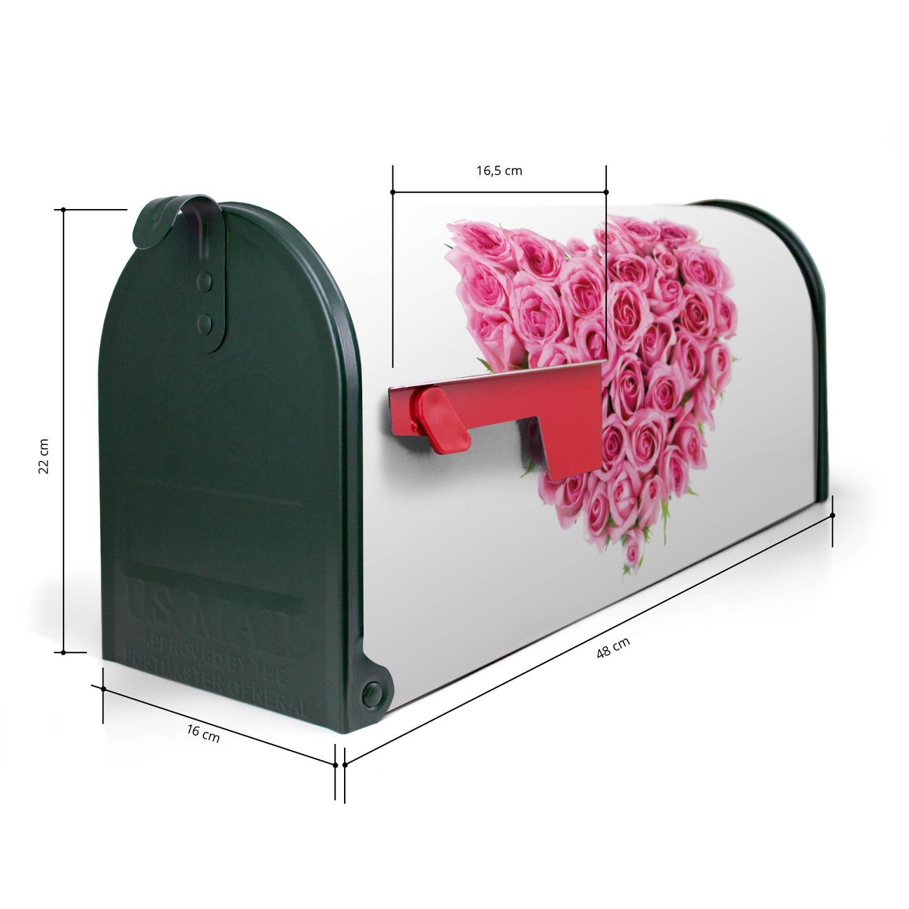 Der amerikanische Briefkasten von banjado mit Rosenherz Motiv bietet Ihnen ausreichend Fassungsvermögen, um große A4 Sendungen und Zeitschriften zu empfangen. Die typisch amerikanische rote Fahne zeigt Ihnen an, wenn Sie Post erhalten haben. Die US-Mailbox besteht aus verzinktem Stahlblech welches lackiert wurde und ist 48 x 22 x 16 CM (BxHxT) groß. Die Folie mit Motiv Rosenherz besteht aus einer wetter- und UV-resistenten Folie, die mit einem Schutzlaminat überzogen ist, sodass die US Mailbox zusätzlich vor Kratzern geschützt ist. An der Unterkante sind 4 Löcher je Seite um die Mailbox, typisch amerikanisch, an einem Holzpfahl oder einem Zaun zu befestigen. Auf Wunsch können Sie bei uns den passenden Standfuß oder die passende Wandhalterung kaufen um die US-Mailbox sicher zu befestigen. Wir bieten Ihnen ebenfalls Namensschilder, bereits beschriftet oder frei zu beschriften, und verschiedene selbst gestaltete Bitte-Keine-Werbung-Aufkleber.
