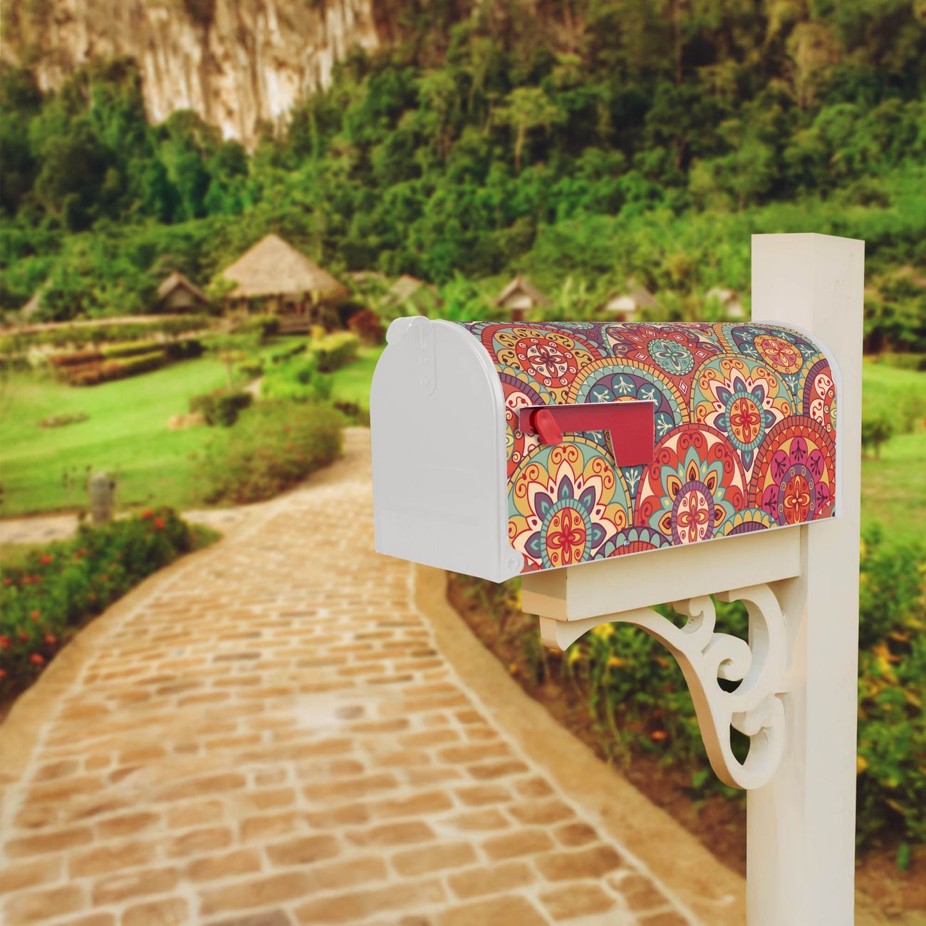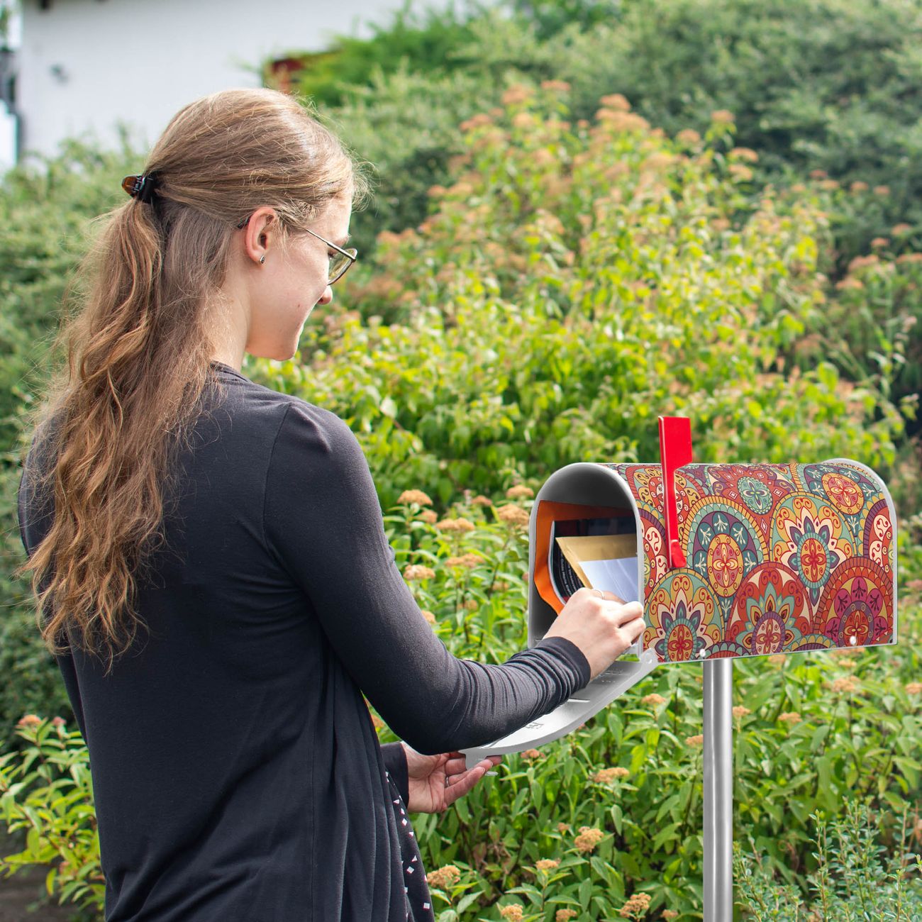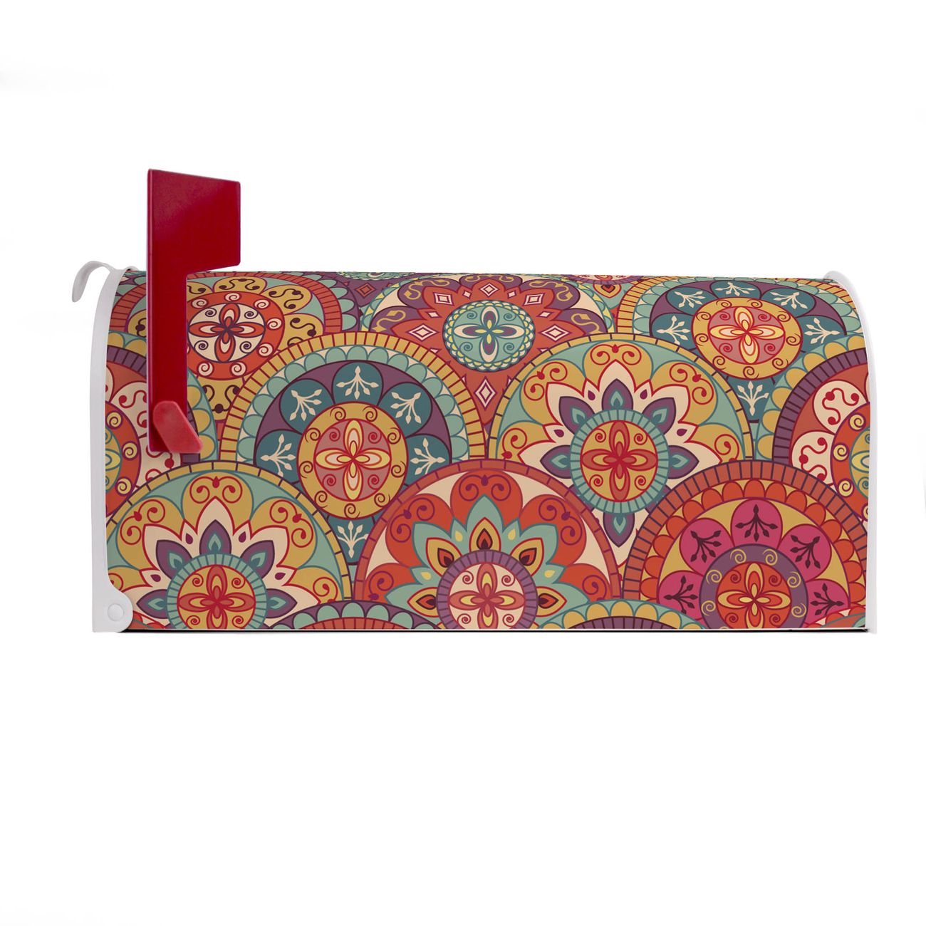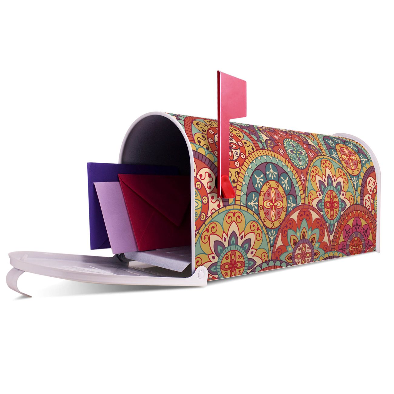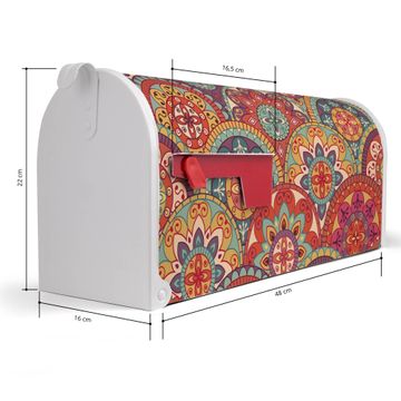 Der amerikanische Briefkasten von banjado mit Rosetten Motiv bietet Ihnen ausreichend Fassungsvermögen, um große A4 Sendungen und Zeitschriften zu empfangen. Die typisch amerikanische rote Fahne zeigt Ihnen an, wenn Sie Post erhalten haben. Die US-Mailbox besteht aus verzinktem Stahlblech welches lackiert wurde und ist 48 x 22 x 16 CM (BxHxT) groß. Die Folie mit Motiv Rosetten besteht aus einer wetter- und UV-resistenten Folie, die mit einem Schutzlaminat überzogen ist, sodass die US Mailbox zusätzlich vor Kratzern geschützt ist. An der Unterkante sind 4 Löcher je Seite um die Mailbox, typisch amerikanisch, an einem Holzpfahl oder einem Zaun zu befestigen. Auf Wunsch können Sie bei uns den passenden Standfuß oder die passende Wandhalterung kaufen um die US-Mailbox sicher zu befestigen. Wir bieten Ihnen ebenfalls Namensschilder, bereits beschriftet oder frei zu beschriften, und verschiedene selbst gestaltete Bitte-Keine-Werbung-Aufkleber.