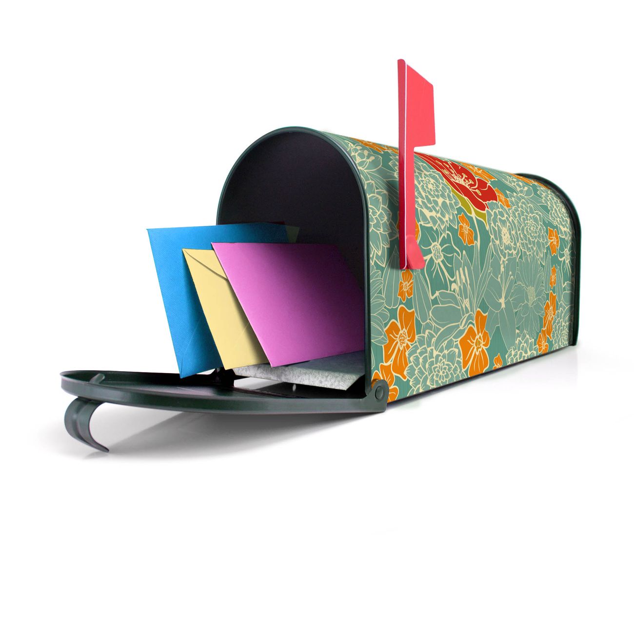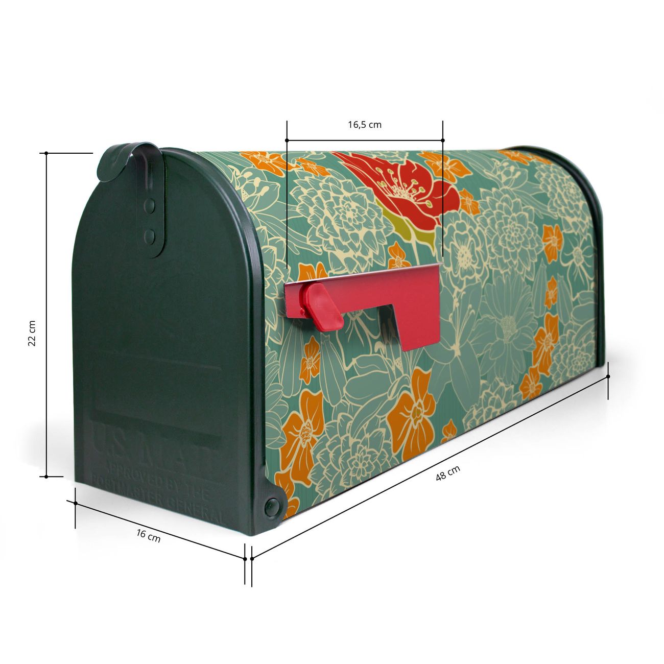 Der amerikanische Briefkasten von banjado mit Rote Blumen Motiv bietet Ihnen ausreichend Fassungsvermögen, um große A4 Sendungen und Zeitschriften zu empfangen. Die typisch amerikanische rote Fahne zeigt Ihnen an, wenn Sie Post erhalten haben. Die US-Mailbox besteht aus verzinktem Stahlblech welches lackiert wurde und ist 48 x 22 x 16 CM (BxHxT) groß. Die Folie mit Motiv Rote Blumen besteht aus einer wetter- und UV-resistenten Folie, die mit einem Schutzlaminat überzogen ist, sodass die US Mailbox zusätzlich vor Kratzern geschützt ist. An der Unterkante sind 4 Löcher je Seite um die Mailbox, typisch amerikanisch, an einem Holzpfahl oder einem Zaun zu befestigen. Auf Wunsch können Sie bei uns den passenden Standfuß oder die passende Wandhalterung kaufen um die US-Mailbox sicher zu befestigen. Wir bieten Ihnen ebenfalls Namensschilder, bereits beschriftet oder frei zu beschriften, und verschiedene selbst gestaltete Bitte-Keine-Werbung-Aufkleber.
