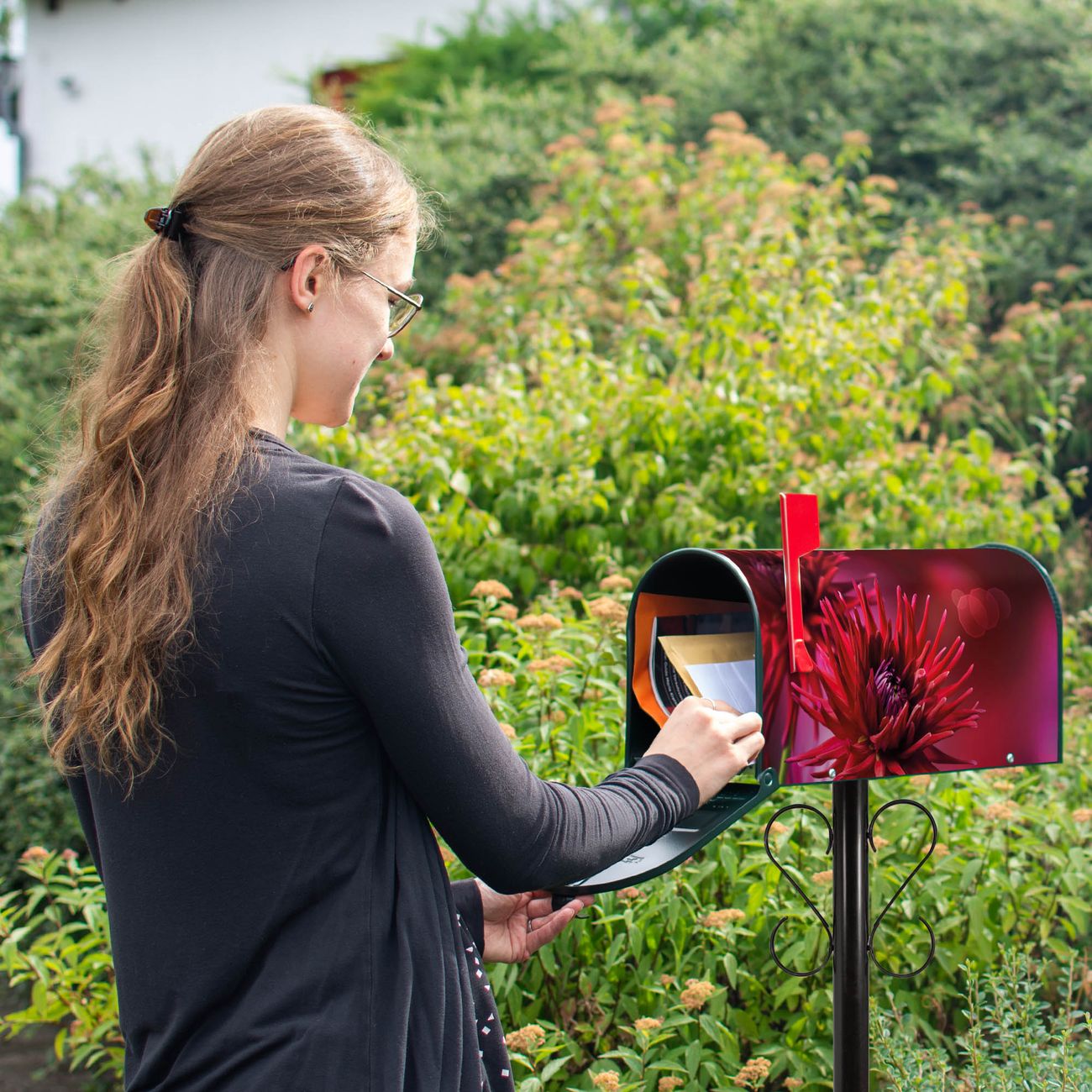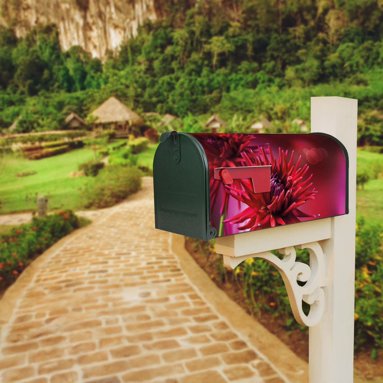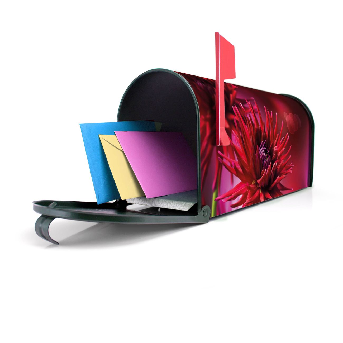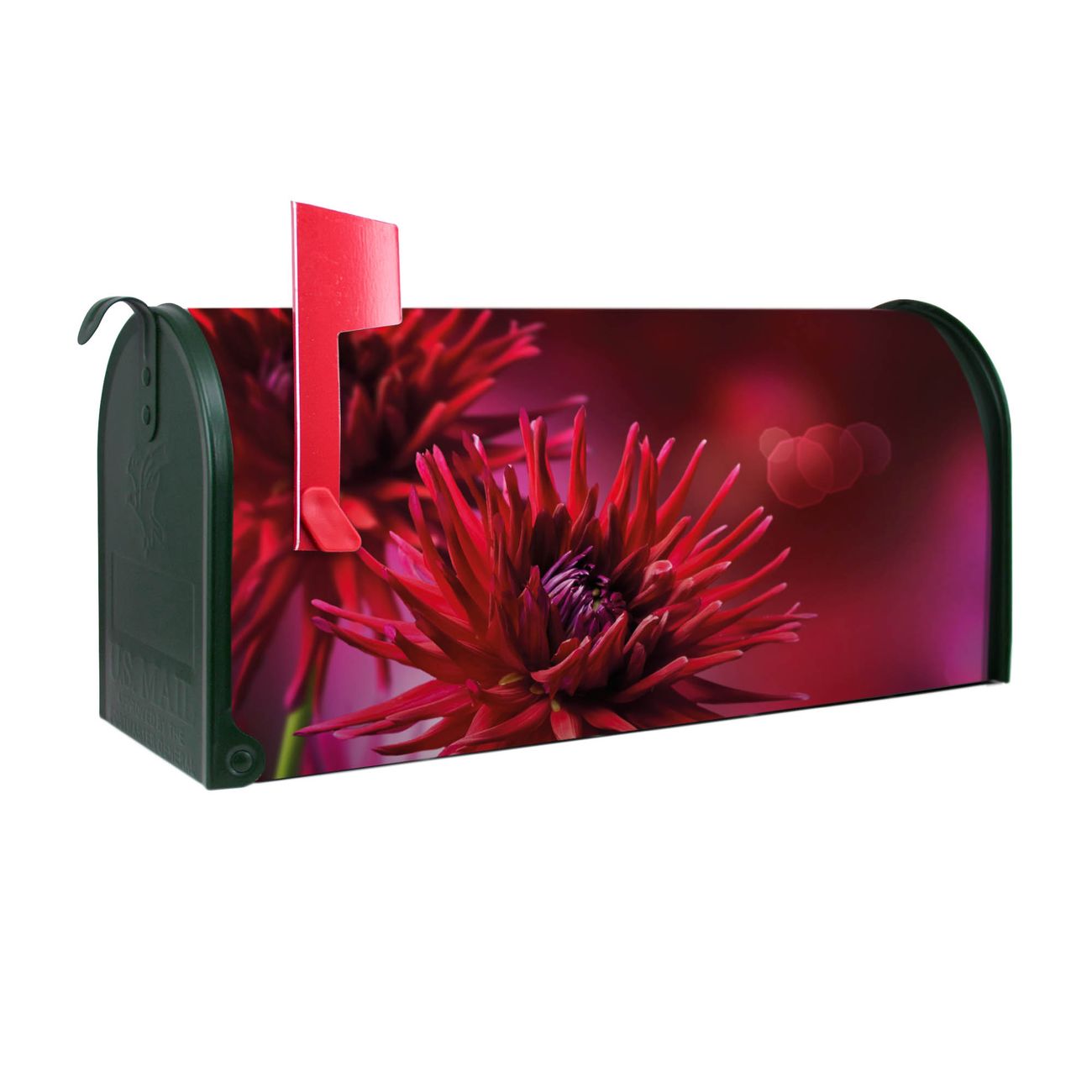 Unser amerikanischer Briefkasten mit dem Motiv Rote Dahlien hat ein sehr ansprechendes und ausgefallenes Design, ist in der Grundfarbe weiß, grün oder schwarz erhältlich. Damit entlocken Sie Ihren Nachbarn und dem Postboten immer wieder ein Lächeln. Die Mailbox ist ein Original Import aus Mississippi USA und wird von unserer kleinen Manufaktur in Sachsen von Hand veredelt. Die US-Mailbox bietet ausreichend Platz auch für große Sendungen, eine Fahne die Ihnen Post anzeigt, wetterfestes und äußerst stabiles Material - so macht Post empfangen Freude.