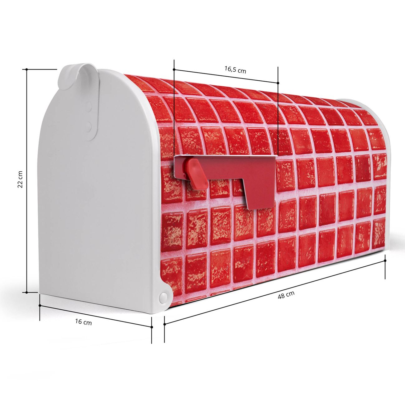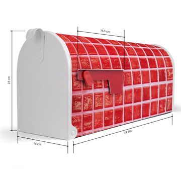Der amerikanische Briefkasten von banjado mit Rote Kacheln Motiv bietet Ihnen ausreichend Fassungsvermögen, um große A4 Sendungen und Zeitschriften zu empfangen. Die typisch amerikanische rote Fahne zeigt Ihnen an, wenn Sie Post erhalten haben. Die US-Mailbox besteht aus verzinktem Stahlblech welches lackiert wurde und ist 48 x 22 x 16 CM (BxHxT) groß. Die Folie mit Motiv Rote Kacheln besteht aus einer wetter- und UV-resistenten Folie, die mit einem Schutzlaminat überzogen ist, sodass die US Mailbox zusätzlich vor Kratzern geschützt ist. An der Unterkante sind 4 Löcher je Seite um die Mailbox, typisch amerikanisch, an einem Holzpfahl oder einem Zaun zu befestigen. Auf Wunsch können Sie bei uns den passenden Standfuß oder die passende Wandhalterung kaufen um die US-Mailbox sicher zu befestigen. Wir bieten Ihnen ebenfalls Namensschilder, bereits beschriftet oder frei zu beschriften, und verschiedene selbst gestaltete Bitte-Keine-Werbung-Aufkleber.