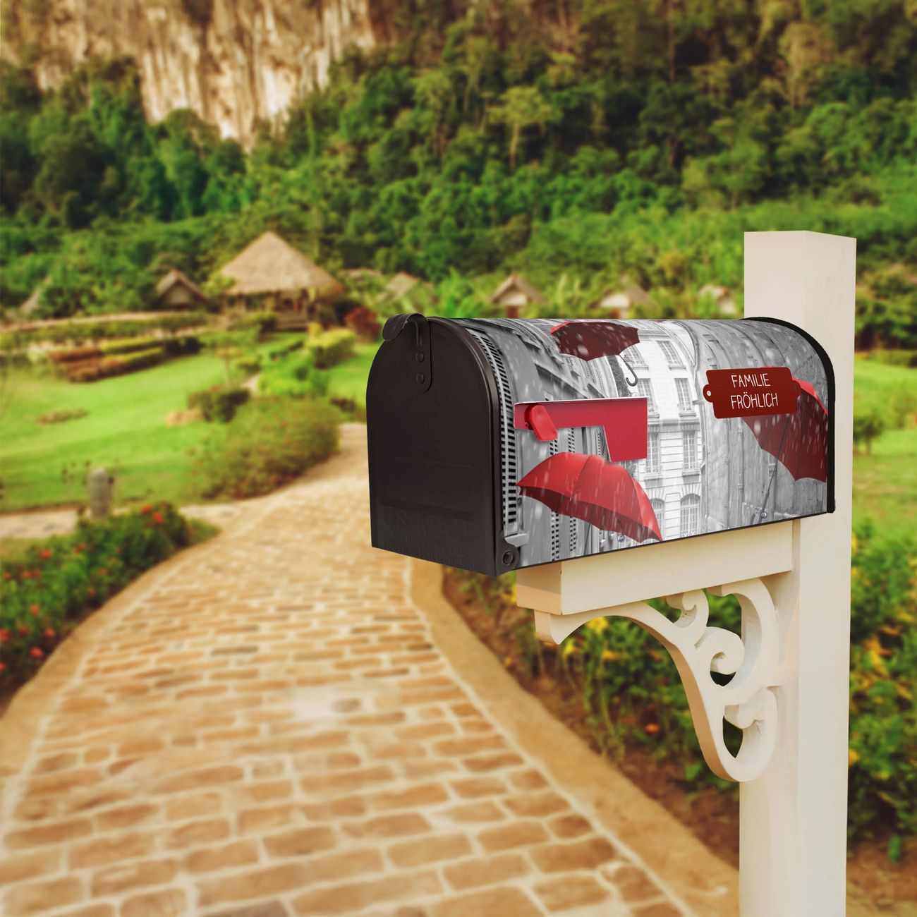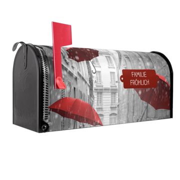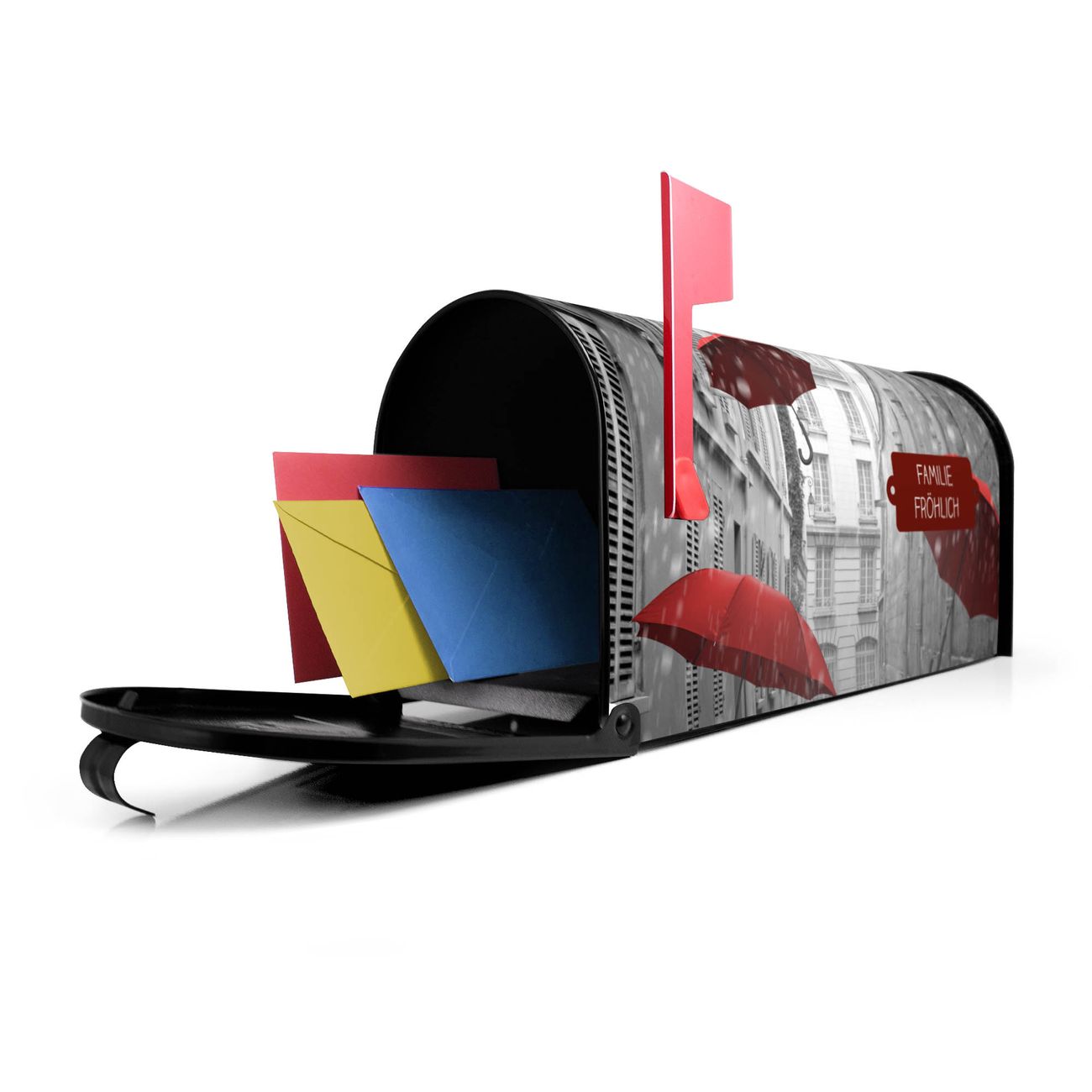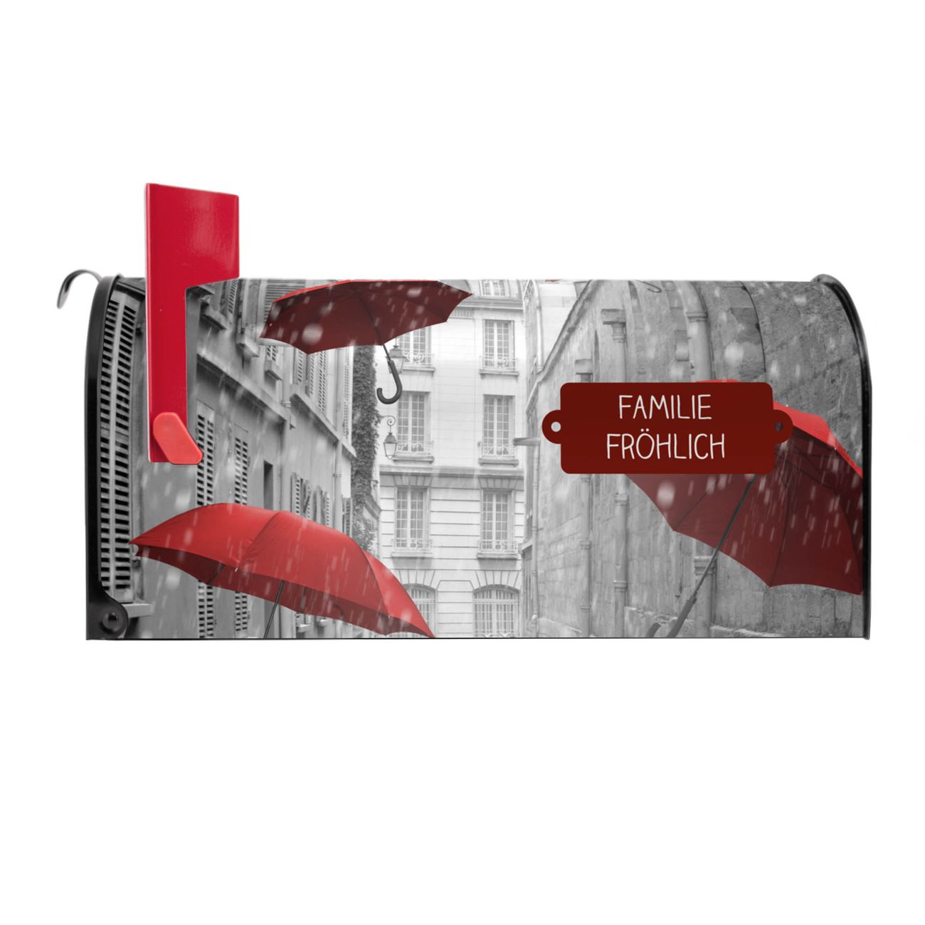 Unser amerikanischer Briefkasten mit dem Motiv Rote Schirme hat ein sehr ansprechendes und ausgefallenes Design, ist in der Grundfarbe weiß, grün oder schwarz erhältlich. Damit entlocken Sie Ihren Nachbarn und dem Postboten immer wieder ein Lächeln. Die Mailbox ist ein Original Import aus Mississippi USA und wird von unserer kleinen Manufaktur in Sachsen von Hand veredelt. Die US-Mailbox bietet ausreichend Platz auch für große Sendungen, eine Fahne die Ihnen Post anzeigt, wetterfestes und äußerst stabiles Material - so macht Post empfangen Freude.