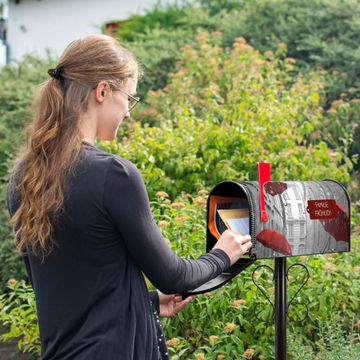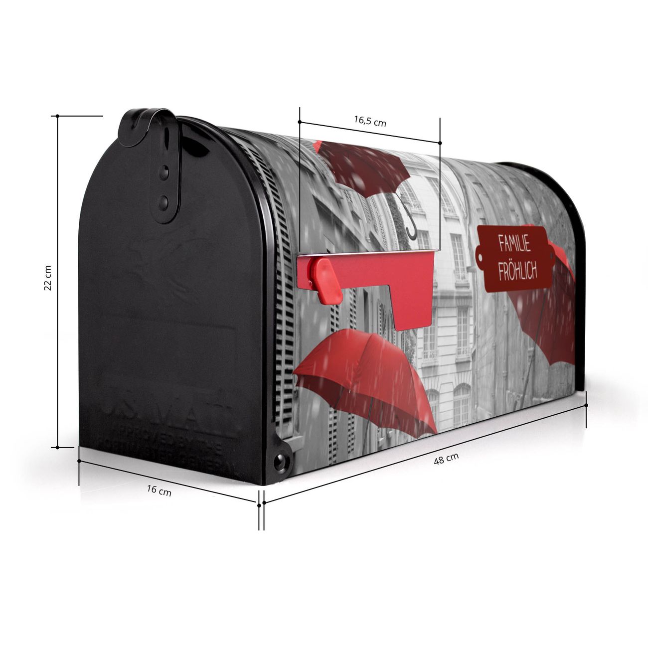 Der amerikanische Briefkasten von banjado mit Rote Schirme Motiv bietet Ihnen ausreichend Fassungsvermögen, um große A4 Sendungen und Zeitschriften zu empfangen. Die typisch amerikanische rote Fahne zeigt Ihnen an, wenn Sie Post erhalten haben. Die US-Mailbox besteht aus verzinktem Stahlblech welches lackiert wurde und ist 48 x 22 x 16 CM (BxHxT) groß. Die Folie mit Motiv Rote Schirme besteht aus einer wetter- und UV-resistenten Folie, die mit einem Schutzlaminat überzogen ist, sodass die US Mailbox zusätzlich vor Kratzern geschützt ist. An der Unterkante sind 4 Löcher je Seite um die Mailbox, typisch amerikanisch, an einem Holzpfahl oder einem Zaun zu befestigen. Auf Wunsch können Sie bei uns den passenden Standfuß oder die passende Wandhalterung kaufen um die US-Mailbox sicher zu befestigen. Wir bieten Ihnen ebenfalls Namensschilder, bereits beschriftet oder frei zu beschriften, und verschiedene selbst gestaltete Bitte-Keine-Werbung-Aufkleber.