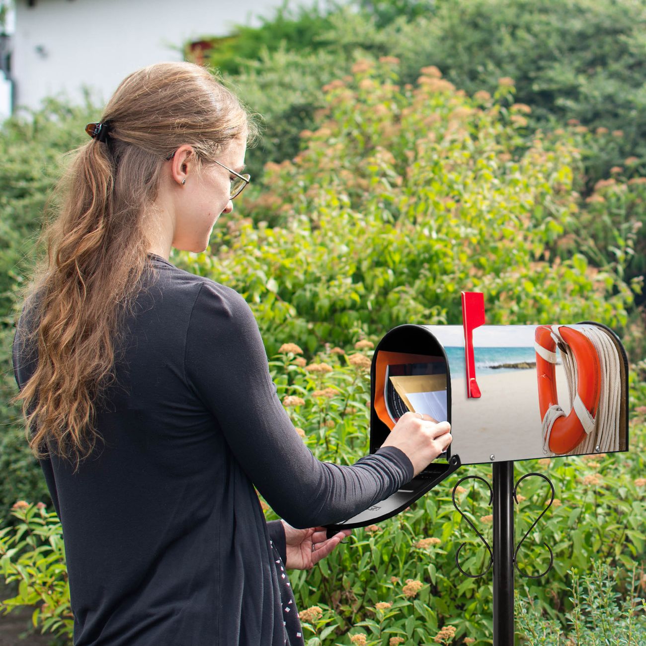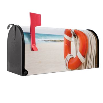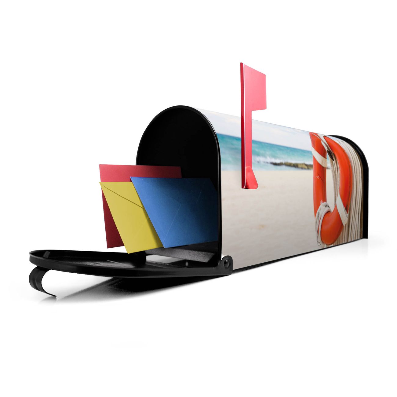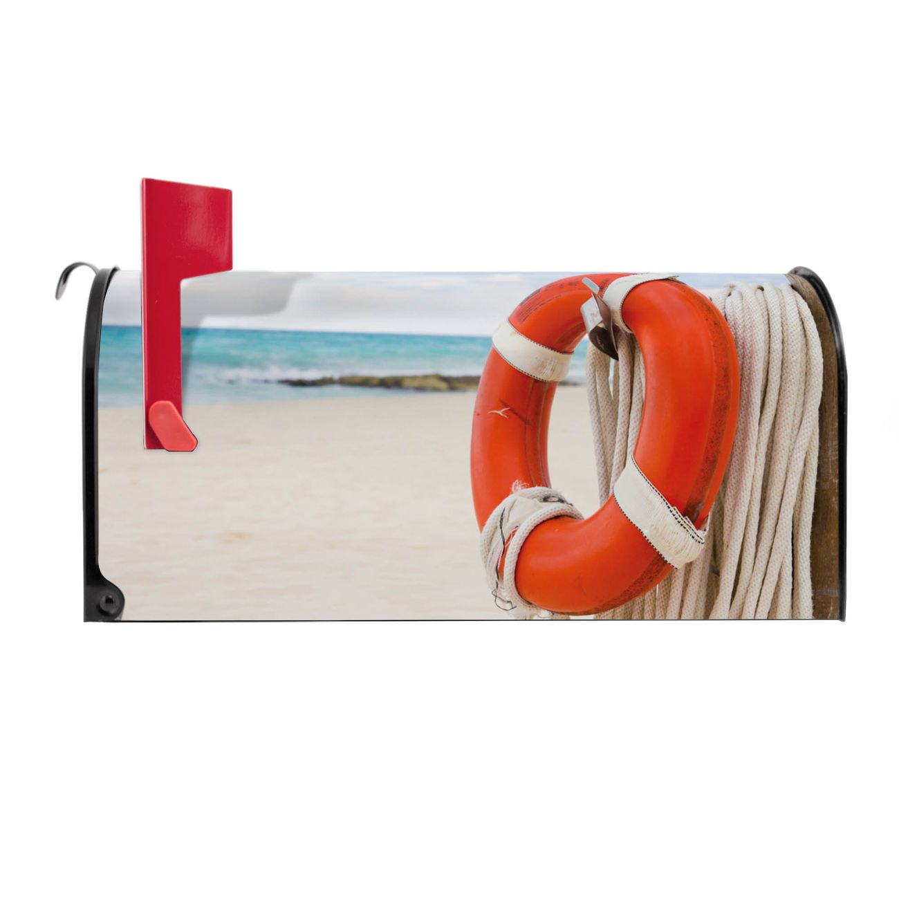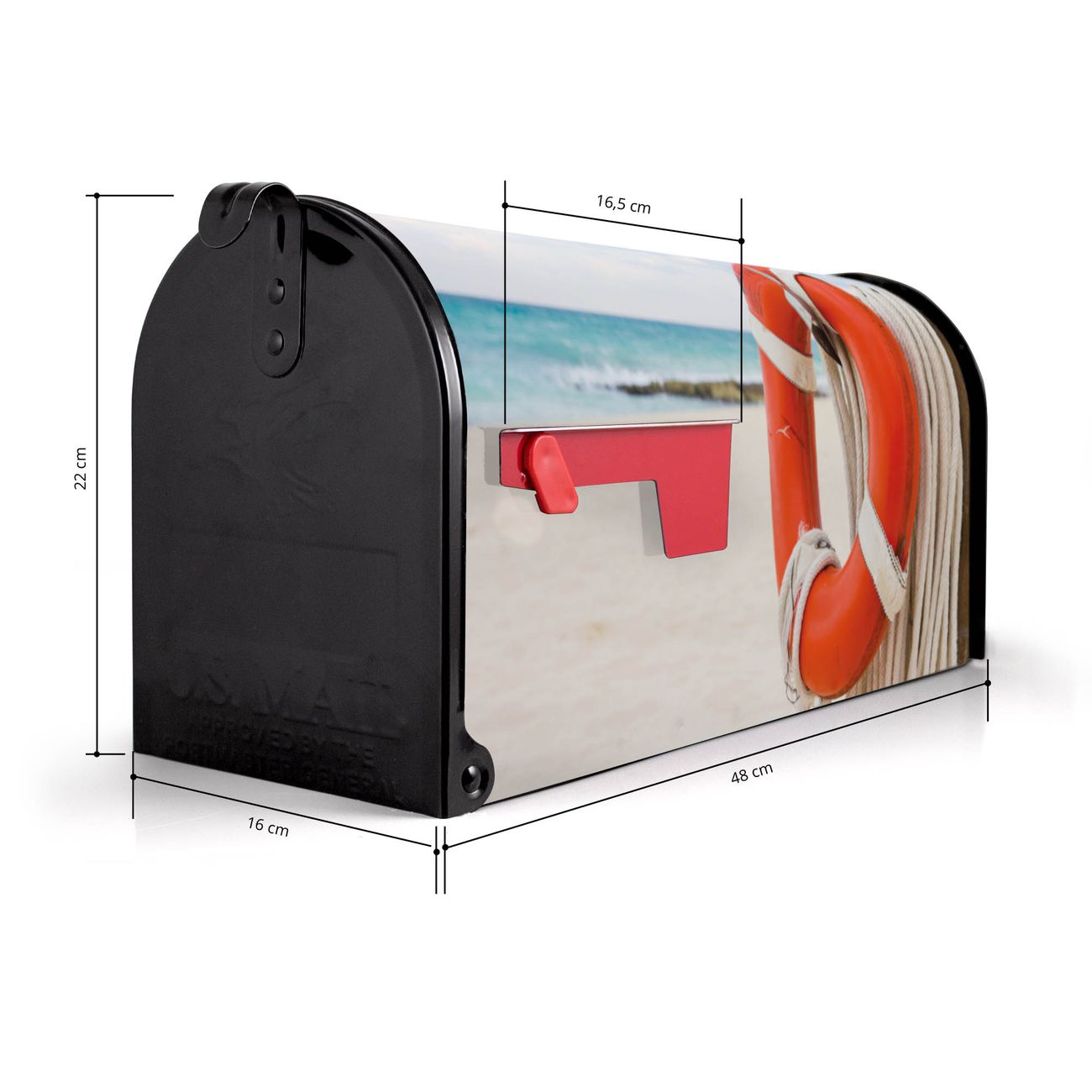 Der amerikanische Briefkasten von banjado mit Roter Rettungsring Motiv bietet Ihnen ausreichend Fassungsvermögen, um große A4 Sendungen und Zeitschriften zu empfangen. Die typisch amerikanische rote Fahne zeigt Ihnen an, wenn Sie Post erhalten haben. Die US-Mailbox besteht aus verzinktem Stahlblech welches lackiert wurde und ist 48 x 22 x 16 CM (BxHxT) groß. Die Folie mit Motiv Roter Rettungsring besteht aus einer wetter- und UV-resistenten Folie, die mit einem Schutzlaminat überzogen ist, sodass die US Mailbox zusätzlich vor Kratzern geschützt ist. An der Unterkante sind 4 Löcher je Seite um die Mailbox, typisch amerikanisch, an einem Holzpfahl oder einem Zaun zu befestigen. Auf Wunsch können Sie bei uns den passenden Standfuß oder die passende Wandhalterung kaufen um die US-Mailbox sicher zu befestigen. Wir bieten Ihnen ebenfalls Namensschilder, bereits beschriftet oder frei zu beschriften, und verschiedene selbst gestaltete Bitte-Keine-Werbung-Aufkleber.
