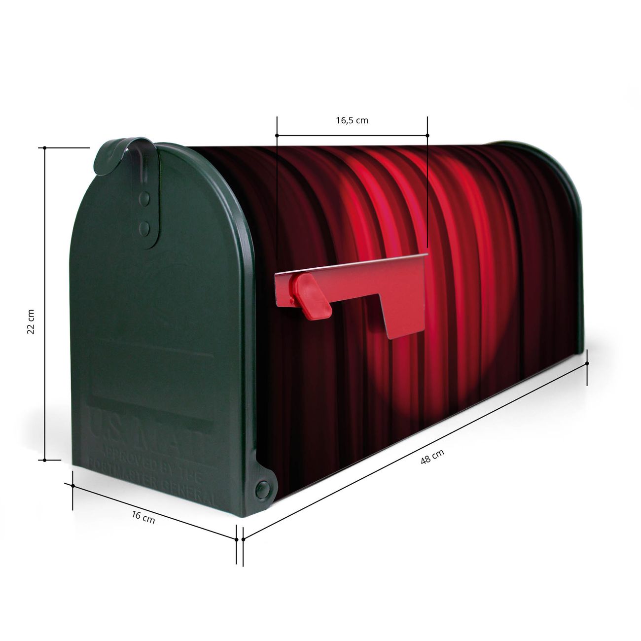 Der amerikanische Briefkasten von banjado mit Roter Vorhang Motiv bietet Ihnen ausreichend Fassungsvermögen, um große A4 Sendungen und Zeitschriften zu empfangen. Die typisch amerikanische rote Fahne zeigt Ihnen an, wenn Sie Post erhalten haben. Die US-Mailbox besteht aus verzinktem Stahlblech welches lackiert wurde und ist 48 x 22 x 16 CM (BxHxT) groß. Die Folie mit Motiv Roter Vorhang besteht aus einer wetter- und UV-resistenten Folie, die mit einem Schutzlaminat überzogen ist, sodass die US Mailbox zusätzlich vor Kratzern geschützt ist. An der Unterkante sind 4 Löcher je Seite um die Mailbox, typisch amerikanisch, an einem Holzpfahl oder einem Zaun zu befestigen. Auf Wunsch können Sie bei uns den passenden Standfuß oder die passende Wandhalterung kaufen um die US-Mailbox sicher zu befestigen. Wir bieten Ihnen ebenfalls Namensschilder, bereits beschriftet oder frei zu beschriften, und verschiedene selbst gestaltete Bitte-Keine-Werbung-Aufkleber.
