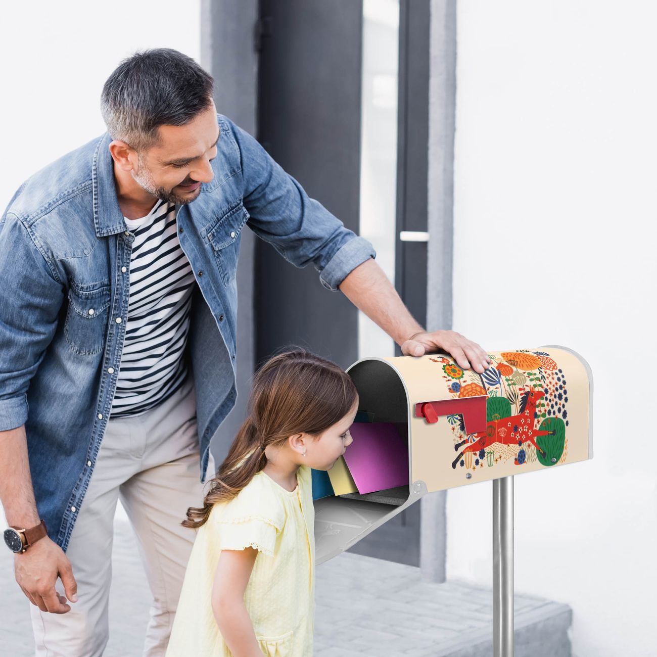 Der amerikanische Briefkasten von banjado mit Rotes Pferd Motiv bietet Ihnen ausreichend Fassungsvermögen, um große A4 Sendungen und Zeitschriften zu empfangen. Die typisch amerikanische rote Fahne zeigt Ihnen an, wenn Sie Post erhalten haben. Die US-Mailbox besteht aus verzinktem Stahlblech welches lackiert wurde und ist 48 x 22 x 16 CM (BxHxT) groß. Die Folie mit Motiv Rotes Pferd besteht aus einer wetter- und UV-resistenten Folie, die mit einem Schutzlaminat überzogen ist, sodass die US Mailbox zusätzlich vor Kratzern geschützt ist. An der Unterkante sind 4 Löcher je Seite um die Mailbox, typisch amerikanisch, an einem Holzpfahl oder einem Zaun zu befestigen. Auf Wunsch können Sie bei uns den passenden Standfuß oder die passende Wandhalterung kaufen um die US-Mailbox sicher zu befestigen. Wir bieten Ihnen ebenfalls Namensschilder, bereits beschriftet oder frei zu beschriften, und verschiedene selbst gestaltete Bitte-Keine-Werbung-Aufkleber.