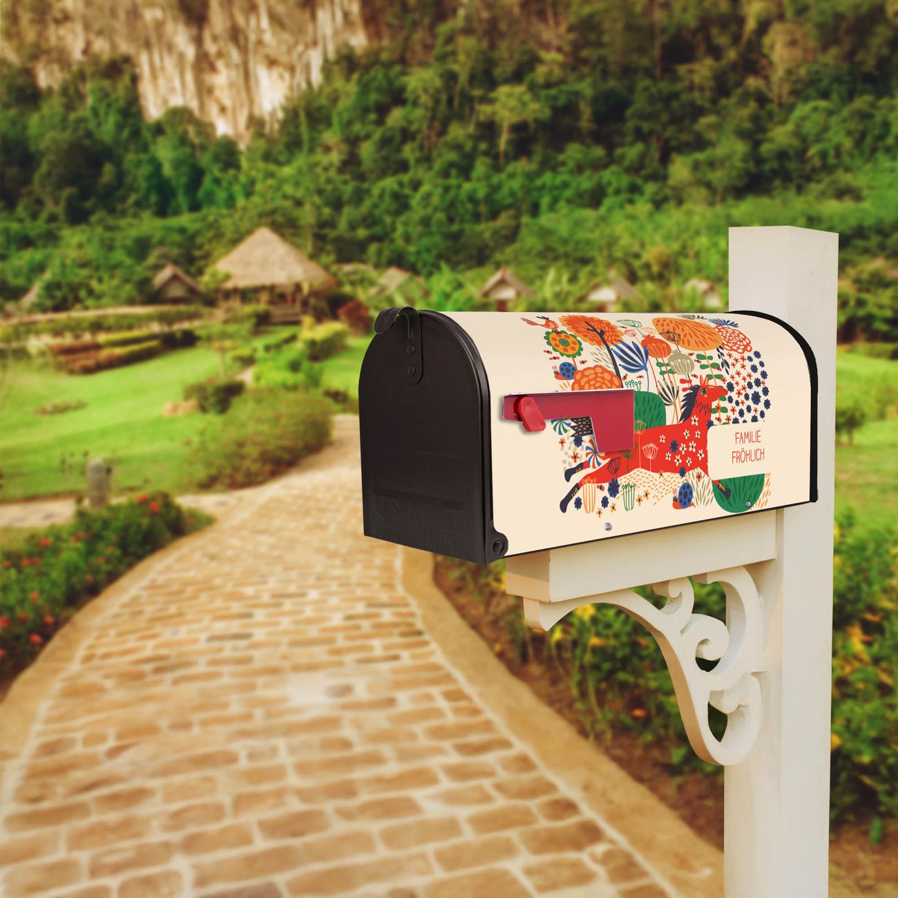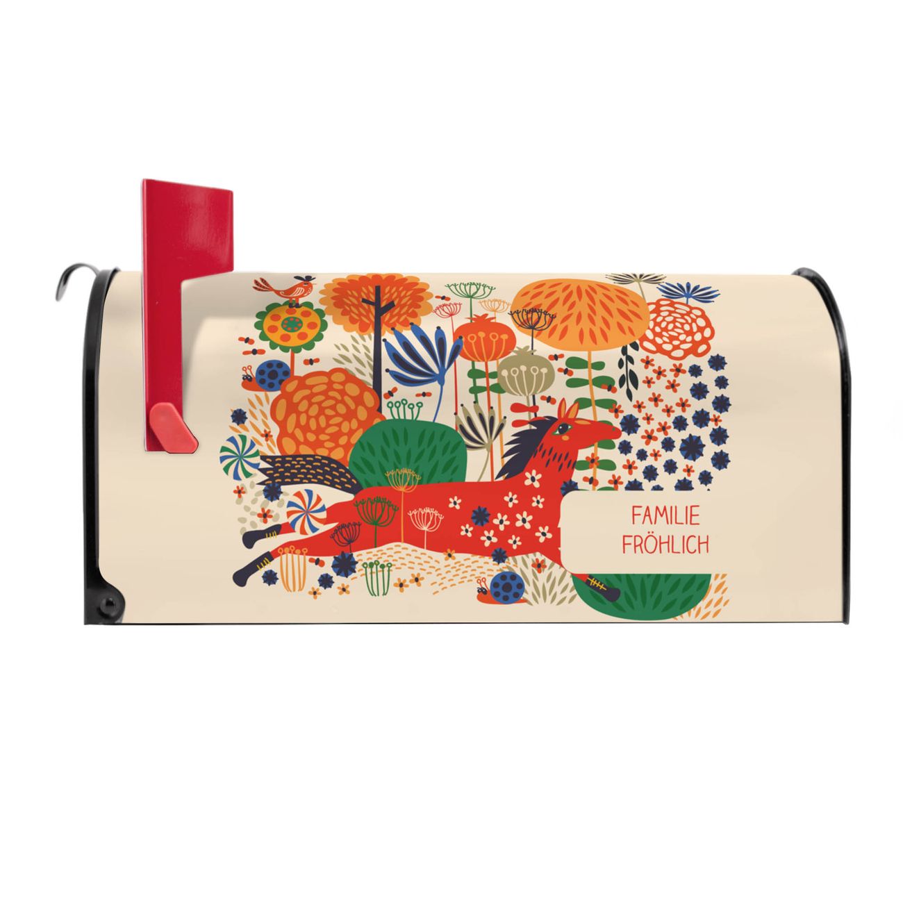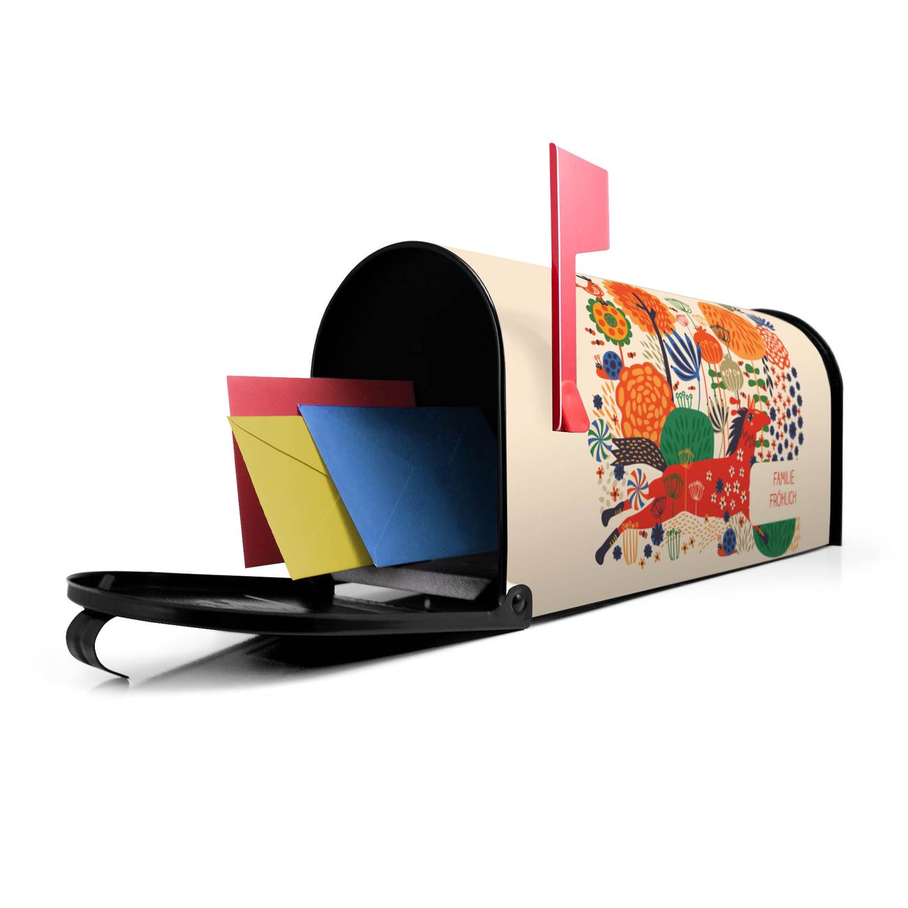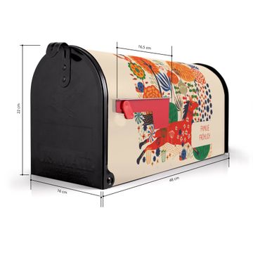 Der amerikanische Briefkasten von banjado mit Rotes Pferd Motiv bietet Ihnen ausreichend Fassungsvermögen, um große A4 Sendungen und Zeitschriften zu empfangen. Die typisch amerikanische rote Fahne zeigt Ihnen an, wenn Sie Post erhalten haben. Die US-Mailbox besteht aus verzinktem Stahlblech welches lackiert wurde und ist 48 x 22 x 16 CM (BxHxT) groß. Die Folie mit Motiv Rotes Pferd besteht aus einer wetter- und UV-resistenten Folie, die mit einem Schutzlaminat überzogen ist, sodass die US Mailbox zusätzlich vor Kratzern geschützt ist. An der Unterkante sind 4 Löcher je Seite um die Mailbox, typisch amerikanisch, an einem Holzpfahl oder einem Zaun zu befestigen. Auf Wunsch können Sie bei uns den passenden Standfuß oder die passende Wandhalterung kaufen um die US-Mailbox sicher zu befestigen. Wir bieten Ihnen ebenfalls Namensschilder, bereits beschriftet oder frei zu beschriften, und verschiedene selbst gestaltete Bitte-Keine-Werbung-Aufkleber.
