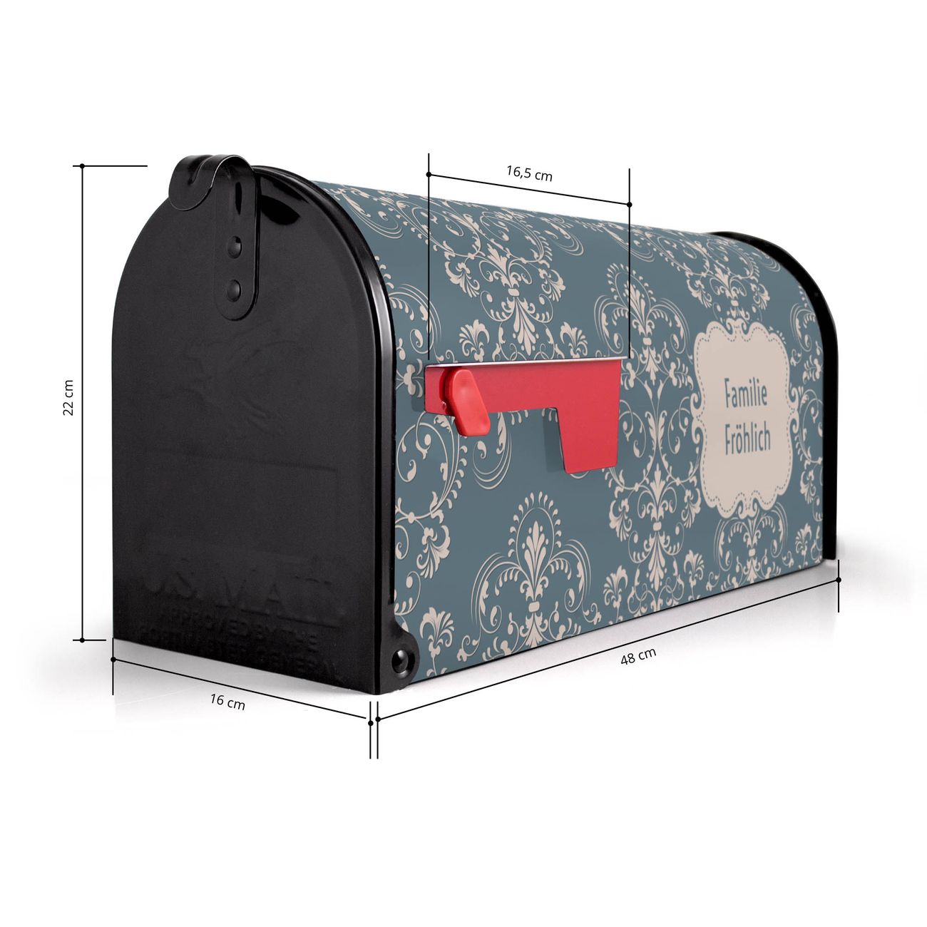 Der amerikanische Briefkasten von banjado mit Royal Creme Blau Motiv bietet Ihnen ausreichend Fassungsvermögen, um große A4 Sendungen und Zeitschriften zu empfangen. Die typisch amerikanische rote Fahne zeigt Ihnen an, wenn Sie Post erhalten haben. Die US-Mailbox besteht aus verzinktem Stahlblech welches lackiert wurde und ist 48 x 22 x 16 CM (BxHxT) groß. Die Folie mit Motiv Royal Creme Blau besteht aus einer wetter- und UV-resistenten Folie, die mit einem Schutzlaminat überzogen ist, sodass die US Mailbox zusätzlich vor Kratzern geschützt ist. An der Unterkante sind 4 Löcher je Seite um die Mailbox, typisch amerikanisch, an einem Holzpfahl oder einem Zaun zu befestigen. Auf Wunsch können Sie bei uns den passenden Standfuß oder die passende Wandhalterung kaufen um die US-Mailbox sicher zu befestigen. Wir bieten Ihnen ebenfalls Namensschilder, bereits beschriftet oder frei zu beschriften, und verschiedene selbst gestaltete Bitte-Keine-Werbung-Aufkleber.