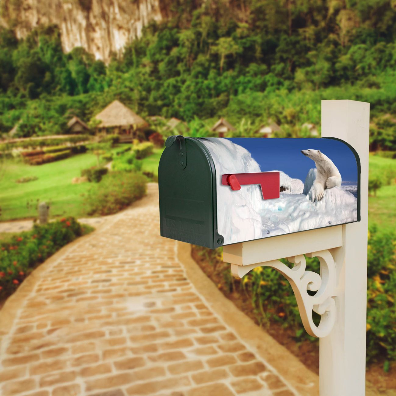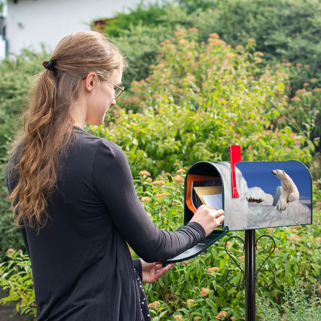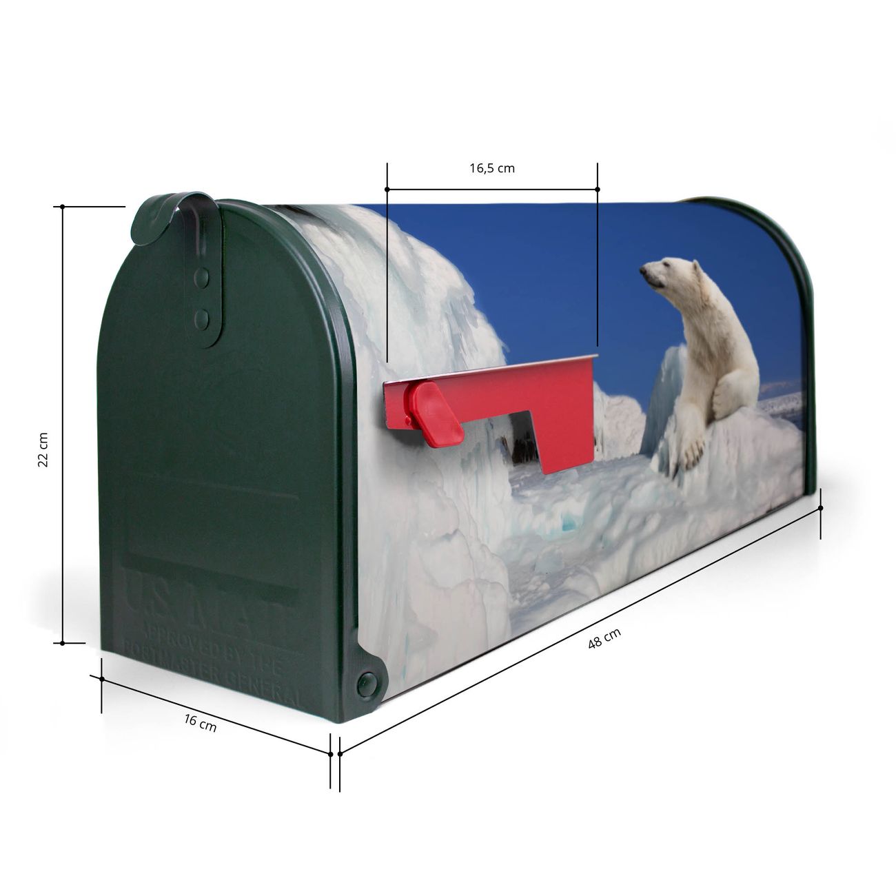 Der amerikanische Briefkasten von banjado mit Ruhender Eisbär Motiv bietet Ihnen ausreichend Fassungsvermögen, um große A4 Sendungen und Zeitschriften zu empfangen. Die typisch amerikanische rote Fahne zeigt Ihnen an, wenn Sie Post erhalten haben. Die US-Mailbox besteht aus verzinktem Stahlblech welches lackiert wurde und ist 48 x 22 x 16 CM (BxHxT) groß. Die Folie mit Motiv Ruhender Eisbär besteht aus einer wetter- und UV-resistenten Folie, die mit einem Schutzlaminat überzogen ist, sodass die US Mailbox zusätzlich vor Kratzern geschützt ist. An der Unterkante sind 4 Löcher je Seite um die Mailbox, typisch amerikanisch, an einem Holzpfahl oder einem Zaun zu befestigen. Auf Wunsch können Sie bei uns den passenden Standfuß oder die passende Wandhalterung kaufen um die US-Mailbox sicher zu befestigen. Wir bieten Ihnen ebenfalls Namensschilder, bereits beschriftet oder frei zu beschriften, und verschiedene selbst gestaltete Bitte-Keine-Werbung-Aufkleber.