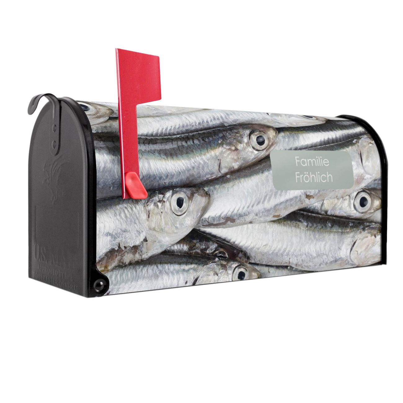 Der amerikanische Briefkasten von banjado mit Sardinen Motiv bietet Ihnen ausreichend Fassungsvermögen, um große A4 Sendungen und Zeitschriften zu empfangen. Die typisch amerikanische rote Fahne zeigt Ihnen an, wenn Sie Post erhalten haben. Die US-Mailbox besteht aus verzinktem Stahlblech welches lackiert wurde und ist 48 x 22 x 16 CM (BxHxT) groß. Die Folie mit Motiv Sardinen besteht aus einer wetter- und UV-resistenten Folie, die mit einem Schutzlaminat überzogen ist, sodass die US Mailbox zusätzlich vor Kratzern geschützt ist. An der Unterkante sind 4 Löcher je Seite um die Mailbox, typisch amerikanisch, an einem Holzpfahl oder einem Zaun zu befestigen. Auf Wunsch können Sie bei uns den passenden Standfuß oder die passende Wandhalterung kaufen um die US-Mailbox sicher zu befestigen. Wir bieten Ihnen ebenfalls Namensschilder, bereits beschriftet oder frei zu beschriften, und verschiedene selbst gestaltete Bitte-Keine-Werbung-Aufkleber.