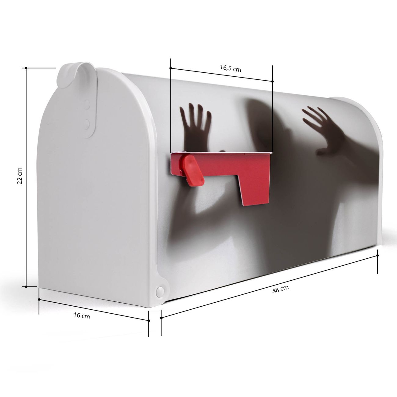 Der amerikanische Briefkasten von banjado mit Schattenspiel Motiv bietet Ihnen ausreichend Fassungsvermögen, um große A4 Sendungen und Zeitschriften zu empfangen. Die typisch amerikanische rote Fahne zeigt Ihnen an, wenn Sie Post erhalten haben. Die US-Mailbox besteht aus verzinktem Stahlblech welches lackiert wurde und ist 48 x 22 x 16 CM (BxHxT) groß. Die Folie mit Motiv Schattenspiel besteht aus einer wetter- und UV-resistenten Folie, die mit einem Schutzlaminat überzogen ist, sodass die US Mailbox zusätzlich vor Kratzern geschützt ist. An der Unterkante sind 4 Löcher je Seite um die Mailbox, typisch amerikanisch, an einem Holzpfahl oder einem Zaun zu befestigen. Auf Wunsch können Sie bei uns den passenden Standfuß oder die passende Wandhalterung kaufen um die US-Mailbox sicher zu befestigen. Wir bieten Ihnen ebenfalls Namensschilder, bereits beschriftet oder frei zu beschriften, und verschiedene selbst gestaltete Bitte-Keine-Werbung-Aufkleber.