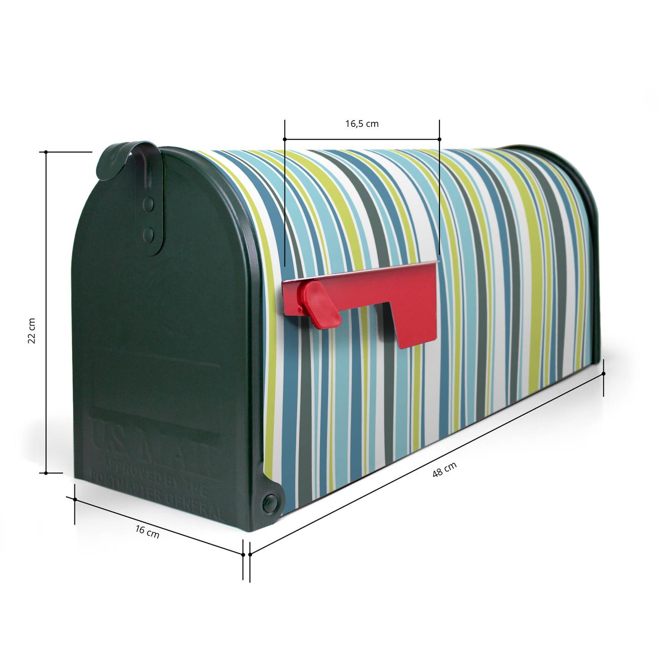 Der amerikanische Briefkasten von banjado mit Schilf Abstrakt Motiv bietet Ihnen ausreichend Fassungsvermögen, um große A4 Sendungen und Zeitschriften zu empfangen. Die typisch amerikanische rote Fahne zeigt Ihnen an, wenn Sie Post erhalten haben. Die US-Mailbox besteht aus verzinktem Stahlblech welches lackiert wurde und ist 48 x 22 x 16 CM (BxHxT) groß. Die Folie mit Motiv Schilf Abstrakt besteht aus einer wetter- und UV-resistenten Folie, die mit einem Schutzlaminat überzogen ist, sodass die US Mailbox zusätzlich vor Kratzern geschützt ist. An der Unterkante sind 4 Löcher je Seite um die Mailbox, typisch amerikanisch, an einem Holzpfahl oder einem Zaun zu befestigen. Auf Wunsch können Sie bei uns den passenden Standfuß oder die passende Wandhalterung kaufen um die US-Mailbox sicher zu befestigen. Wir bieten Ihnen ebenfalls Namensschilder, bereits beschriftet oder frei zu beschriften, und verschiedene selbst gestaltete Bitte-Keine-Werbung-Aufkleber.