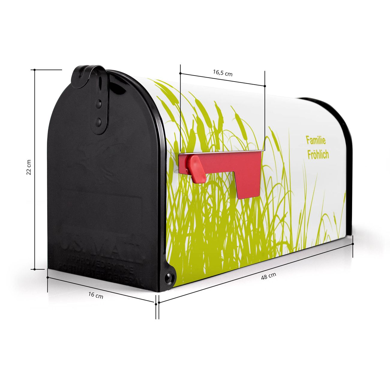 Der amerikanische Briefkasten von banjado mit Schilf Motiv bietet Ihnen ausreichend Fassungsvermögen, um große A4 Sendungen und Zeitschriften zu empfangen. Die typisch amerikanische rote Fahne zeigt Ihnen an, wenn Sie Post erhalten haben. Die US-Mailbox besteht aus verzinktem Stahlblech welches lackiert wurde und ist 48 x 22 x 16 CM (BxHxT) groß. Die Folie mit Motiv Schilf besteht aus einer wetter- und UV-resistenten Folie, die mit einem Schutzlaminat überzogen ist, sodass die US Mailbox zusätzlich vor Kratzern geschützt ist. An der Unterkante sind 4 Löcher je Seite um die Mailbox, typisch amerikanisch, an einem Holzpfahl oder einem Zaun zu befestigen. Auf Wunsch können Sie bei uns den passenden Standfuß oder die passende Wandhalterung kaufen um die US-Mailbox sicher zu befestigen. Wir bieten Ihnen ebenfalls Namensschilder, bereits beschriftet oder frei zu beschriften, und verschiedene selbst gestaltete Bitte-Keine-Werbung-Aufkleber.
