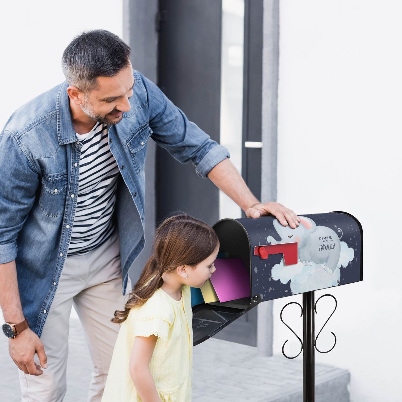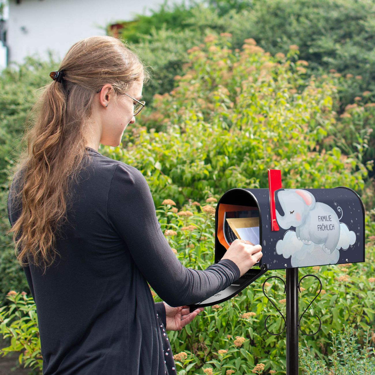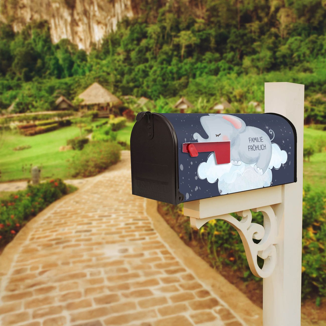 Unser amerikanischer Briefkasten mit dem Motiv schlafender Elefant hat ein sehr ansprechendes und ausgefallenes Design, ist in der Grundfarbe weiß, grün oder schwarz erhältlich. Damit entlocken Sie Ihren Nachbarn und dem Postboten immer wieder ein Lächeln. Die Mailbox ist ein Original Import aus Mississippi USA und wird von unserer kleinen Manufaktur in Sachsen von Hand veredelt. Die US-Mailbox bietet ausreichend Platz auch für große Sendungen, eine Fahne die Ihnen Post anzeigt, wetterfestes und äußerst stabiles Material - so macht Post empfangen Freude.