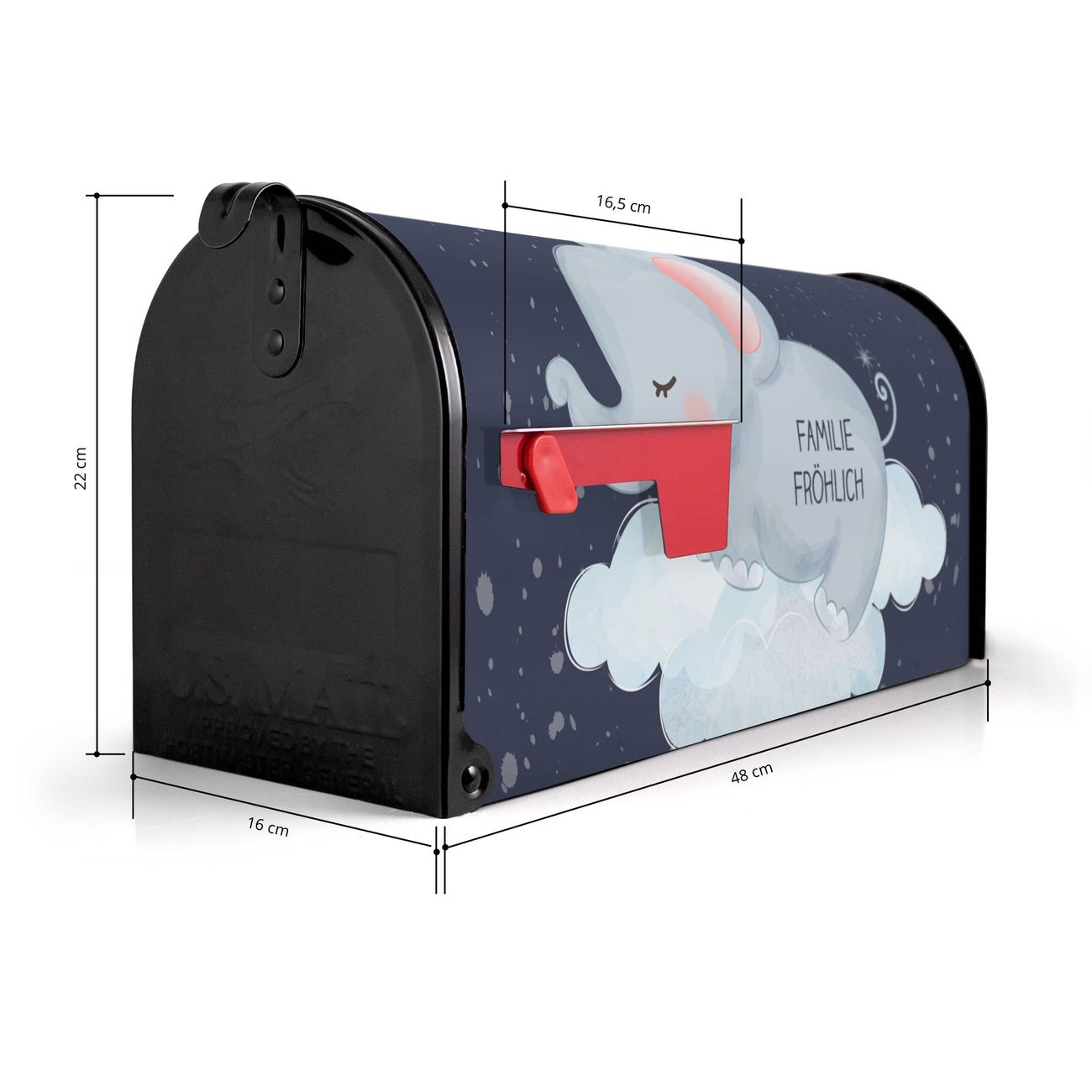 Der amerikanische Briefkasten von banjado mit schlafender Elefant Motiv bietet Ihnen ausreichend Fassungsvermögen, um große A4 Sendungen und Zeitschriften zu empfangen. Die typisch amerikanische rote Fahne zeigt Ihnen an, wenn Sie Post erhalten haben. Die US-Mailbox besteht aus verzinktem Stahlblech welches lackiert wurde und ist 48 x 22 x 16 CM (BxHxT) groß. Die Folie mit Motiv schlafender Elefant besteht aus einer wetter- und UV-resistenten Folie, die mit einem Schutzlaminat überzogen ist, sodass die US Mailbox zusätzlich vor Kratzern geschützt ist. An der Unterkante sind 4 Löcher je Seite um die Mailbox, typisch amerikanisch, an einem Holzpfahl oder einem Zaun zu befestigen. Auf Wunsch können Sie bei uns den passenden Standfuß oder die passende Wandhalterung kaufen um die US-Mailbox sicher zu befestigen. Wir bieten Ihnen ebenfalls Namensschilder, bereits beschriftet oder frei zu beschriften, und verschiedene selbst gestaltete Bitte-Keine-Werbung-Aufkleber.
