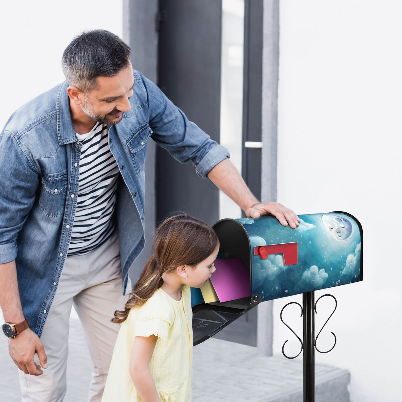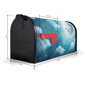 Der amerikanische Briefkasten von banjado mit schlafender Mond Motiv bietet Ihnen ausreichend Fassungsvermögen, um große A4 Sendungen und Zeitschriften zu empfangen. Die typisch amerikanische rote Fahne zeigt Ihnen an, wenn Sie Post erhalten haben. Die US-Mailbox besteht aus verzinktem Stahlblech welches lackiert wurde und ist 48 x 22 x 16 CM (BxHxT) groß. Die Folie mit Motiv schlafender Mond besteht aus einer wetter- und UV-resistenten Folie, die mit einem Schutzlaminat überzogen ist, sodass die US Mailbox zusätzlich vor Kratzern geschützt ist. An der Unterkante sind 4 Löcher je Seite um die Mailbox, typisch amerikanisch, an einem Holzpfahl oder einem Zaun zu befestigen. Auf Wunsch können Sie bei uns den passenden Standfuß oder die passende Wandhalterung kaufen um die US-Mailbox sicher zu befestigen. Wir bieten Ihnen ebenfalls Namensschilder, bereits beschriftet oder frei zu beschriften, und verschiedene selbst gestaltete Bitte-Keine-Werbung-Aufkleber.