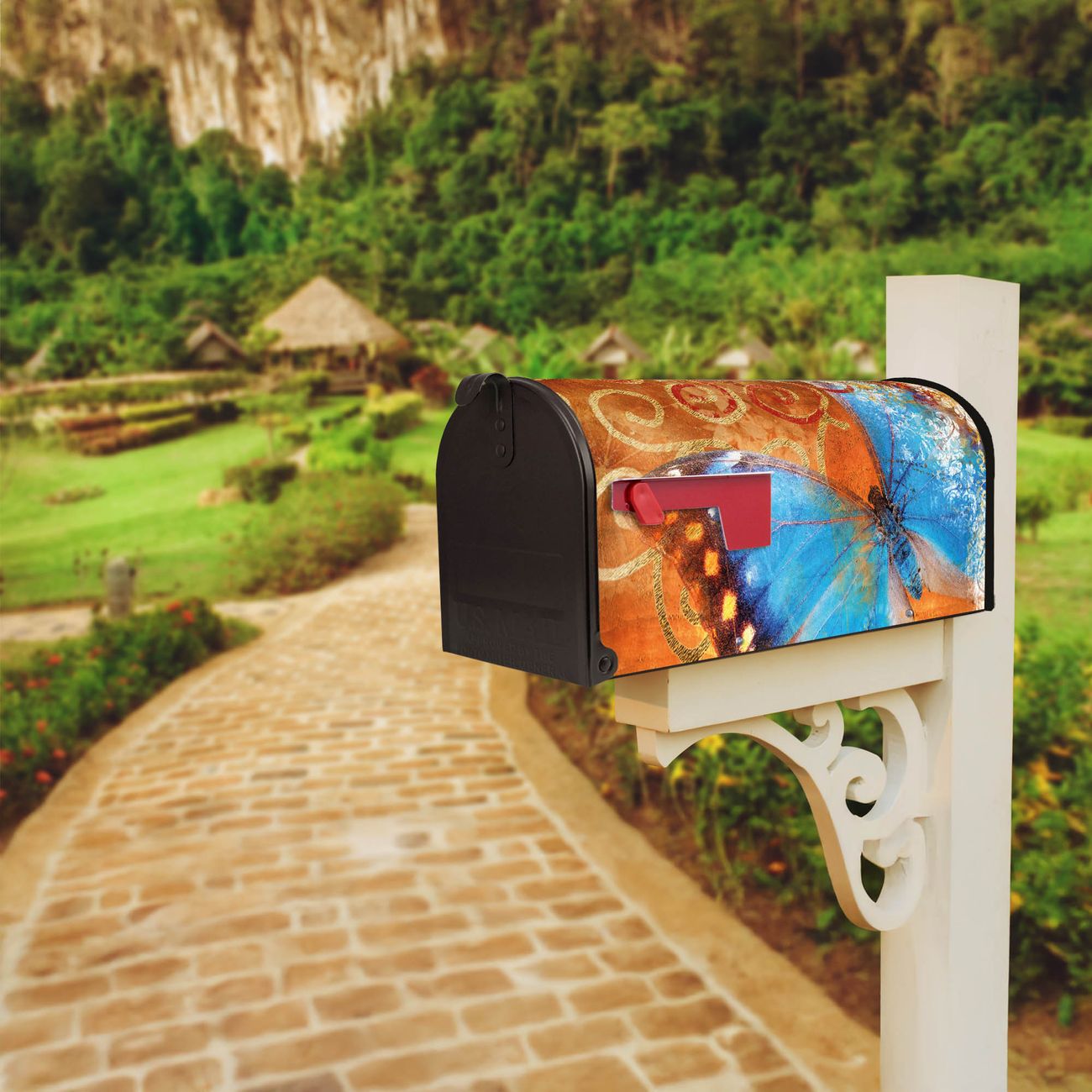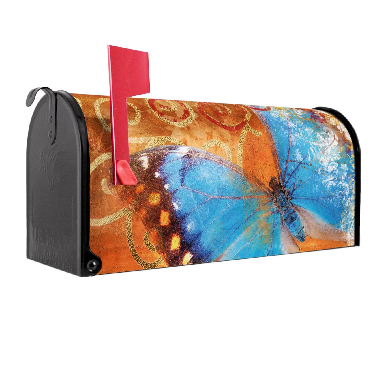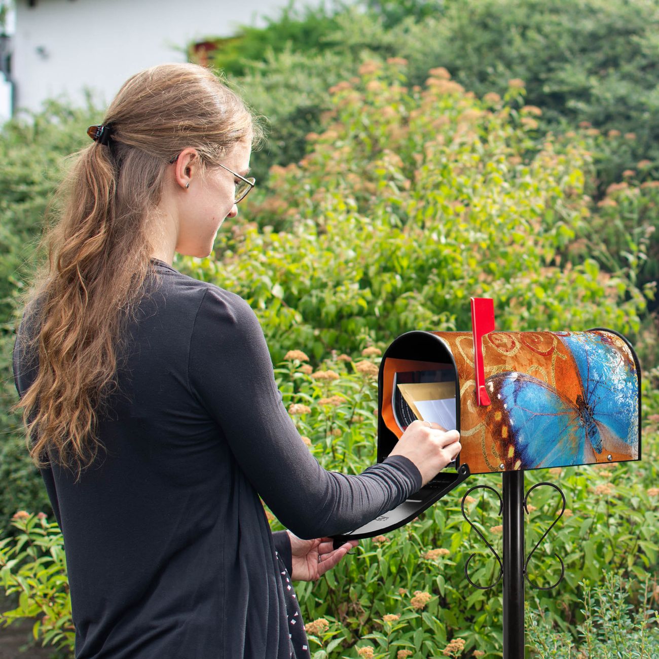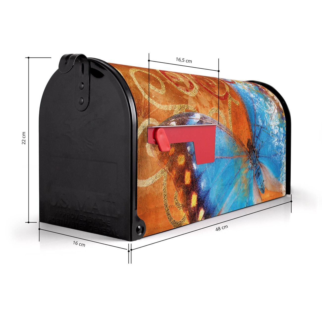 Der amerikanische Briefkasten von banjado mit Schmetterling Motiv bietet Ihnen ausreichend Fassungsvermögen, um große A4 Sendungen und Zeitschriften zu empfangen. Die typisch amerikanische rote Fahne zeigt Ihnen an, wenn Sie Post erhalten haben. Die US-Mailbox besteht aus verzinktem Stahlblech welches lackiert wurde und ist 48 x 22 x 16 CM (BxHxT) groß. Die Folie mit Motiv Schmetterling besteht aus einer wetter- und UV-resistenten Folie, die mit einem Schutzlaminat überzogen ist, sodass die US Mailbox zusätzlich vor Kratzern geschützt ist. An der Unterkante sind 4 Löcher je Seite um die Mailbox, typisch amerikanisch, an einem Holzpfahl oder einem Zaun zu befestigen. Auf Wunsch können Sie bei uns den passenden Standfuß oder die passende Wandhalterung kaufen um die US-Mailbox sicher zu befestigen. Wir bieten Ihnen ebenfalls Namensschilder, bereits beschriftet oder frei zu beschriften, und verschiedene selbst gestaltete Bitte-Keine-Werbung-Aufkleber.