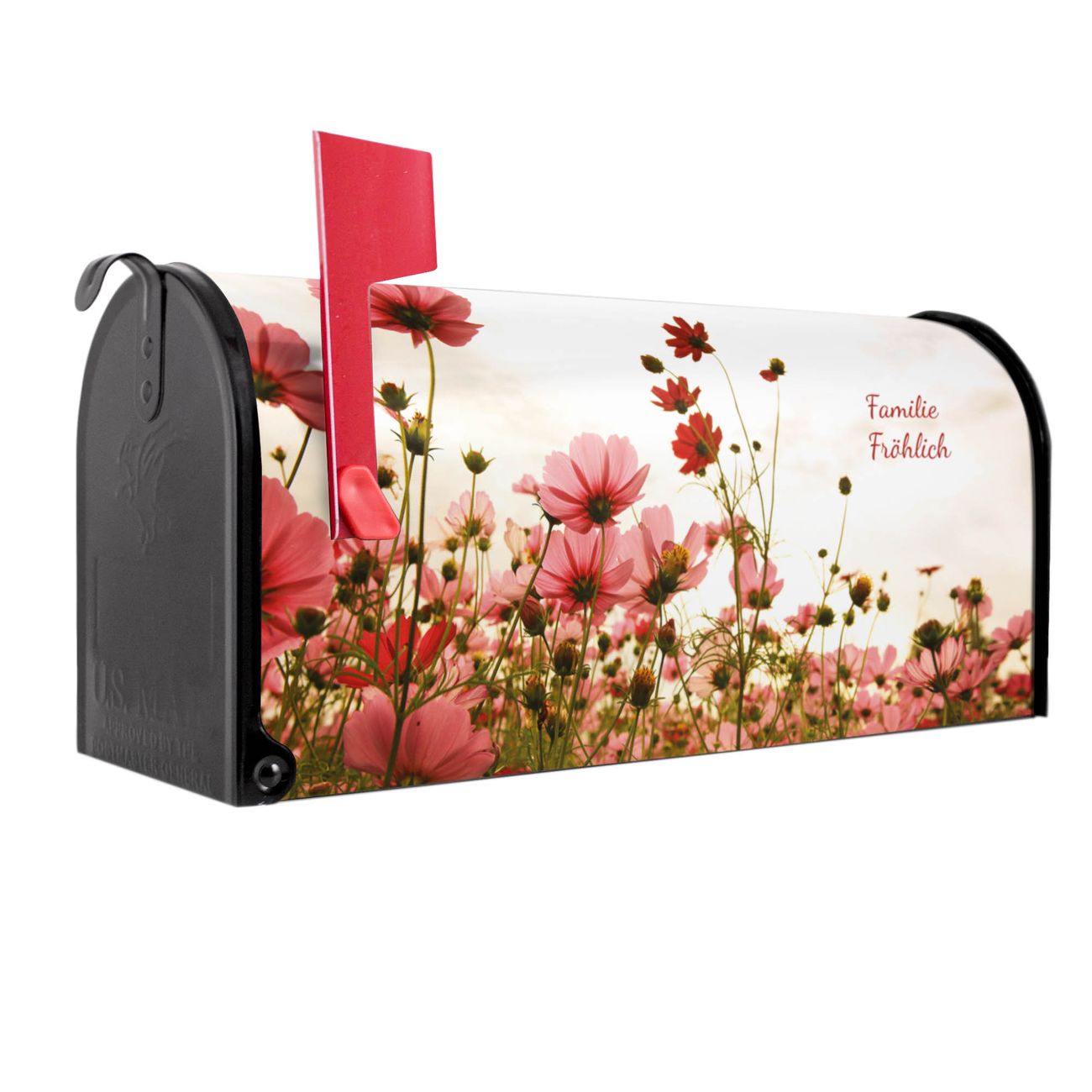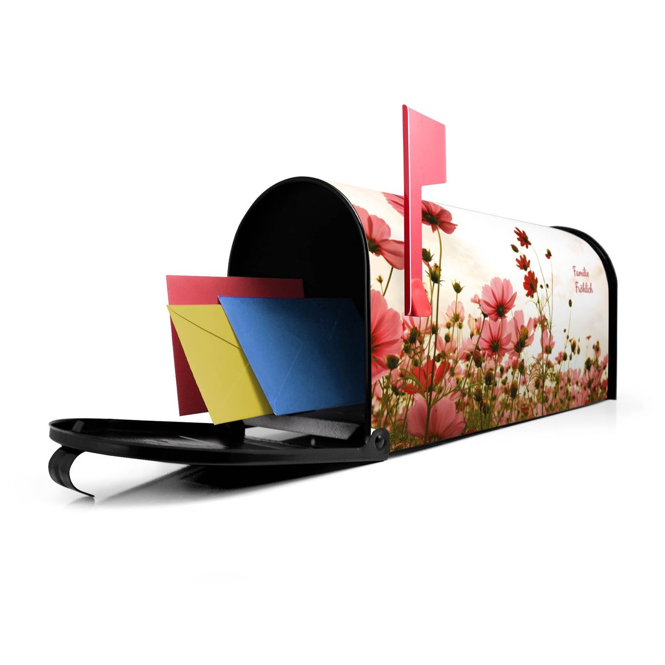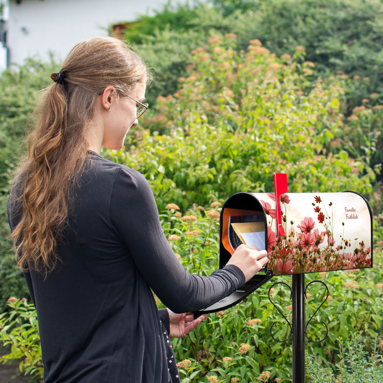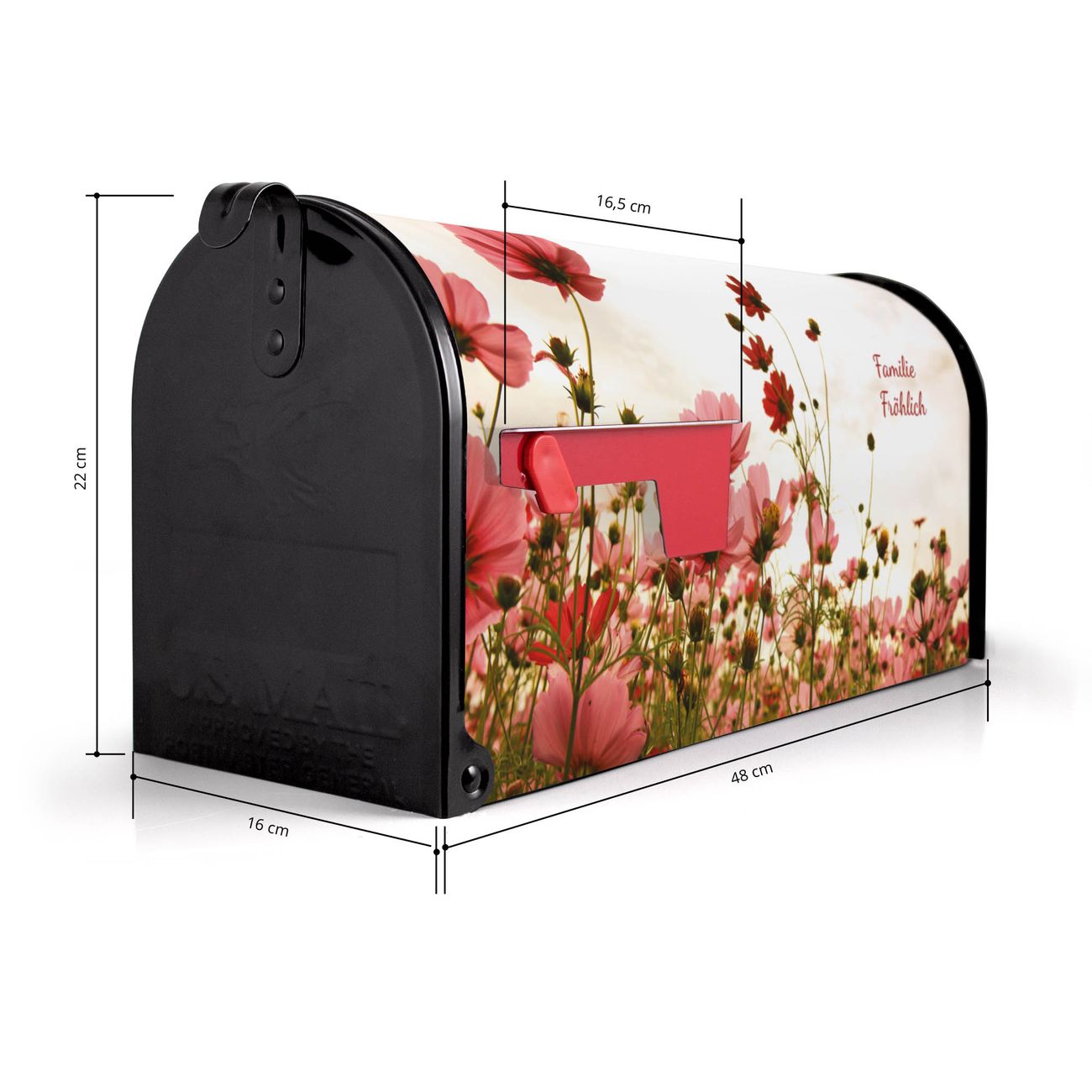 Der amerikanische Briefkasten von banjado mit Schmuckkörbchen Motiv bietet Ihnen ausreichend Fassungsvermögen, um große A4 Sendungen und Zeitschriften zu empfangen. Die typisch amerikanische rote Fahne zeigt Ihnen an, wenn Sie Post erhalten haben. Die US-Mailbox besteht aus verzinktem Stahlblech welches lackiert wurde und ist 48 x 22 x 16 CM (BxHxT) groß. Die Folie mit Motiv Schmuckkörbchen besteht aus einer wetter- und UV-resistenten Folie, die mit einem Schutzlaminat überzogen ist, sodass die US Mailbox zusätzlich vor Kratzern geschützt ist. An der Unterkante sind 4 Löcher je Seite um die Mailbox, typisch amerikanisch, an einem Holzpfahl oder einem Zaun zu befestigen. Auf Wunsch können Sie bei uns den passenden Standfuß oder die passende Wandhalterung kaufen um die US-Mailbox sicher zu befestigen. Wir bieten Ihnen ebenfalls Namensschilder, bereits beschriftet oder frei zu beschriften, und verschiedene selbst gestaltete Bitte-Keine-Werbung-Aufkleber.