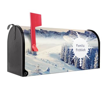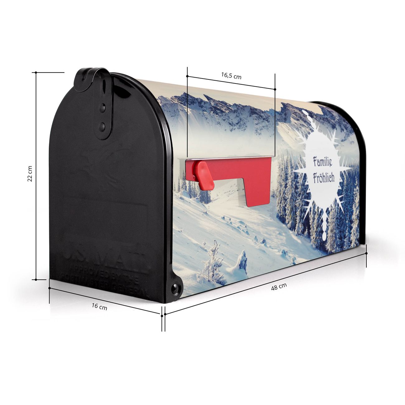 Der amerikanische Briefkasten von banjado mit Schneebedeckte Berge Motiv bietet Ihnen ausreichend Fassungsvermögen, um große A4 Sendungen und Zeitschriften zu empfangen. Die typisch amerikanische rote Fahne zeigt Ihnen an, wenn Sie Post erhalten haben. Die US-Mailbox besteht aus verzinktem Stahlblech welches lackiert wurde und ist 48 x 22 x 16 CM (BxHxT) groß. Die Folie mit Motiv Schneebedeckte Berge besteht aus einer wetter- und UV-resistenten Folie, die mit einem Schutzlaminat überzogen ist, sodass die US Mailbox zusätzlich vor Kratzern geschützt ist. An der Unterkante sind 4 Löcher je Seite um die Mailbox, typisch amerikanisch, an einem Holzpfahl oder einem Zaun zu befestigen. Auf Wunsch können Sie bei uns den passenden Standfuß oder die passende Wandhalterung kaufen um die US-Mailbox sicher zu befestigen. Wir bieten Ihnen ebenfalls Namensschilder, bereits beschriftet oder frei zu beschriften, und verschiedene selbst gestaltete Bitte-Keine-Werbung-Aufkleber.