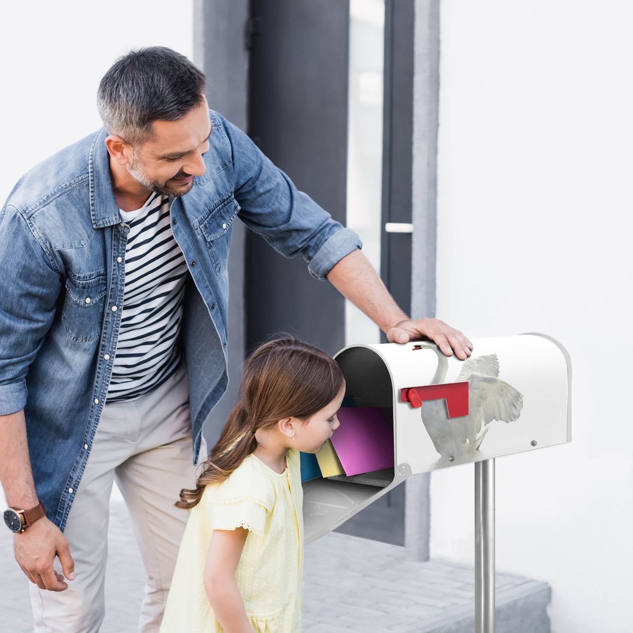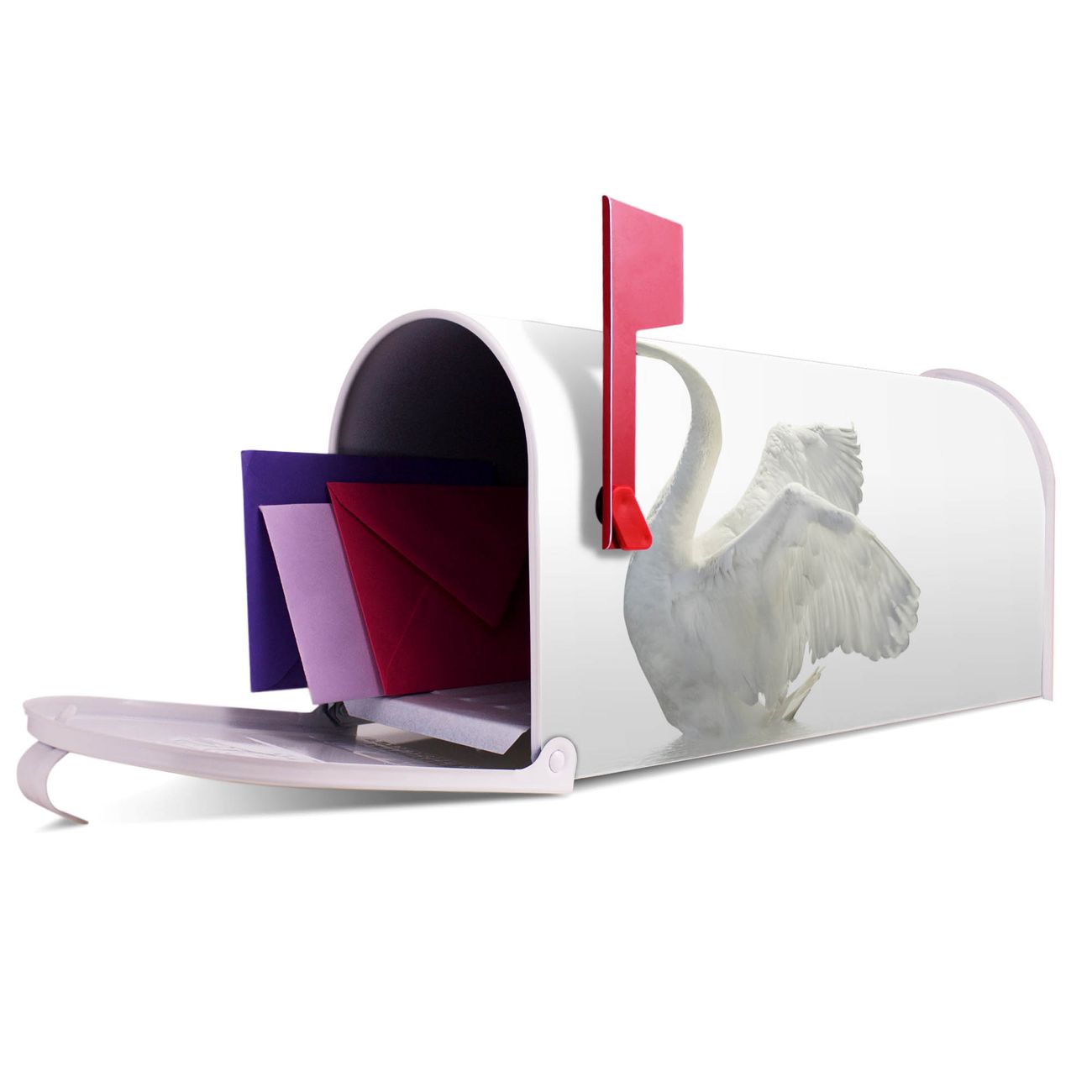 Der amerikanische Briefkasten von banjado mit Schwan Motiv bietet Ihnen ausreichend Fassungsvermögen, um große A4 Sendungen und Zeitschriften zu empfangen. Die typisch amerikanische rote Fahne zeigt Ihnen an, wenn Sie Post erhalten haben. Die US-Mailbox besteht aus verzinktem Stahlblech welches lackiert wurde und ist 48 x 22 x 16 CM (BxHxT) groß. Die Folie mit Motiv Schwan besteht aus einer wetter- und UV-resistenten Folie, die mit einem Schutzlaminat überzogen ist, sodass die US Mailbox zusätzlich vor Kratzern geschützt ist. An der Unterkante sind 4 Löcher je Seite um die Mailbox, typisch amerikanisch, an einem Holzpfahl oder einem Zaun zu befestigen. Auf Wunsch können Sie bei uns den passenden Standfuß oder die passende Wandhalterung kaufen um die US-Mailbox sicher zu befestigen. Wir bieten Ihnen ebenfalls Namensschilder, bereits beschriftet oder frei zu beschriften, und verschiedene selbst gestaltete Bitte-Keine-Werbung-Aufkleber.