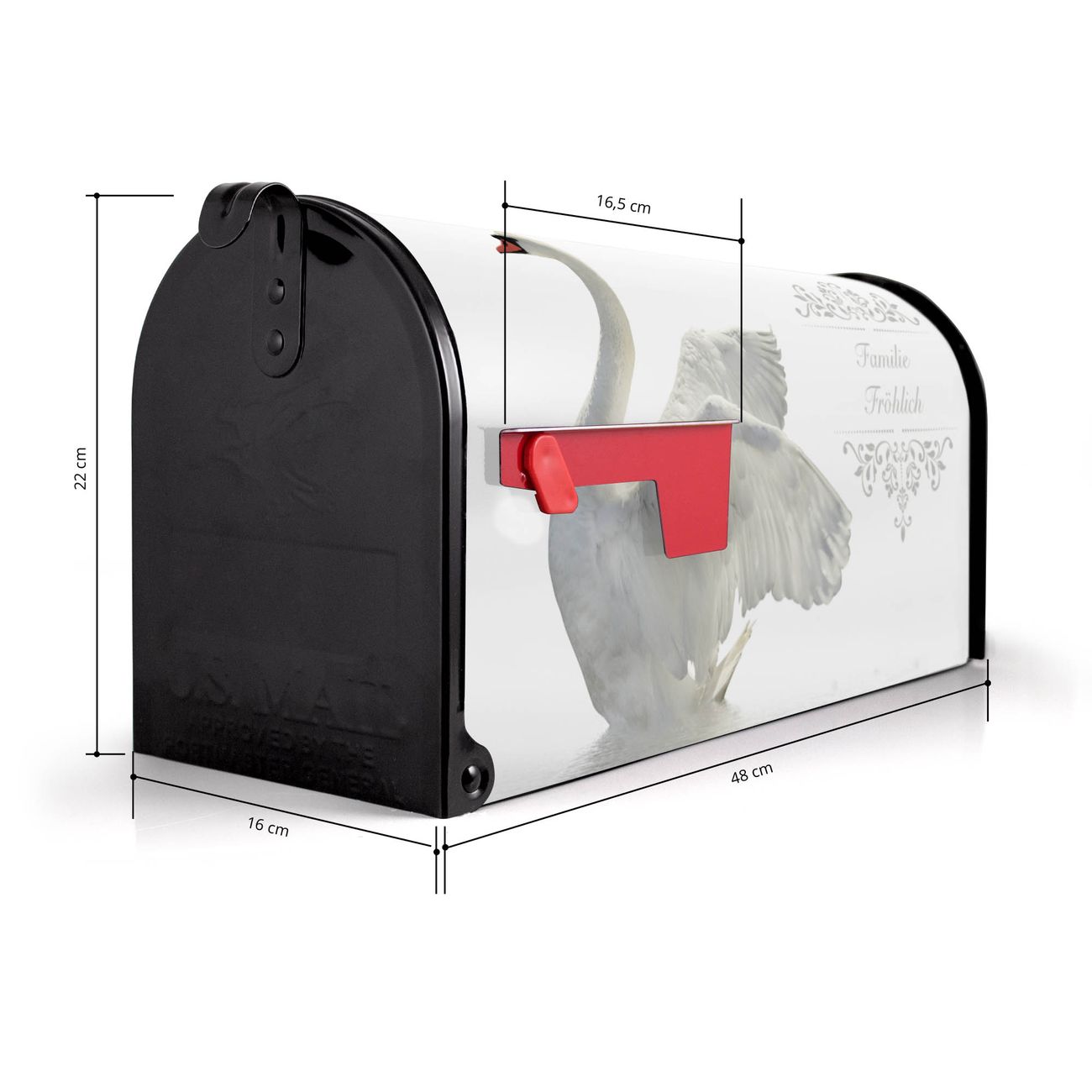Der amerikanische Briefkasten von banjado mit Schwan Motiv bietet Ihnen ausreichend Fassungsvermögen, um große A4 Sendungen und Zeitschriften zu empfangen. Die typisch amerikanische rote Fahne zeigt Ihnen an, wenn Sie Post erhalten haben. Die US-Mailbox besteht aus verzinktem Stahlblech welches lackiert wurde und ist 48 x 22 x 16 CM (BxHxT) groß. Die Folie mit Motiv Schwan besteht aus einer wetter- und UV-resistenten Folie, die mit einem Schutzlaminat überzogen ist, sodass die US Mailbox zusätzlich vor Kratzern geschützt ist. An der Unterkante sind 4 Löcher je Seite um die Mailbox, typisch amerikanisch, an einem Holzpfahl oder einem Zaun zu befestigen. Auf Wunsch können Sie bei uns den passenden Standfuß oder die passende Wandhalterung kaufen um die US-Mailbox sicher zu befestigen. Wir bieten Ihnen ebenfalls Namensschilder, bereits beschriftet oder frei zu beschriften, und verschiedene selbst gestaltete Bitte-Keine-Werbung-Aufkleber.
