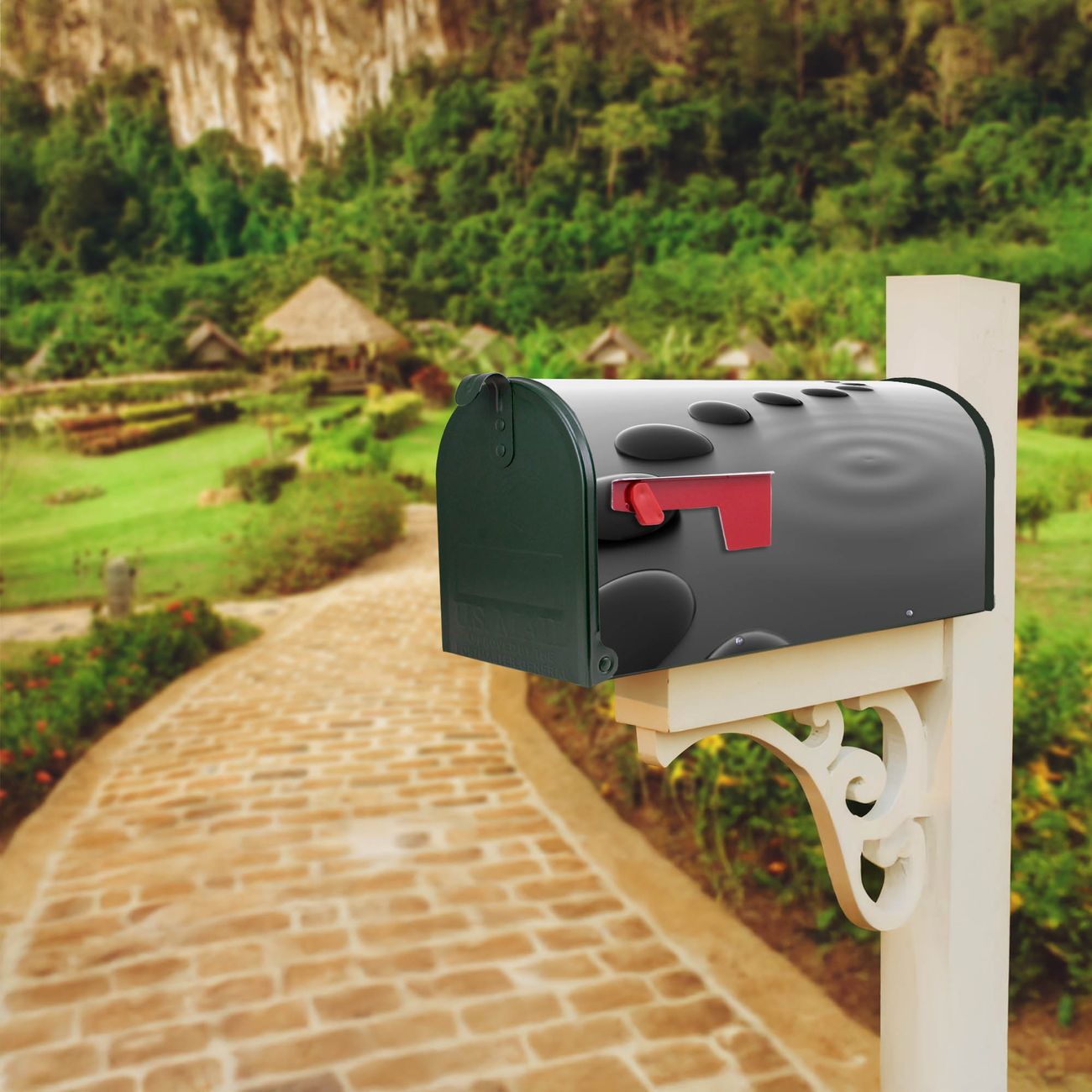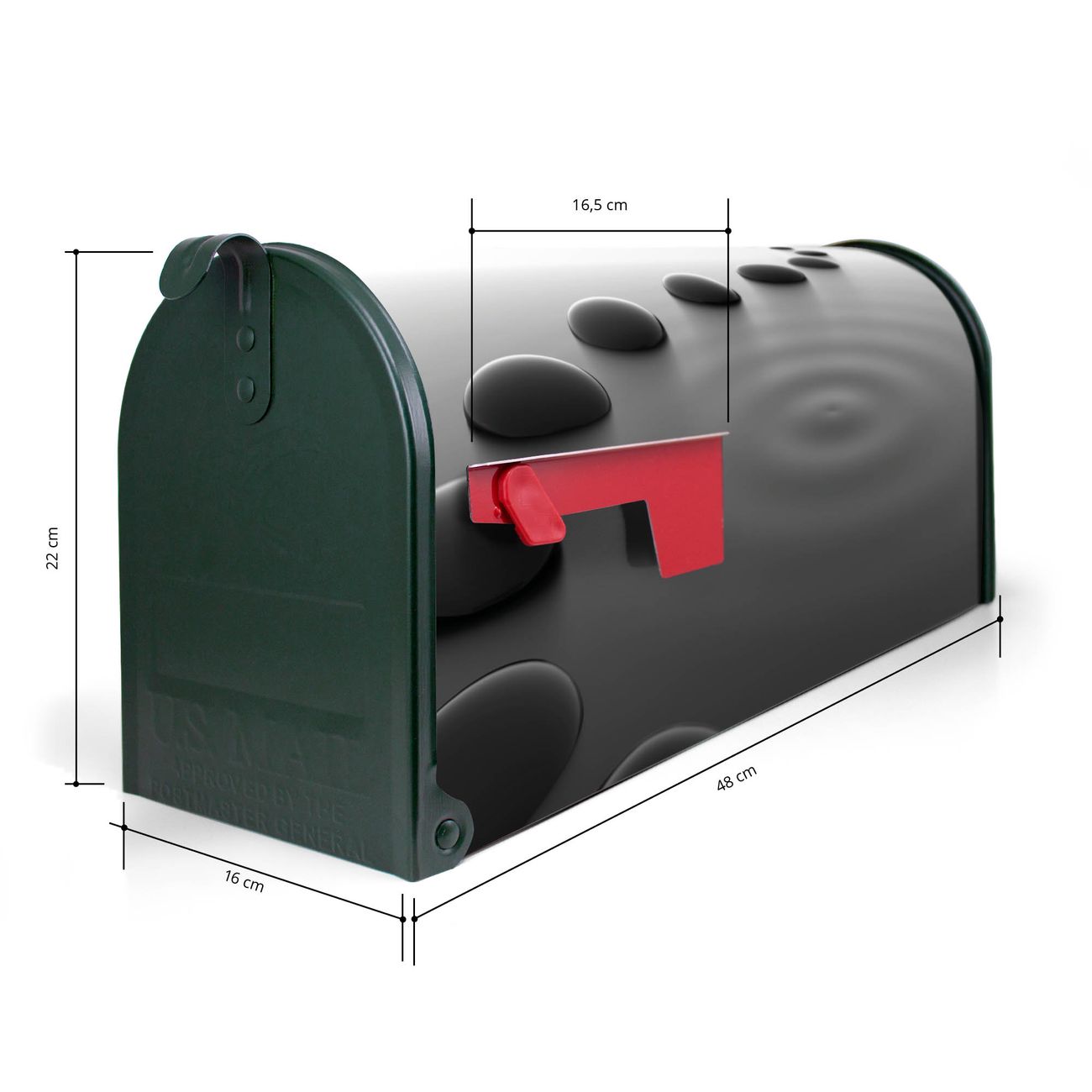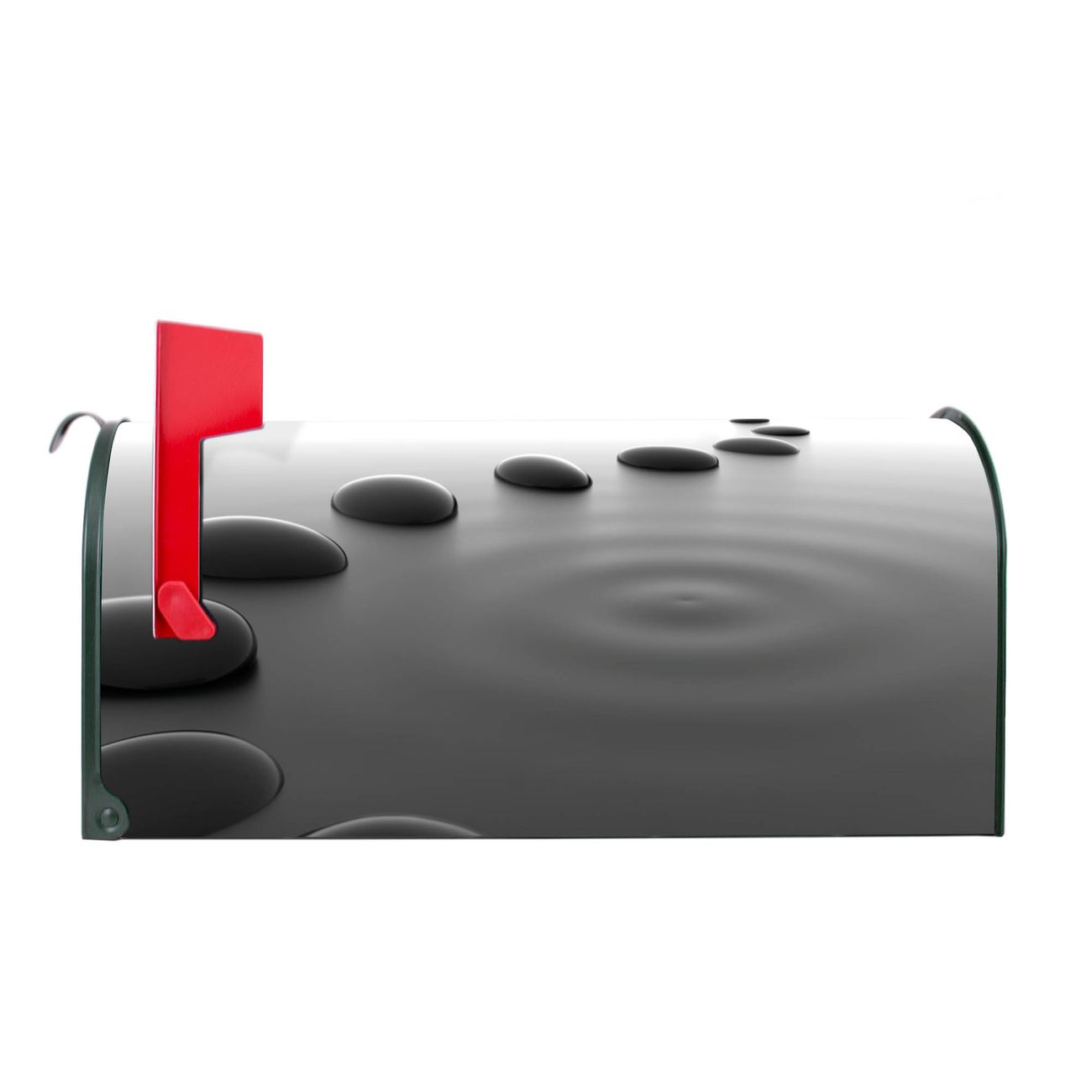 Unser amerikanischer Briefkasten mit dem Motiv Schwarze Steine hat ein sehr ansprechendes und ausgefallenes Design, ist in der Grundfarbe weiß, grün oder schwarz erhältlich. Damit entlocken Sie Ihren Nachbarn und dem Postboten immer wieder ein Lächeln. Die Mailbox ist ein Original Import aus Mississippi USA und wird von unserer kleinen Manufaktur in Sachsen von Hand veredelt. Die US-Mailbox bietet ausreichend Platz auch für große Sendungen, eine Fahne die Ihnen Post anzeigt, wetterfestes und äußerst stabiles Material - so macht Post empfangen Freude.
