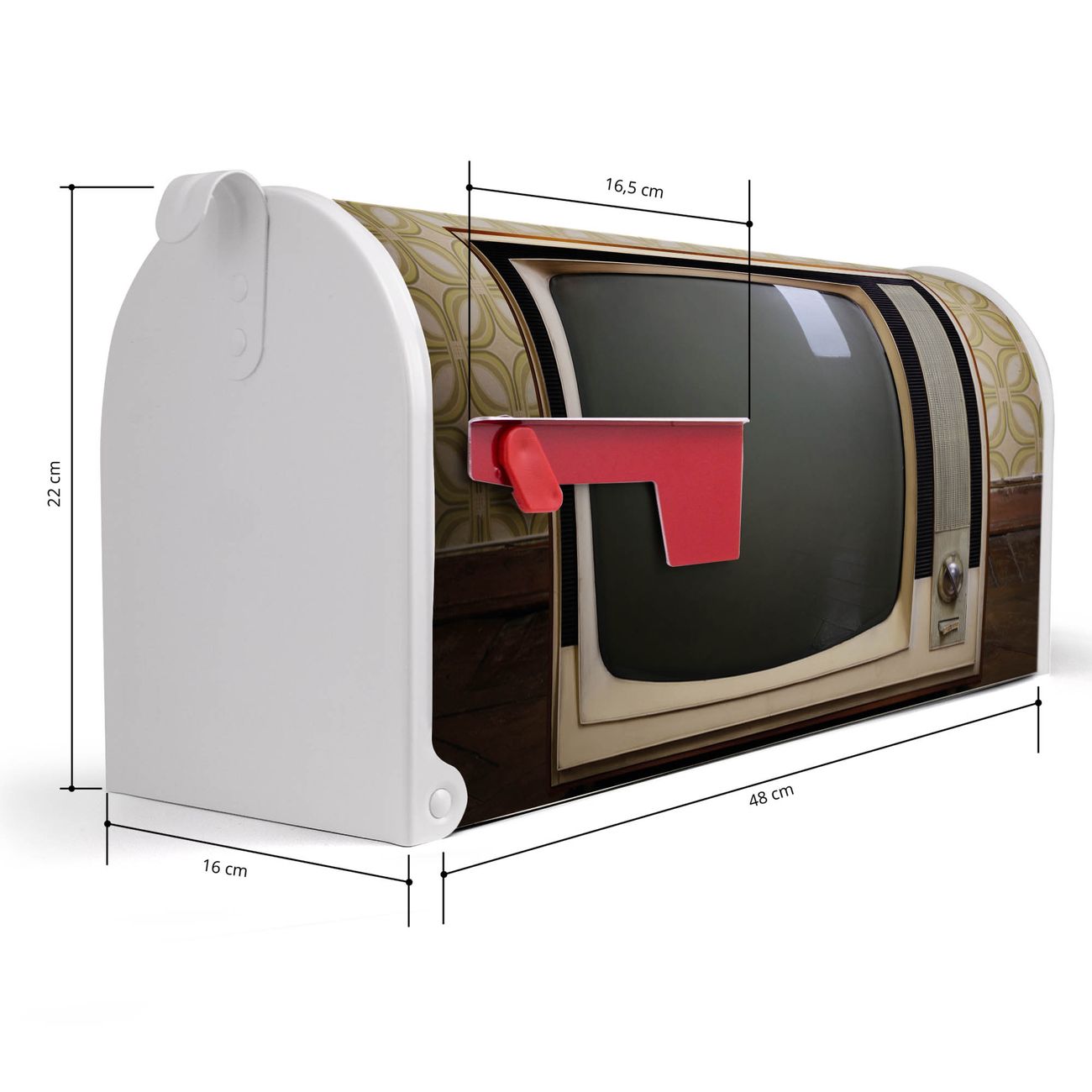 Der amerikanische Briefkasten von banjado mit Schwarzweiß TV Motiv bietet Ihnen ausreichend Fassungsvermögen, um große A4 Sendungen und Zeitschriften zu empfangen. Die typisch amerikanische rote Fahne zeigt Ihnen an, wenn Sie Post erhalten haben. Die US-Mailbox besteht aus verzinktem Stahlblech welches lackiert wurde und ist 48 x 22 x 16 CM (BxHxT) groß. Die Folie mit Motiv Schwarzweiß TV besteht aus einer wetter- und UV-resistenten Folie, die mit einem Schutzlaminat überzogen ist, sodass die US Mailbox zusätzlich vor Kratzern geschützt ist. An der Unterkante sind 4 Löcher je Seite um die Mailbox, typisch amerikanisch, an einem Holzpfahl oder einem Zaun zu befestigen. Auf Wunsch können Sie bei uns den passenden Standfuß oder die passende Wandhalterung kaufen um die US-Mailbox sicher zu befestigen. Wir bieten Ihnen ebenfalls Namensschilder, bereits beschriftet oder frei zu beschriften, und verschiedene selbst gestaltete Bitte-Keine-Werbung-Aufkleber.