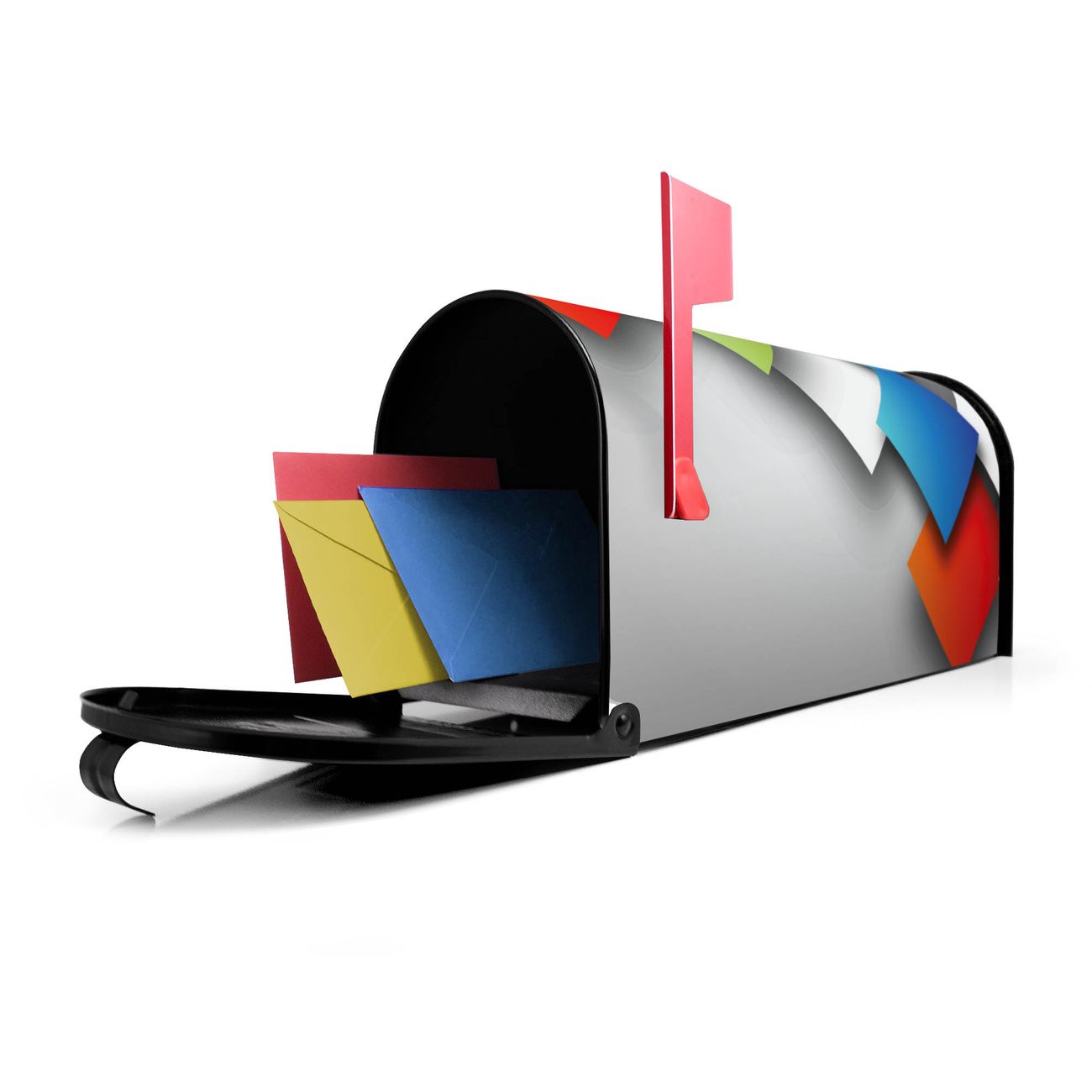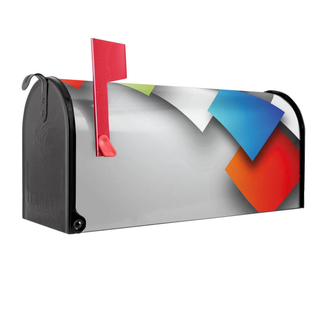 Der amerikanische Briefkasten von banjado mit Schwebende Quadrate Motiv bietet Ihnen ausreichend Fassungsvermögen, um große A4 Sendungen und Zeitschriften zu empfangen. Die typisch amerikanische rote Fahne zeigt Ihnen an, wenn Sie Post erhalten haben. Die US-Mailbox besteht aus verzinktem Stahlblech welches lackiert wurde und ist 48 x 22 x 16 CM (BxHxT) groß. Die Folie mit Motiv Schwebende Quadrate besteht aus einer wetter- und UV-resistenten Folie, die mit einem Schutzlaminat überzogen ist, sodass die US Mailbox zusätzlich vor Kratzern geschützt ist. An der Unterkante sind 4 Löcher je Seite um die Mailbox, typisch amerikanisch, an einem Holzpfahl oder einem Zaun zu befestigen. Auf Wunsch können Sie bei uns den passenden Standfuß oder die passende Wandhalterung kaufen um die US-Mailbox sicher zu befestigen. Wir bieten Ihnen ebenfalls Namensschilder, bereits beschriftet oder frei zu beschriften, und verschiedene selbst gestaltete Bitte-Keine-Werbung-Aufkleber.