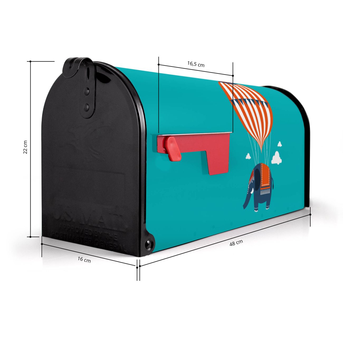 Der amerikanische Briefkasten von banjado mit Schwerelos Motiv bietet Ihnen ausreichend Fassungsvermögen, um große A4 Sendungen und Zeitschriften zu empfangen. Die typisch amerikanische rote Fahne zeigt Ihnen an, wenn Sie Post erhalten haben. Die US-Mailbox besteht aus verzinktem Stahlblech welches lackiert wurde und ist 48 x 22 x 16 CM (BxHxT) groß. Die Folie mit Motiv Schwerelos besteht aus einer wetter- und UV-resistenten Folie, die mit einem Schutzlaminat überzogen ist, sodass die US Mailbox zusätzlich vor Kratzern geschützt ist. An der Unterkante sind 4 Löcher je Seite um die Mailbox, typisch amerikanisch, an einem Holzpfahl oder einem Zaun zu befestigen. Auf Wunsch können Sie bei uns den passenden Standfuß oder die passende Wandhalterung kaufen um die US-Mailbox sicher zu befestigen. Wir bieten Ihnen ebenfalls Namensschilder, bereits beschriftet oder frei zu beschriften, und verschiedene selbst gestaltete Bitte-Keine-Werbung-Aufkleber.