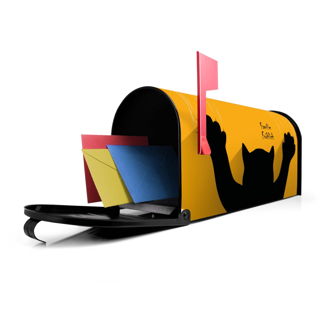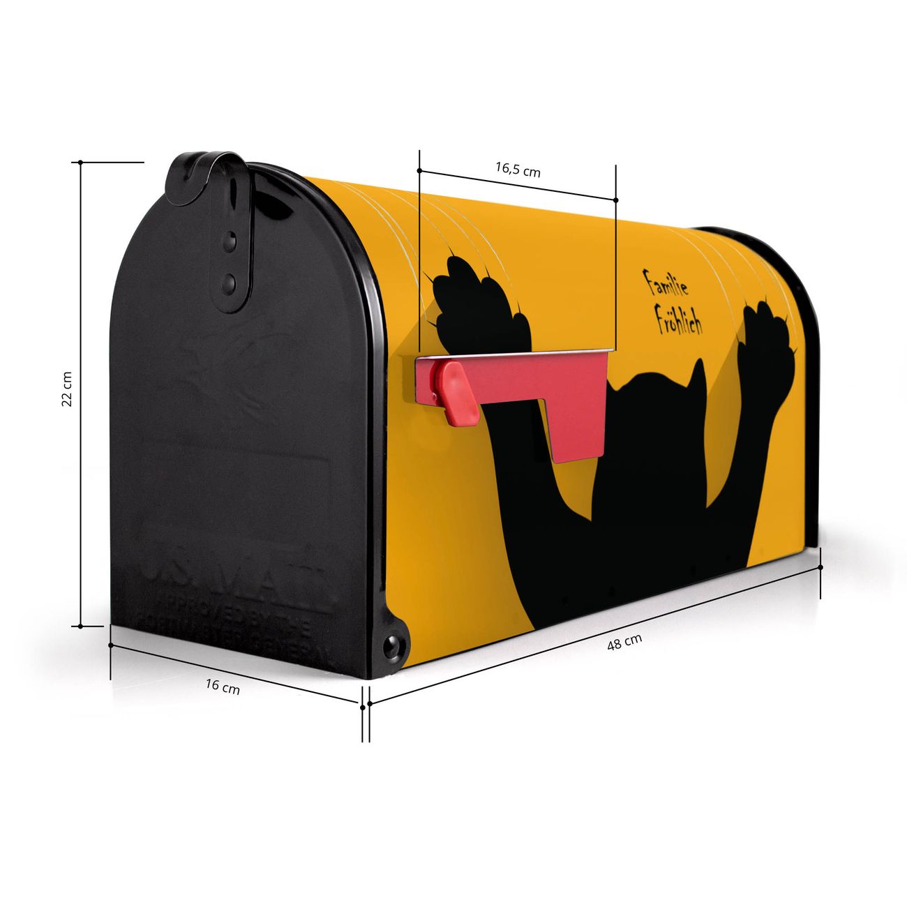 Der amerikanische Briefkasten von banjado mit Scratch Motiv bietet Ihnen ausreichend Fassungsvermögen, um große A4 Sendungen und Zeitschriften zu empfangen. Die typisch amerikanische rote Fahne zeigt Ihnen an, wenn Sie Post erhalten haben. Die US-Mailbox besteht aus verzinktem Stahlblech welches lackiert wurde und ist 48 x 22 x 16 CM (BxHxT) groß. Die Folie mit Motiv Scratch besteht aus einer wetter- und UV-resistenten Folie, die mit einem Schutzlaminat überzogen ist, sodass die US Mailbox zusätzlich vor Kratzern geschützt ist. An der Unterkante sind 4 Löcher je Seite um die Mailbox, typisch amerikanisch, an einem Holzpfahl oder einem Zaun zu befestigen. Auf Wunsch können Sie bei uns den passenden Standfuß oder die passende Wandhalterung kaufen um die US-Mailbox sicher zu befestigen. Wir bieten Ihnen ebenfalls Namensschilder, bereits beschriftet oder frei zu beschriften, und verschiedene selbst gestaltete Bitte-Keine-Werbung-Aufkleber.