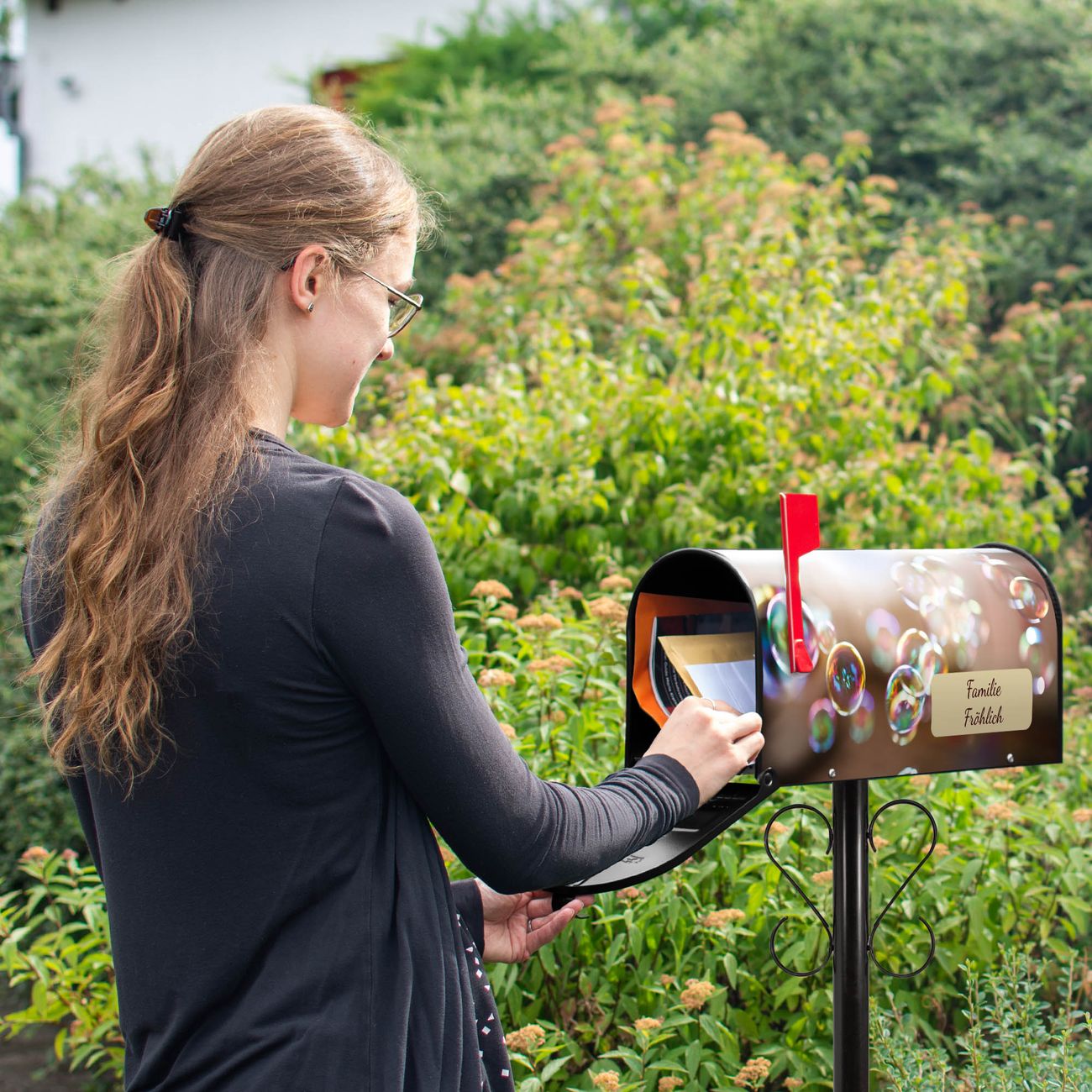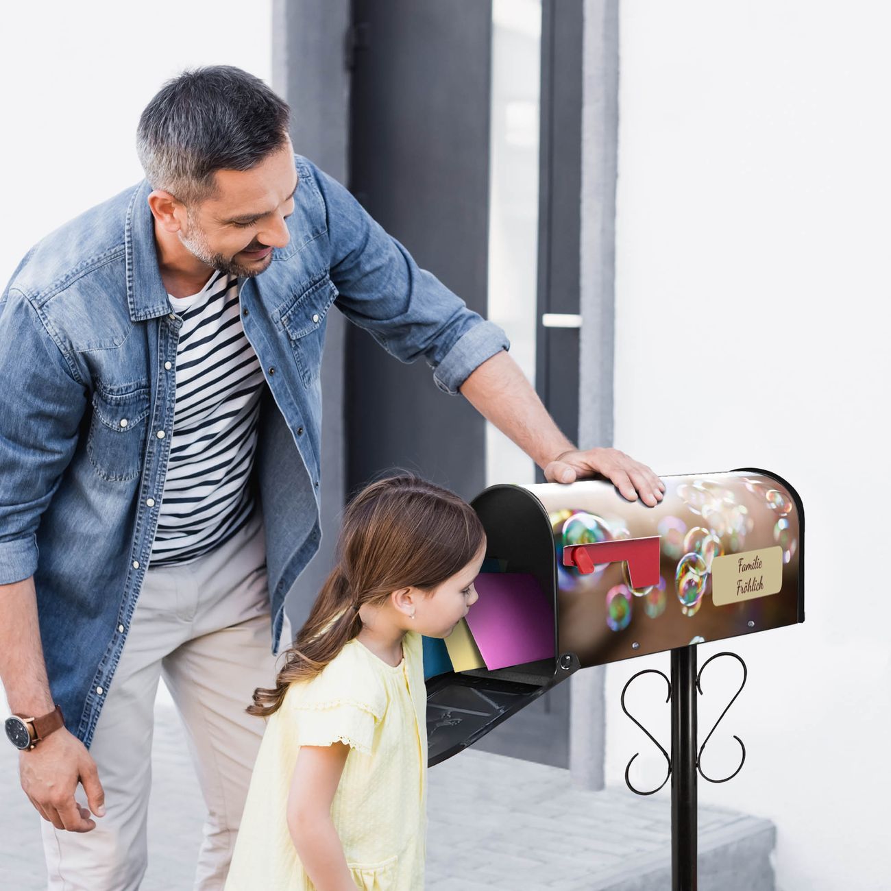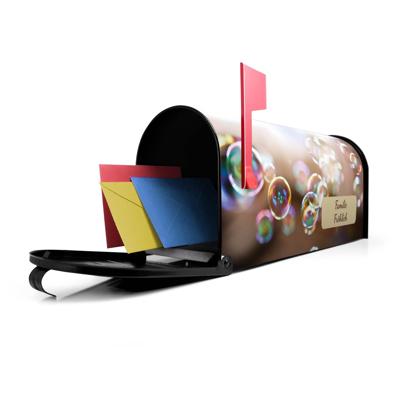Der amerikanische Briefkasten von banjado mit Seifenblasen Motiv bietet Ihnen ausreichend Fassungsvermögen, um große A4 Sendungen und Zeitschriften zu empfangen. Die typisch amerikanische rote Fahne zeigt Ihnen an, wenn Sie Post erhalten haben. Die US-Mailbox besteht aus verzinktem Stahlblech welches lackiert wurde und ist 48 x 22 x 16 CM (BxHxT) groß. Die Folie mit Motiv Seifenblasen besteht aus einer wetter- und UV-resistenten Folie, die mit einem Schutzlaminat überzogen ist, sodass die US Mailbox zusätzlich vor Kratzern geschützt ist. An der Unterkante sind 4 Löcher je Seite um die Mailbox, typisch amerikanisch, an einem Holzpfahl oder einem Zaun zu befestigen. Auf Wunsch können Sie bei uns den passenden Standfuß oder die passende Wandhalterung kaufen um die US-Mailbox sicher zu befestigen. Wir bieten Ihnen ebenfalls Namensschilder, bereits beschriftet oder frei zu beschriften, und verschiedene selbst gestaltete Bitte-Keine-Werbung-Aufkleber.