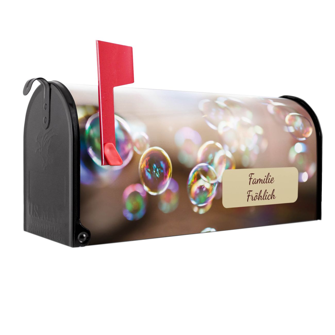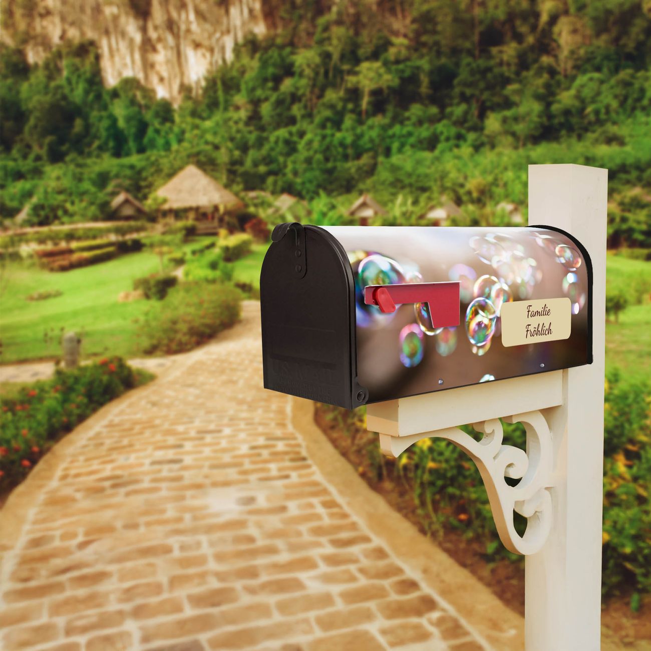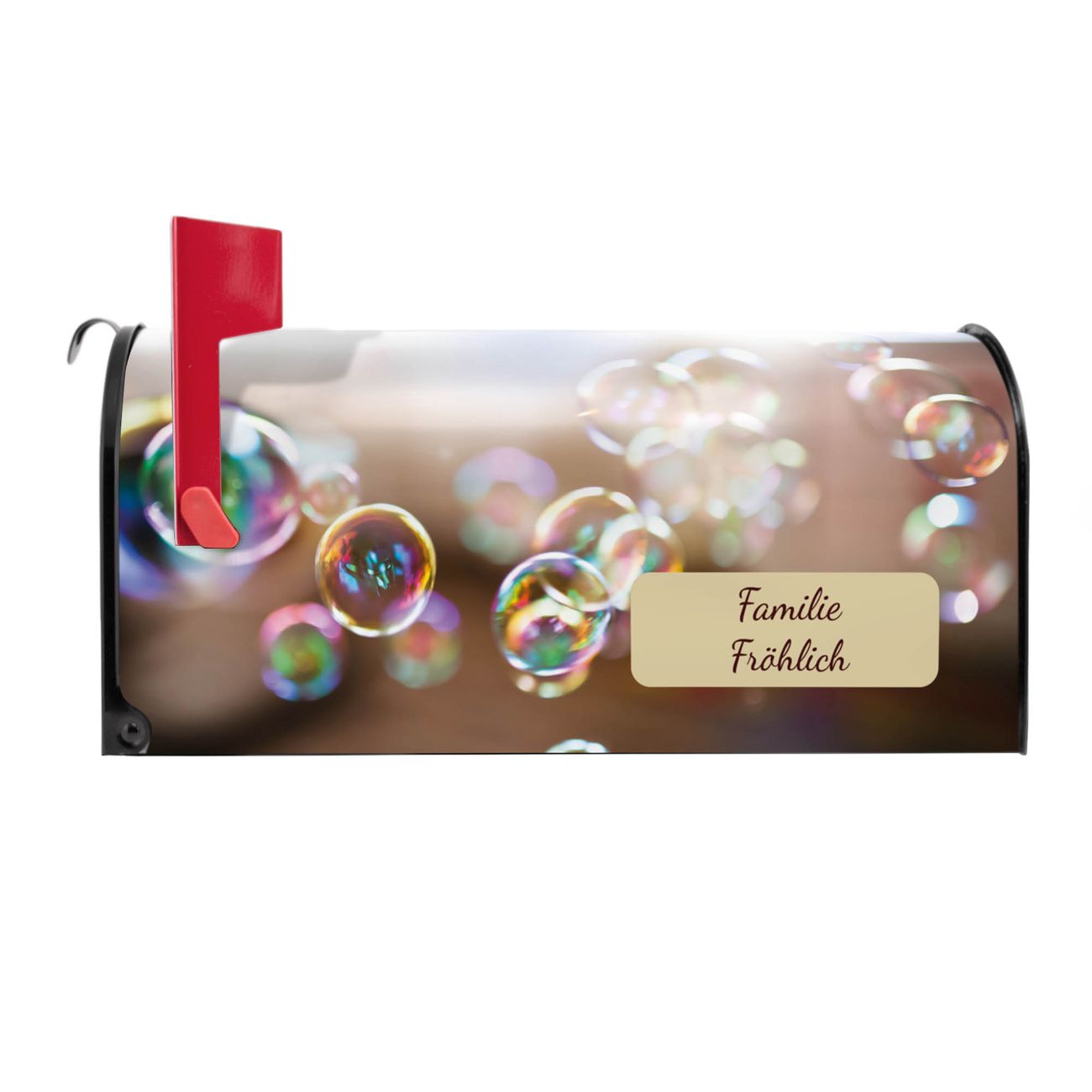 Der amerikanische Briefkasten von banjado mit Seifenblasen Motiv bietet Ihnen ausreichend Fassungsvermögen, um große A4 Sendungen und Zeitschriften zu empfangen. Die typisch amerikanische rote Fahne zeigt Ihnen an, wenn Sie Post erhalten haben. Die US-Mailbox besteht aus verzinktem Stahlblech welches lackiert wurde und ist 48 x 22 x 16 CM (BxHxT) groß. Die Folie mit Motiv Seifenblasen besteht aus einer wetter- und UV-resistenten Folie, die mit einem Schutzlaminat überzogen ist, sodass die US Mailbox zusätzlich vor Kratzern geschützt ist. An der Unterkante sind 4 Löcher je Seite um die Mailbox, typisch amerikanisch, an einem Holzpfahl oder einem Zaun zu befestigen. Auf Wunsch können Sie bei uns den passenden Standfuß oder die passende Wandhalterung kaufen um die US-Mailbox sicher zu befestigen. Wir bieten Ihnen ebenfalls Namensschilder, bereits beschriftet oder frei zu beschriften, und verschiedene selbst gestaltete Bitte-Keine-Werbung-Aufkleber.