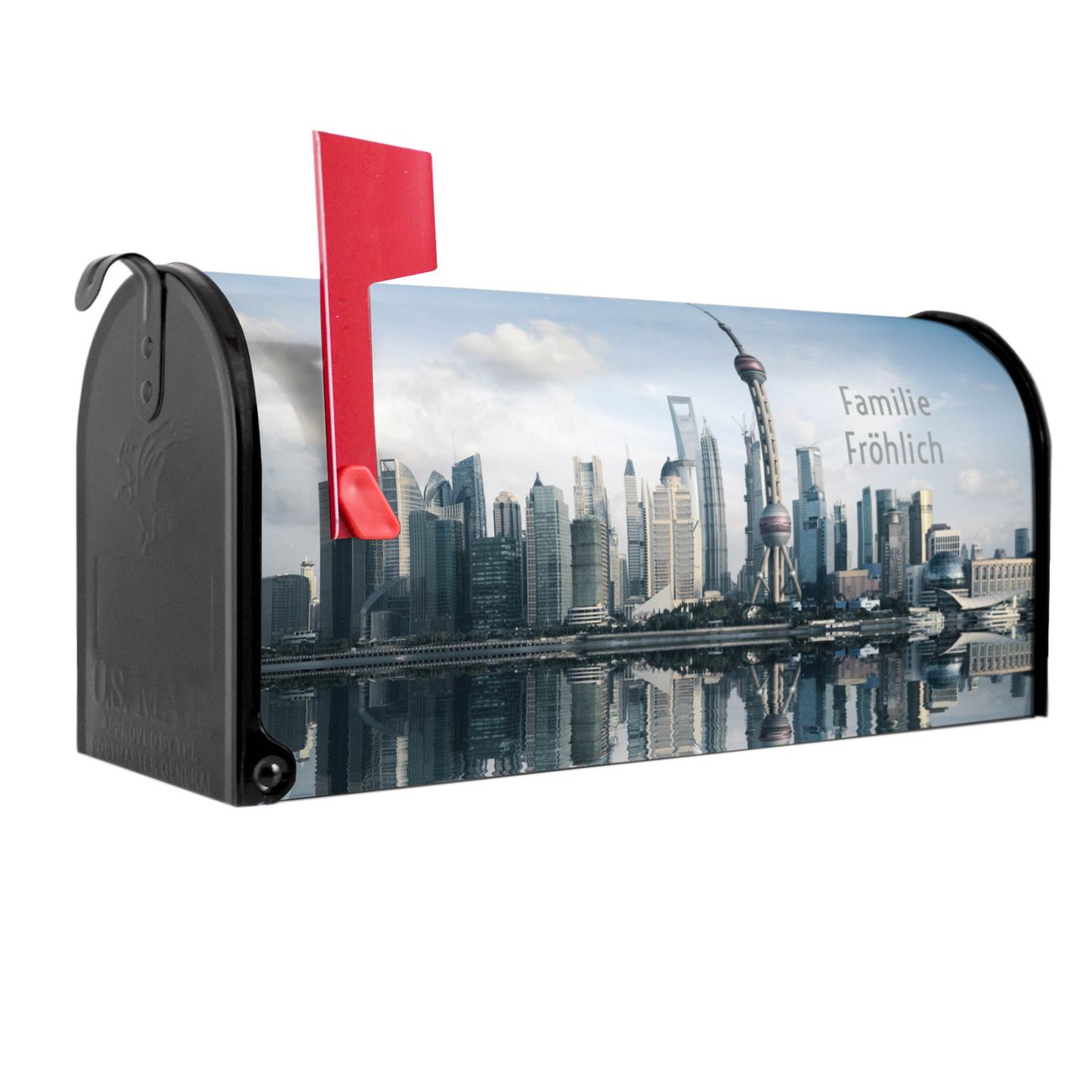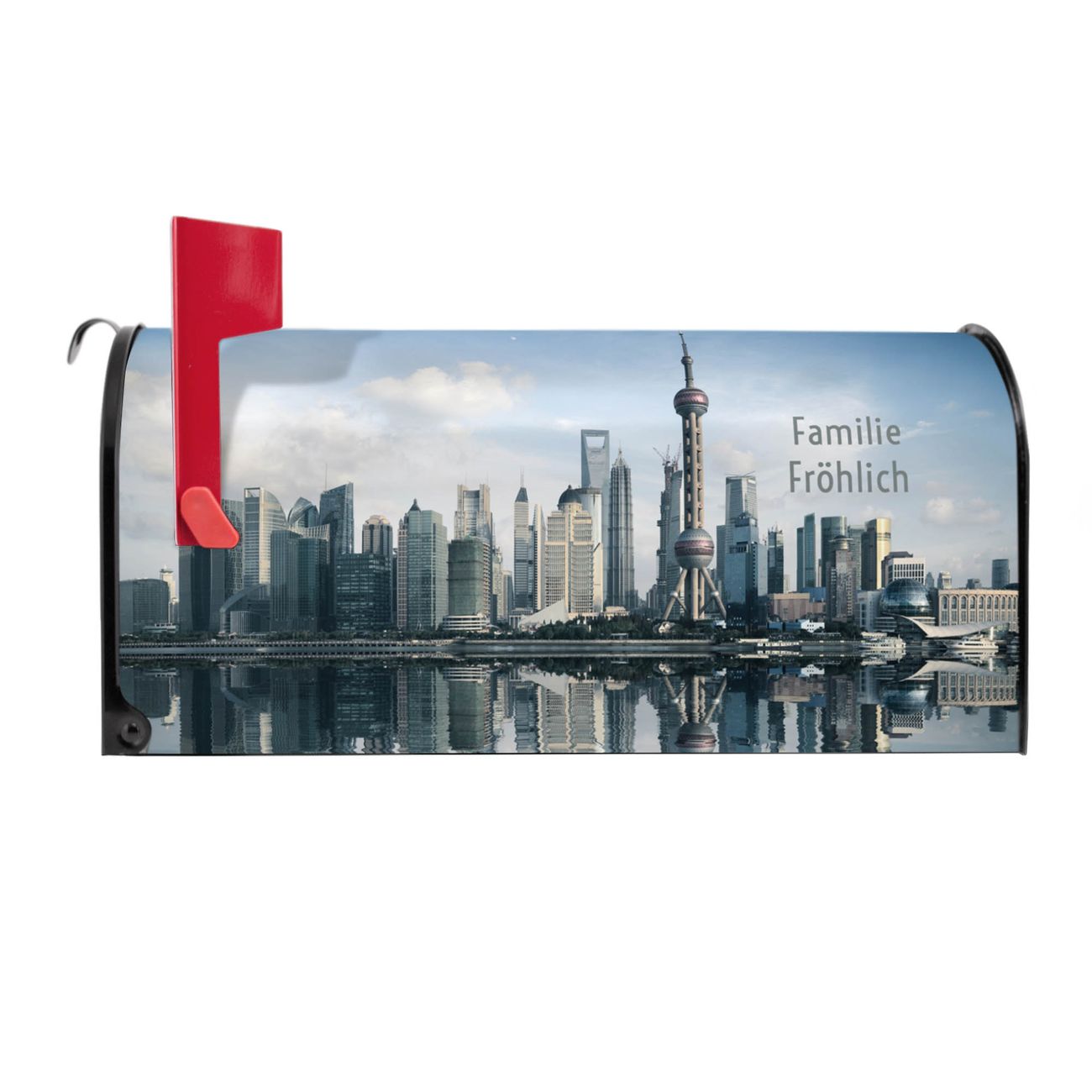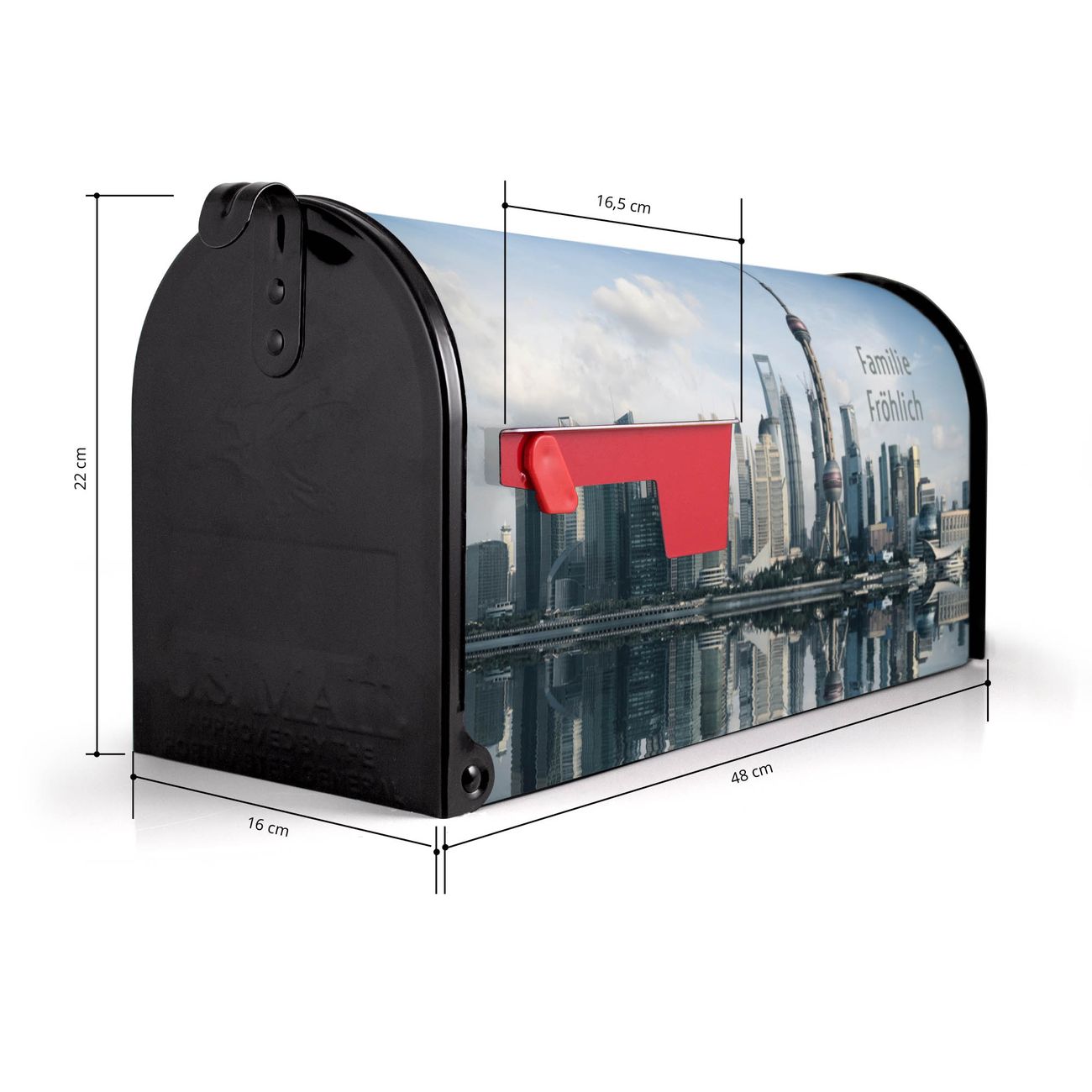 Der amerikanische Briefkasten von banjado mit Shanghai Motiv bietet Ihnen ausreichend Fassungsvermögen, um große A4 Sendungen und Zeitschriften zu empfangen. Die typisch amerikanische rote Fahne zeigt Ihnen an, wenn Sie Post erhalten haben. Die US-Mailbox besteht aus verzinktem Stahlblech welches lackiert wurde und ist 48 x 22 x 16 CM (BxHxT) groß. Die Folie mit Motiv Shanghai besteht aus einer wetter- und UV-resistenten Folie, die mit einem Schutzlaminat überzogen ist, sodass die US Mailbox zusätzlich vor Kratzern geschützt ist. An der Unterkante sind 4 Löcher je Seite um die Mailbox, typisch amerikanisch, an einem Holzpfahl oder einem Zaun zu befestigen. Auf Wunsch können Sie bei uns den passenden Standfuß oder die passende Wandhalterung kaufen um die US-Mailbox sicher zu befestigen. Wir bieten Ihnen ebenfalls Namensschilder, bereits beschriftet oder frei zu beschriften, und verschiedene selbst gestaltete Bitte-Keine-Werbung-Aufkleber.